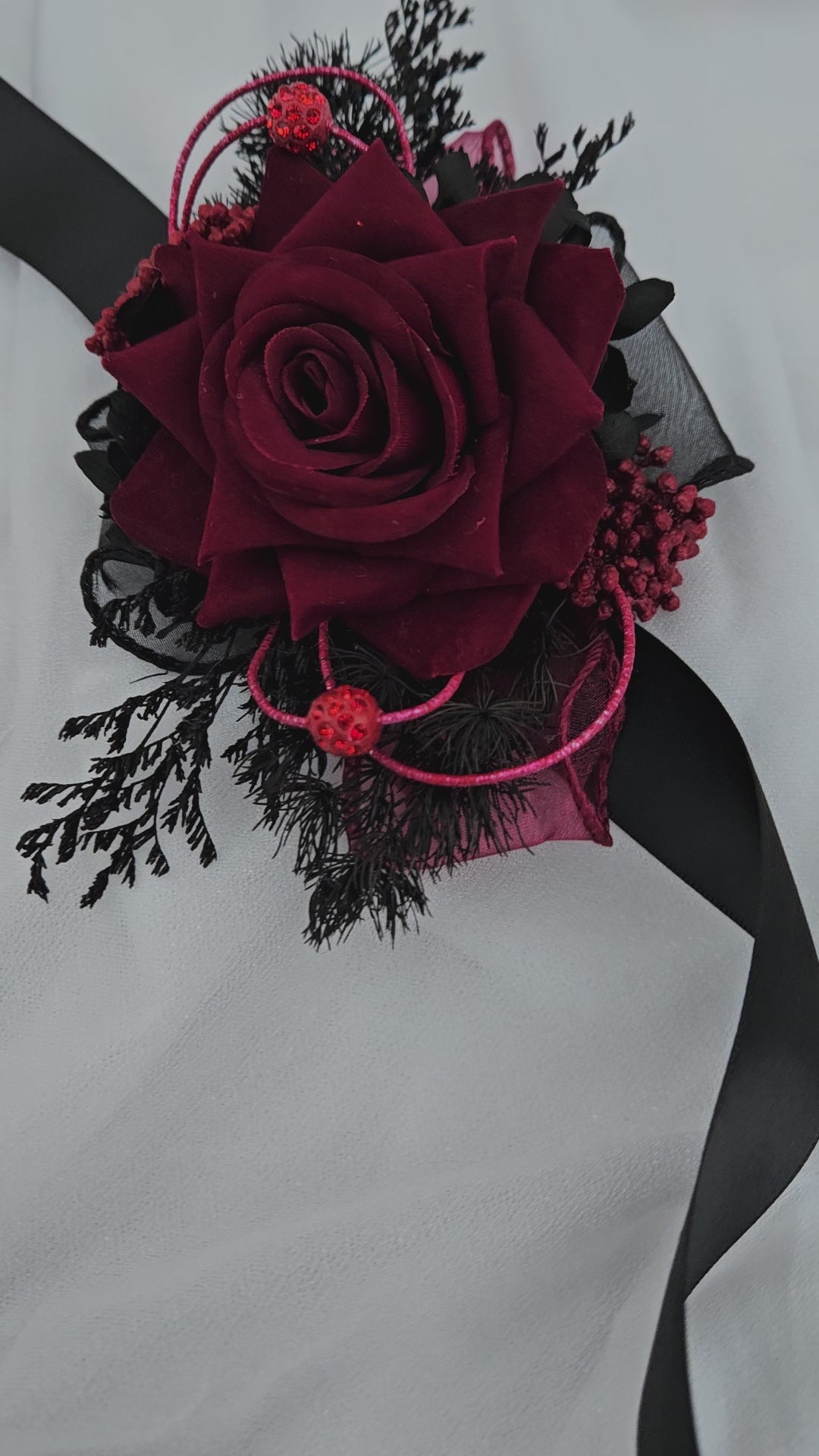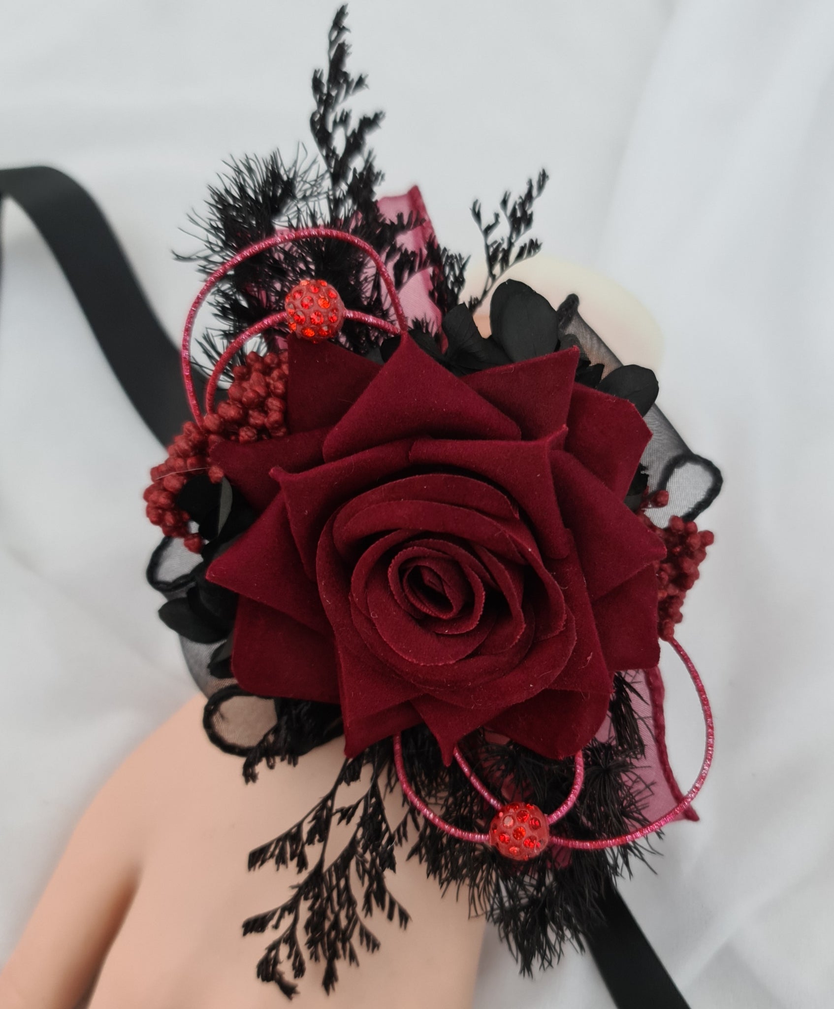 Burgundy & back everlasting flowers corsage w crystals – school formal, prom, graduation, wedding