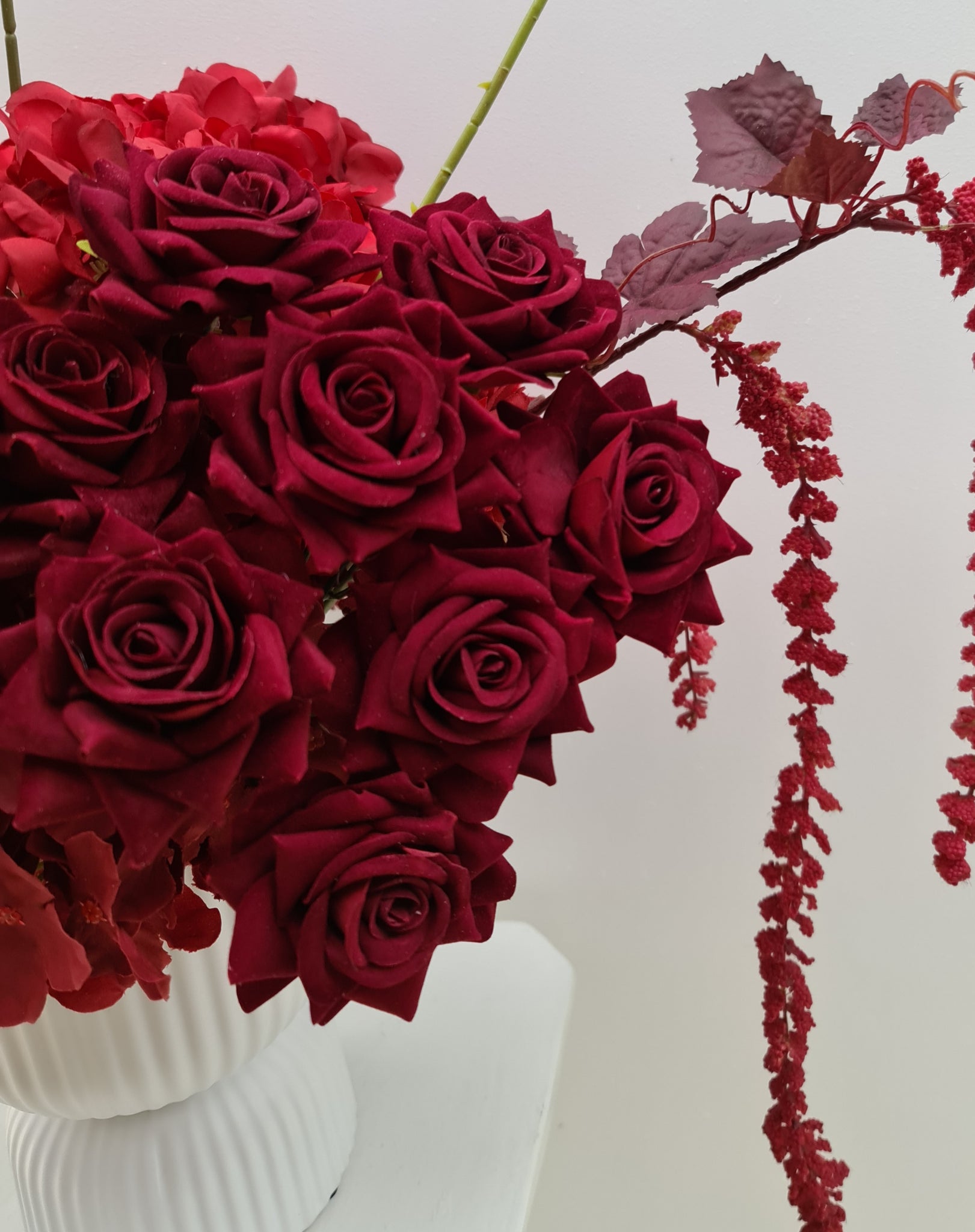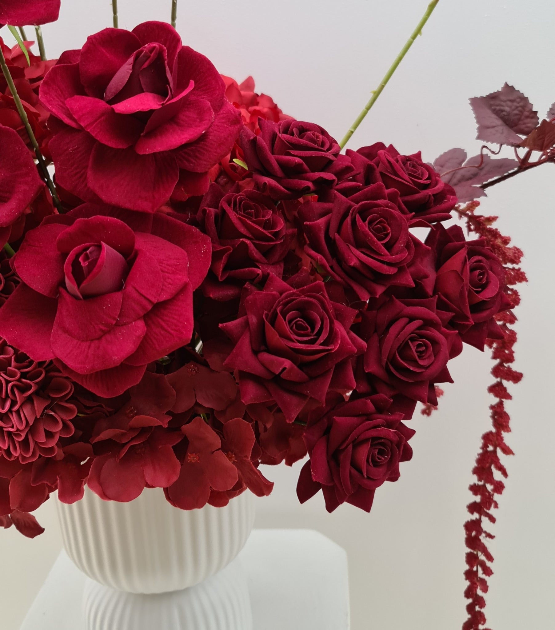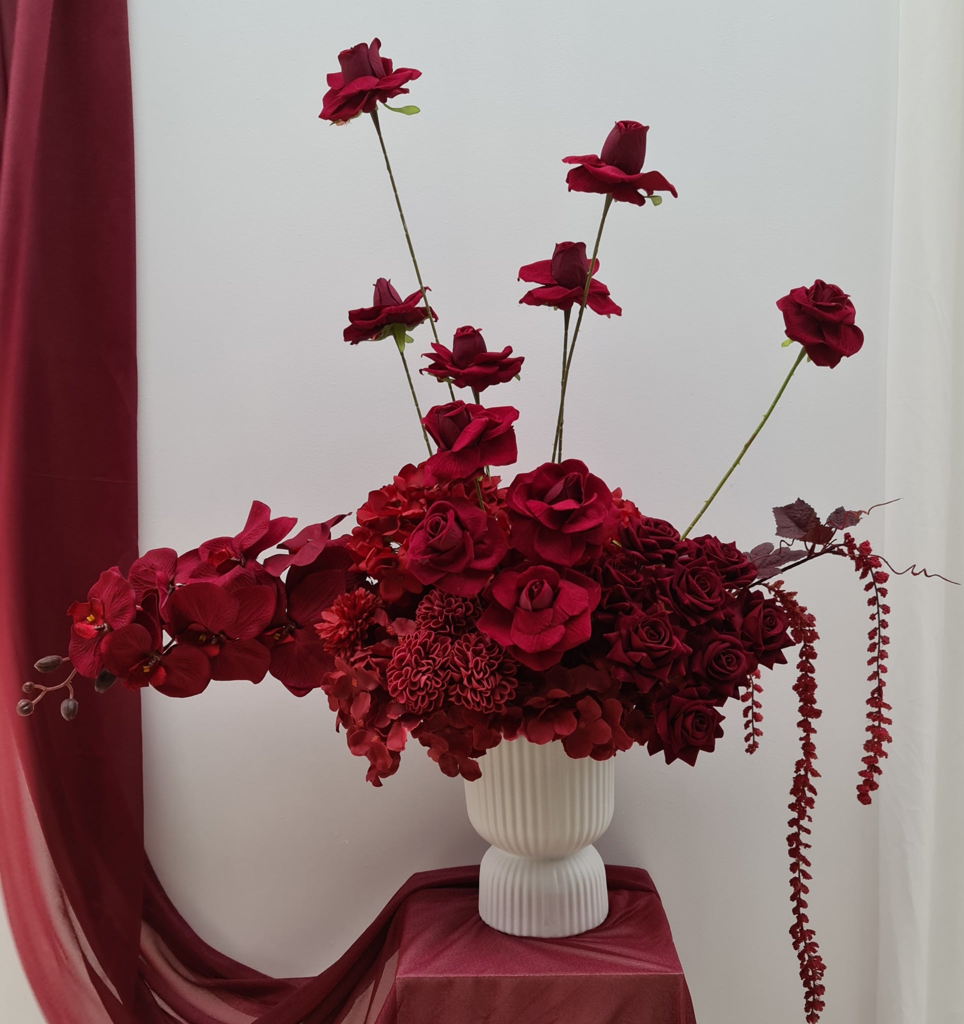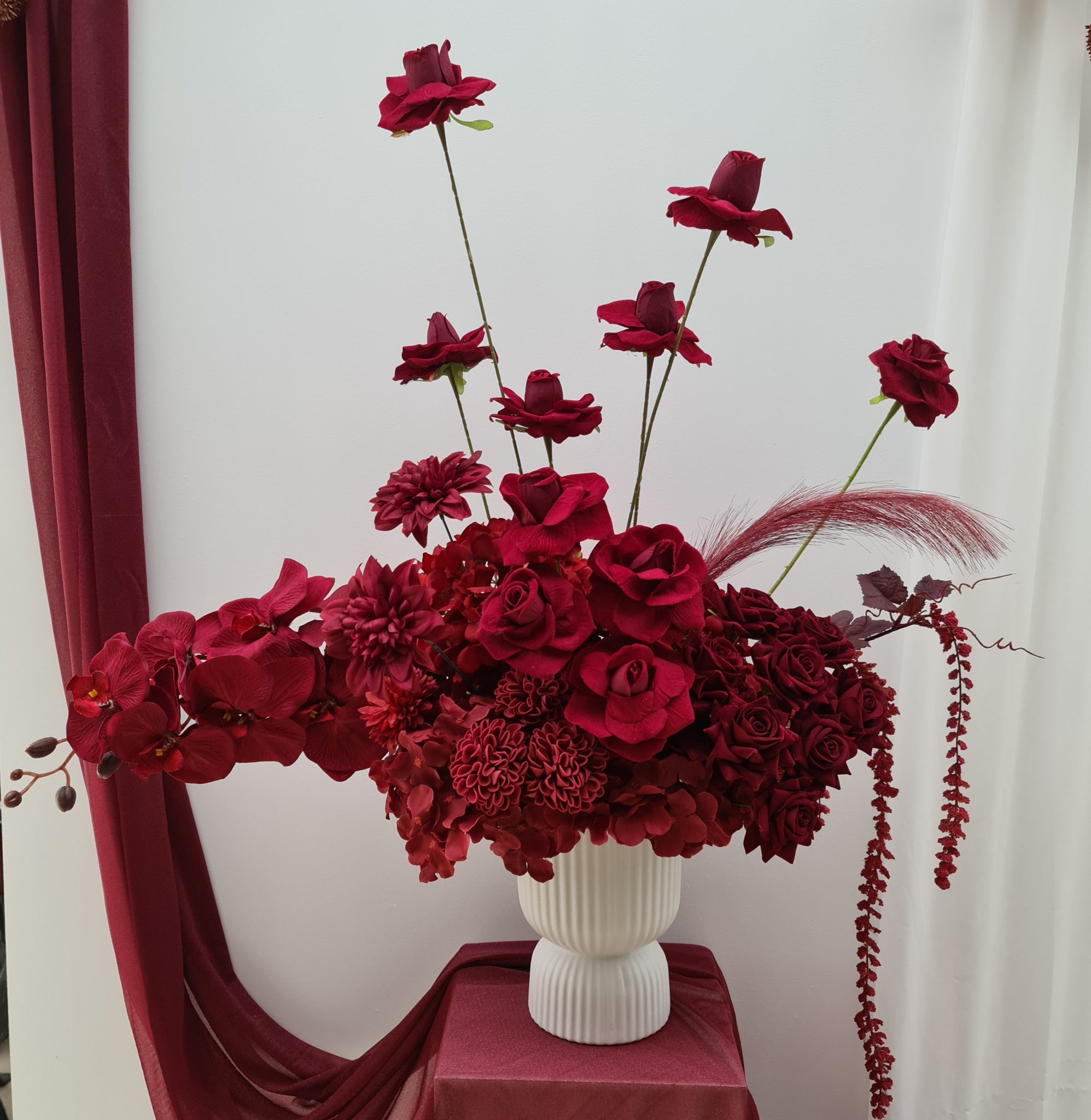 Burgundy flowers in white ribbed egg pot. Can be placed on plinth, at the front of plinth (cake stand) or at the front of backdrop