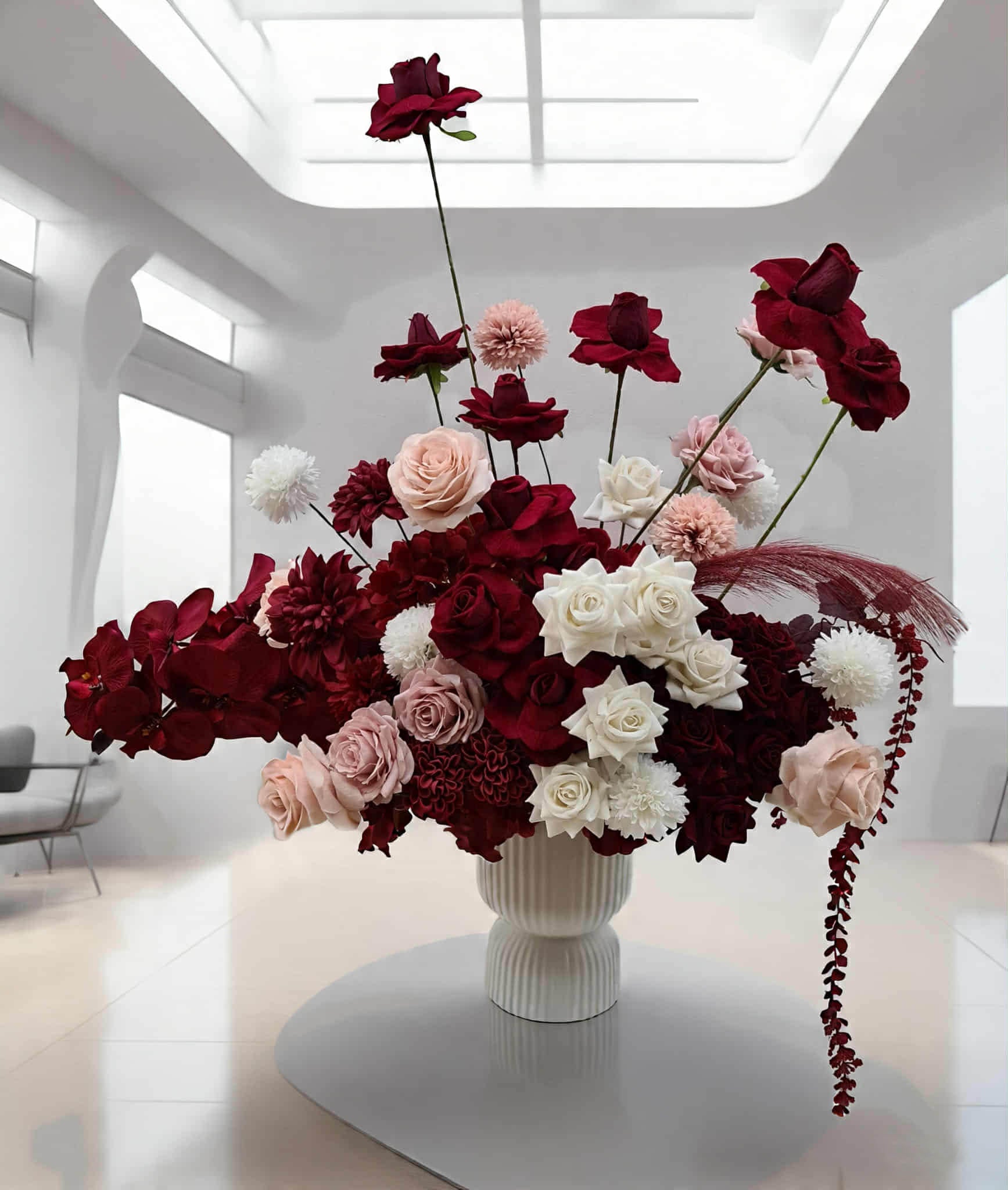 Burgundy, pink & white floor / plinth flowers in white ribbed pot