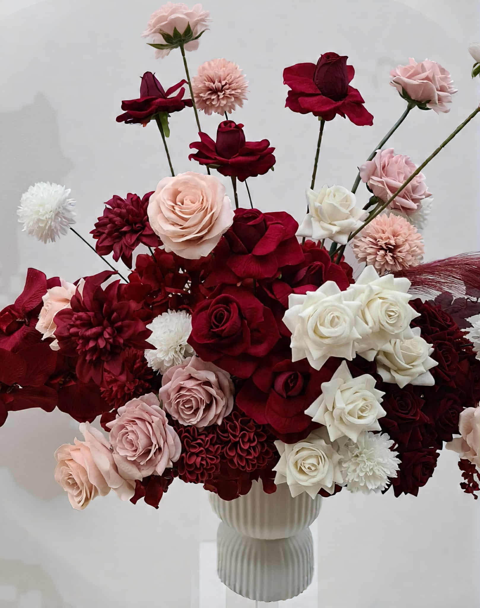 Burgundy, pink & white flowers in white ribbed egg pot. Can be placed on plinth, at the front of plinth (cake stand) or at the front of backdrop