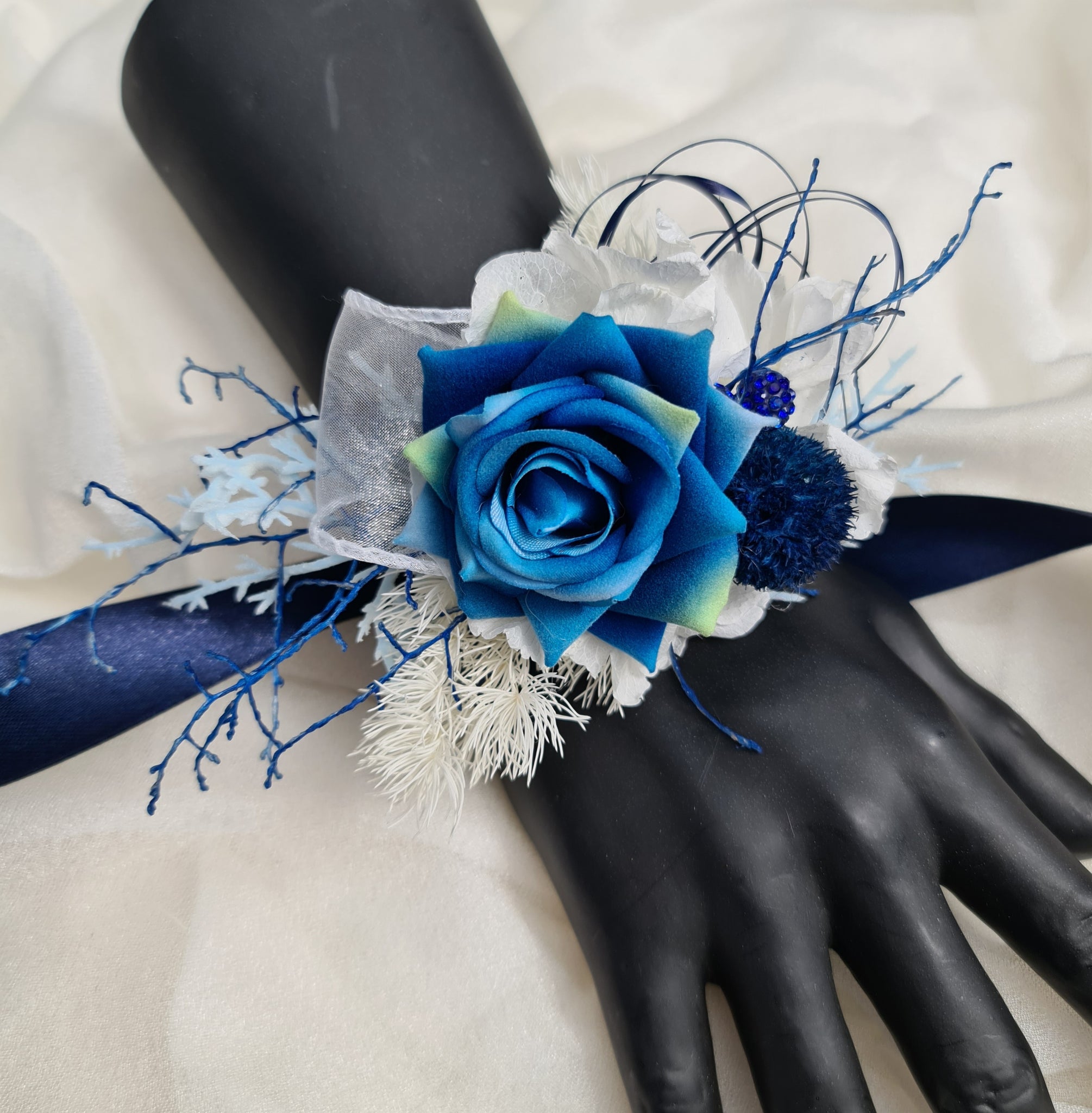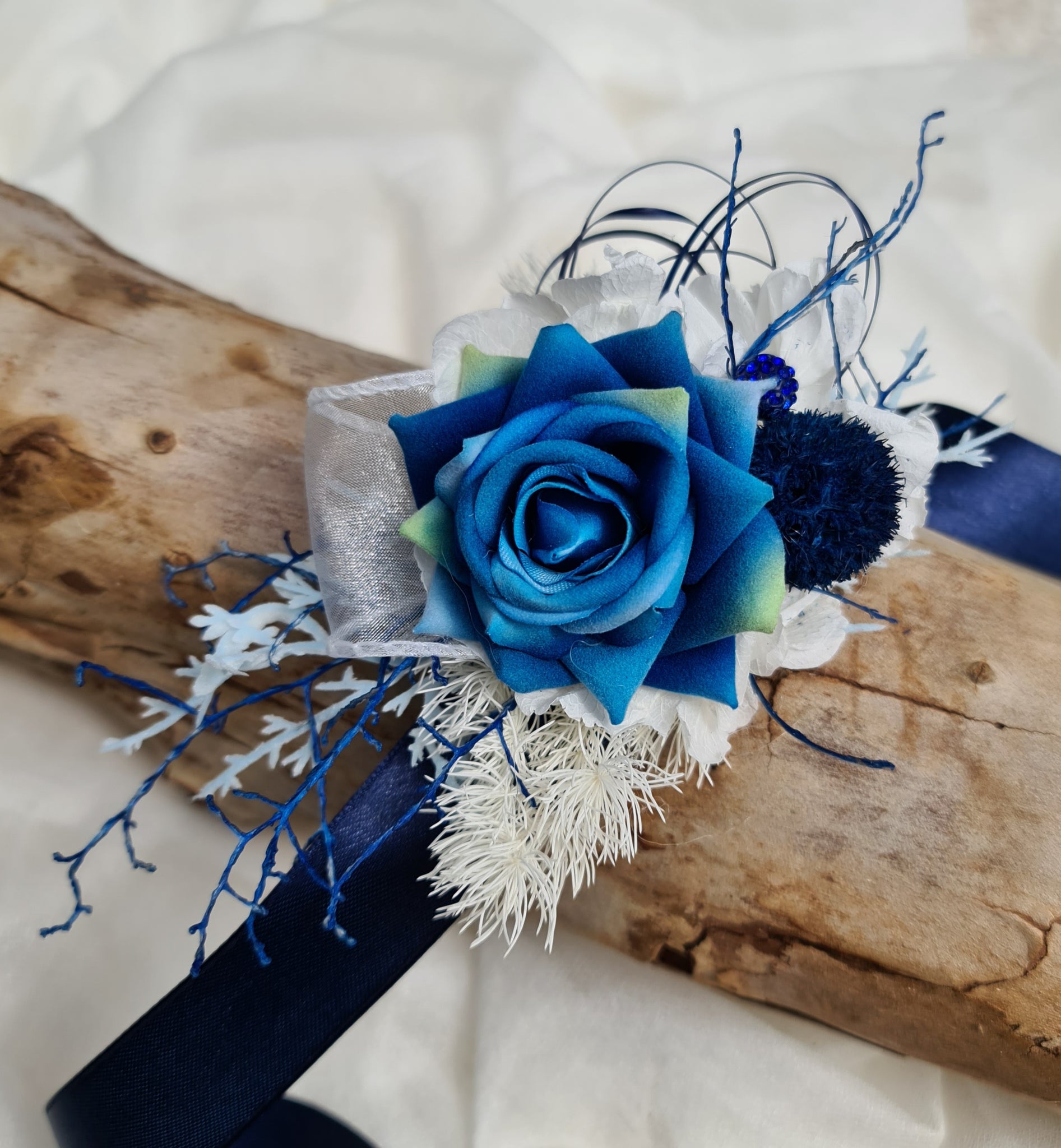 Dark Blue & green corsage combination of silk and preserved flowers with blue crystals