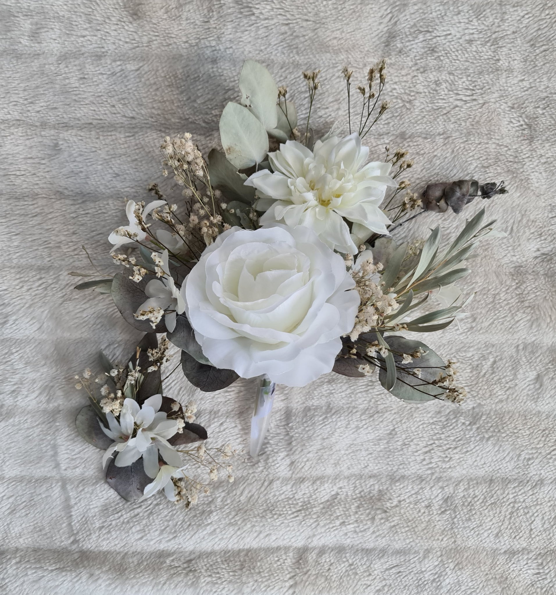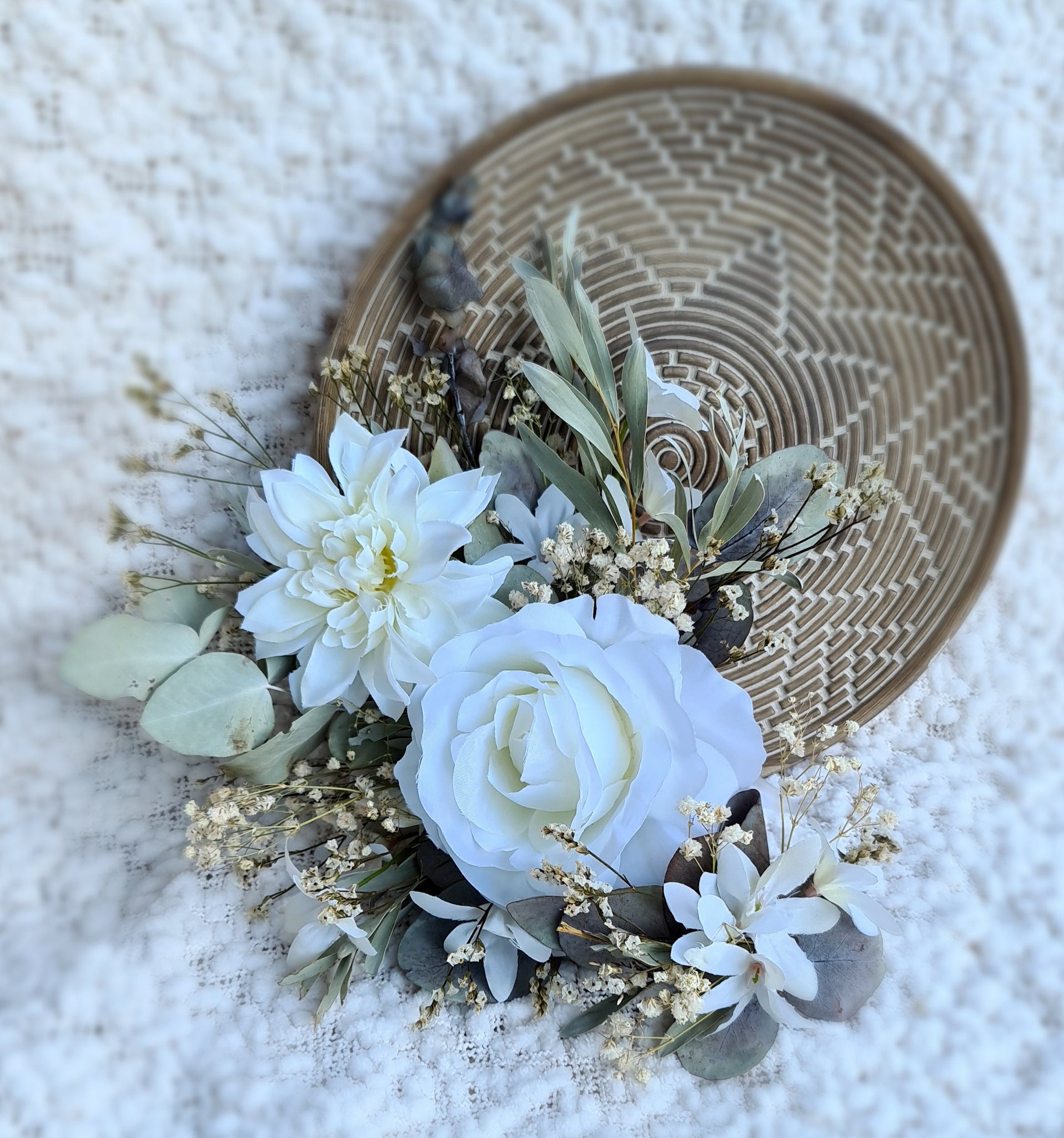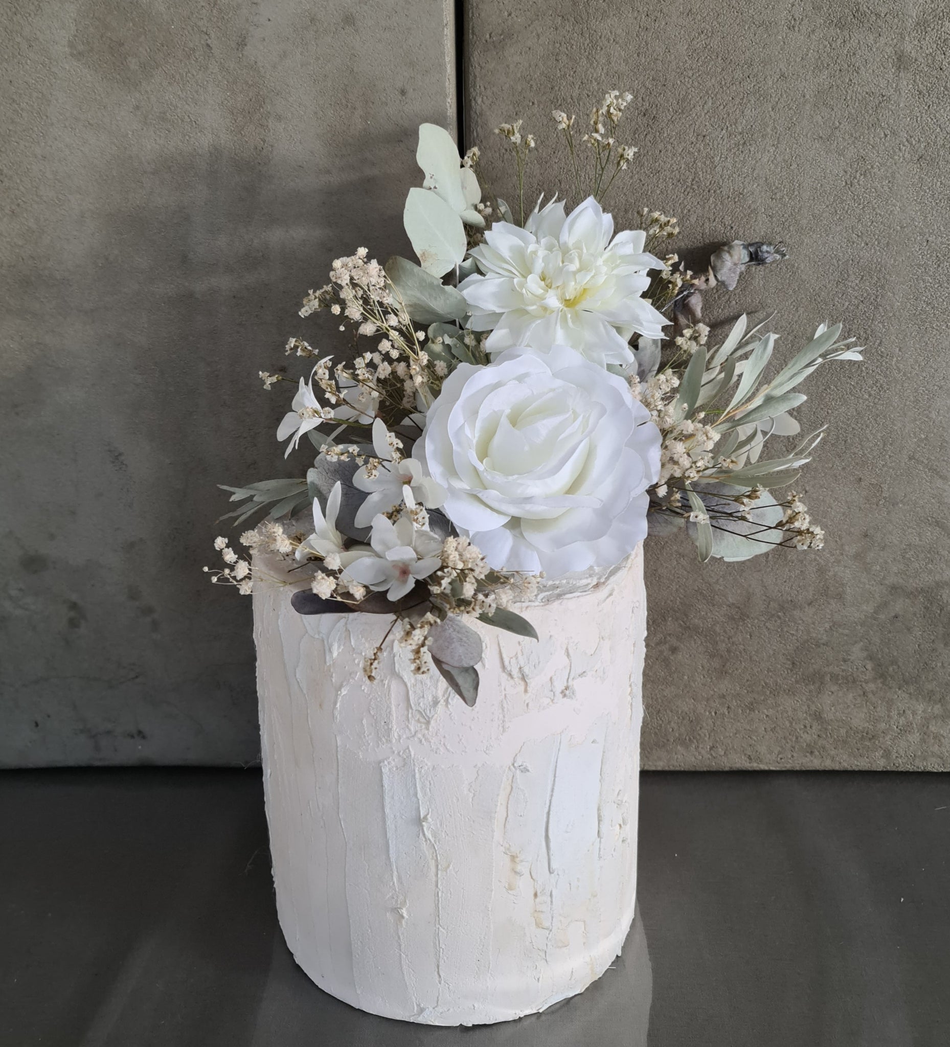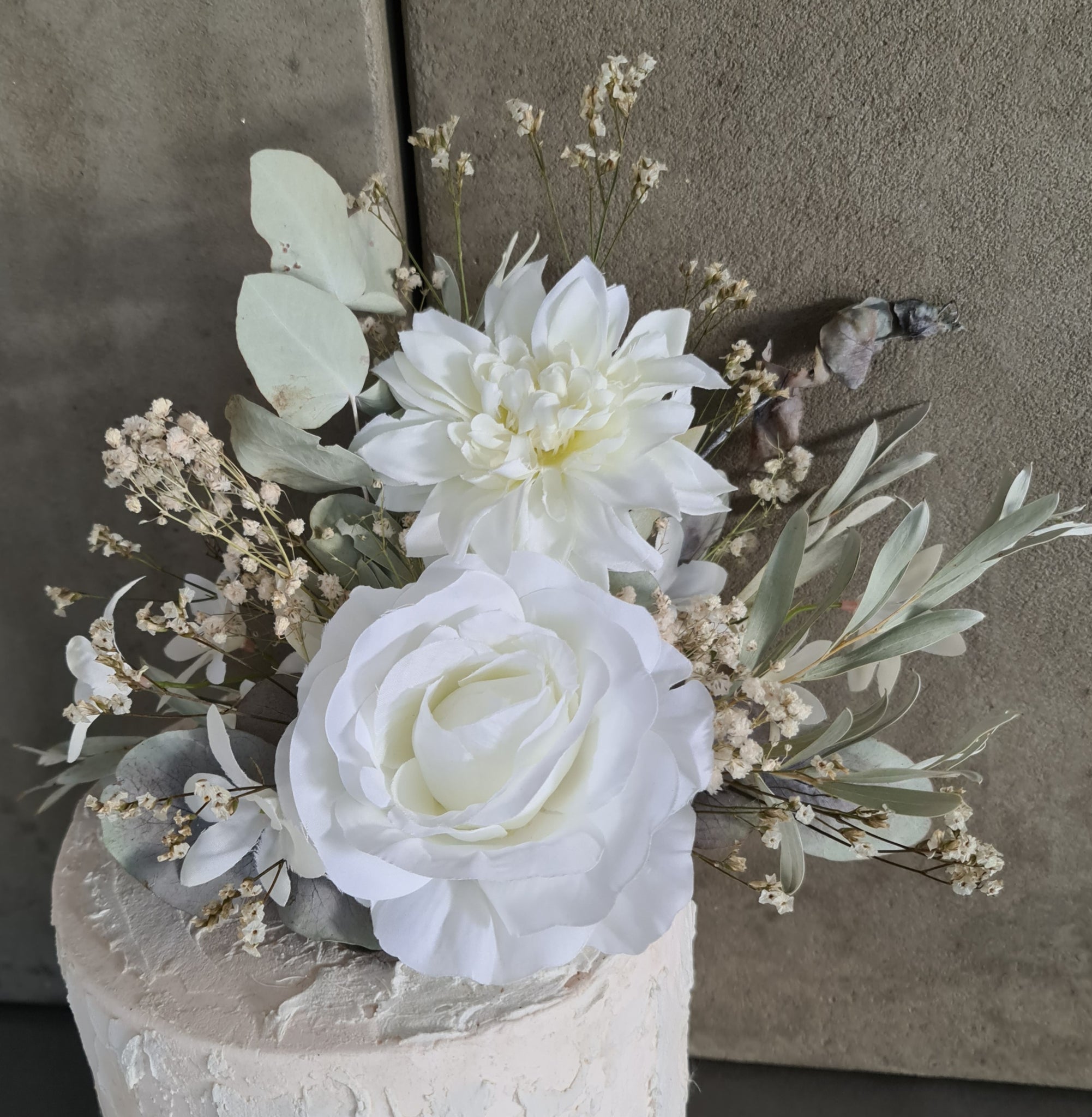 Double cake topper, combination of silk & preserved flowers with dry eucalyptus