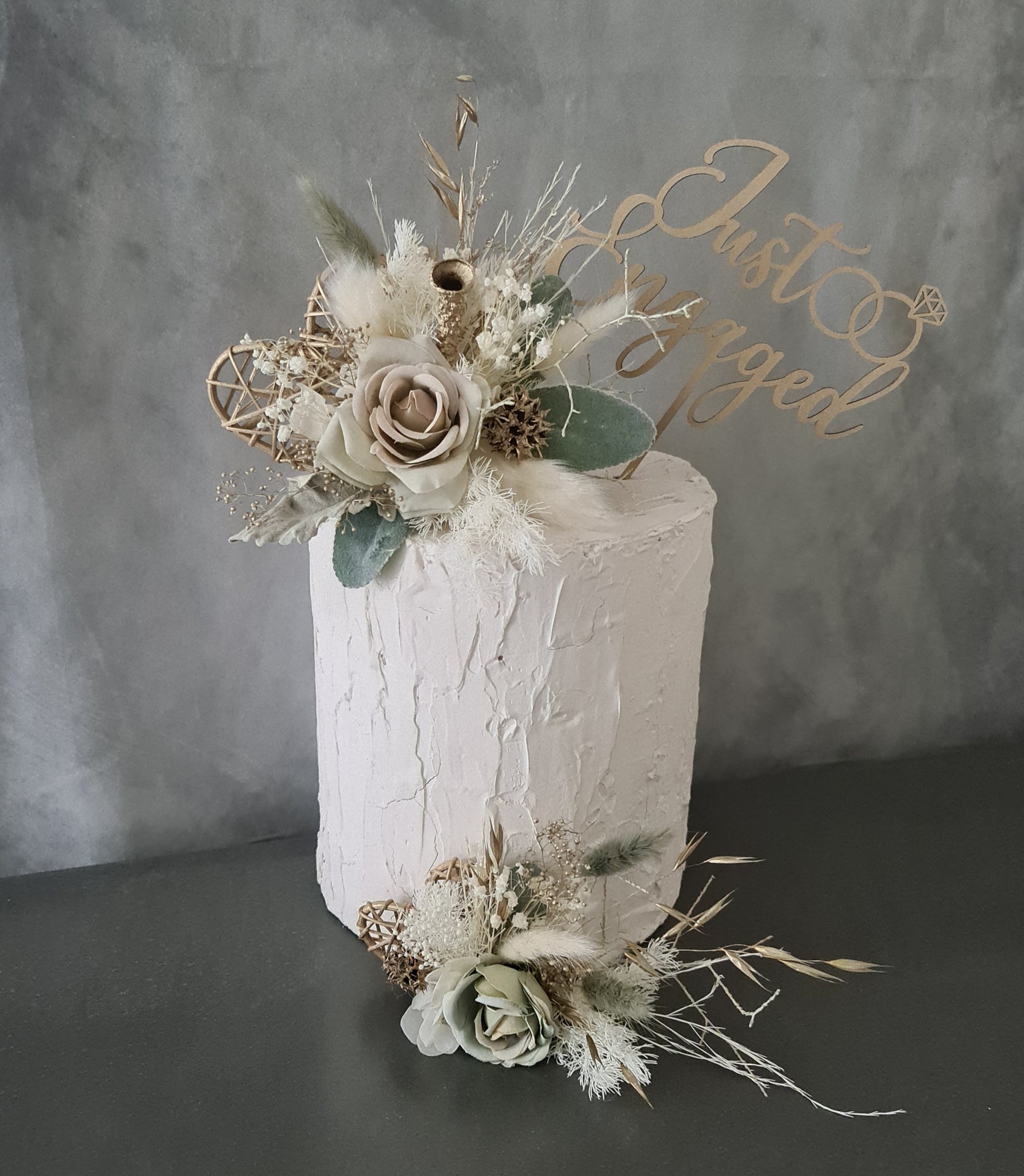 Cake topper - Combination of silk, preserved and dry flowers with double rattan love hearts in champagne gold
