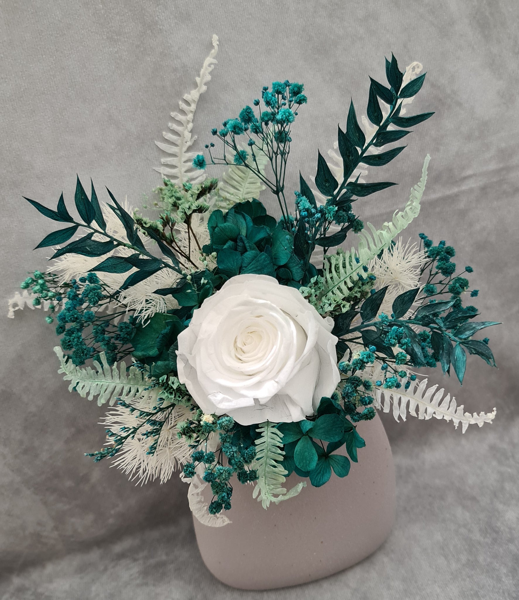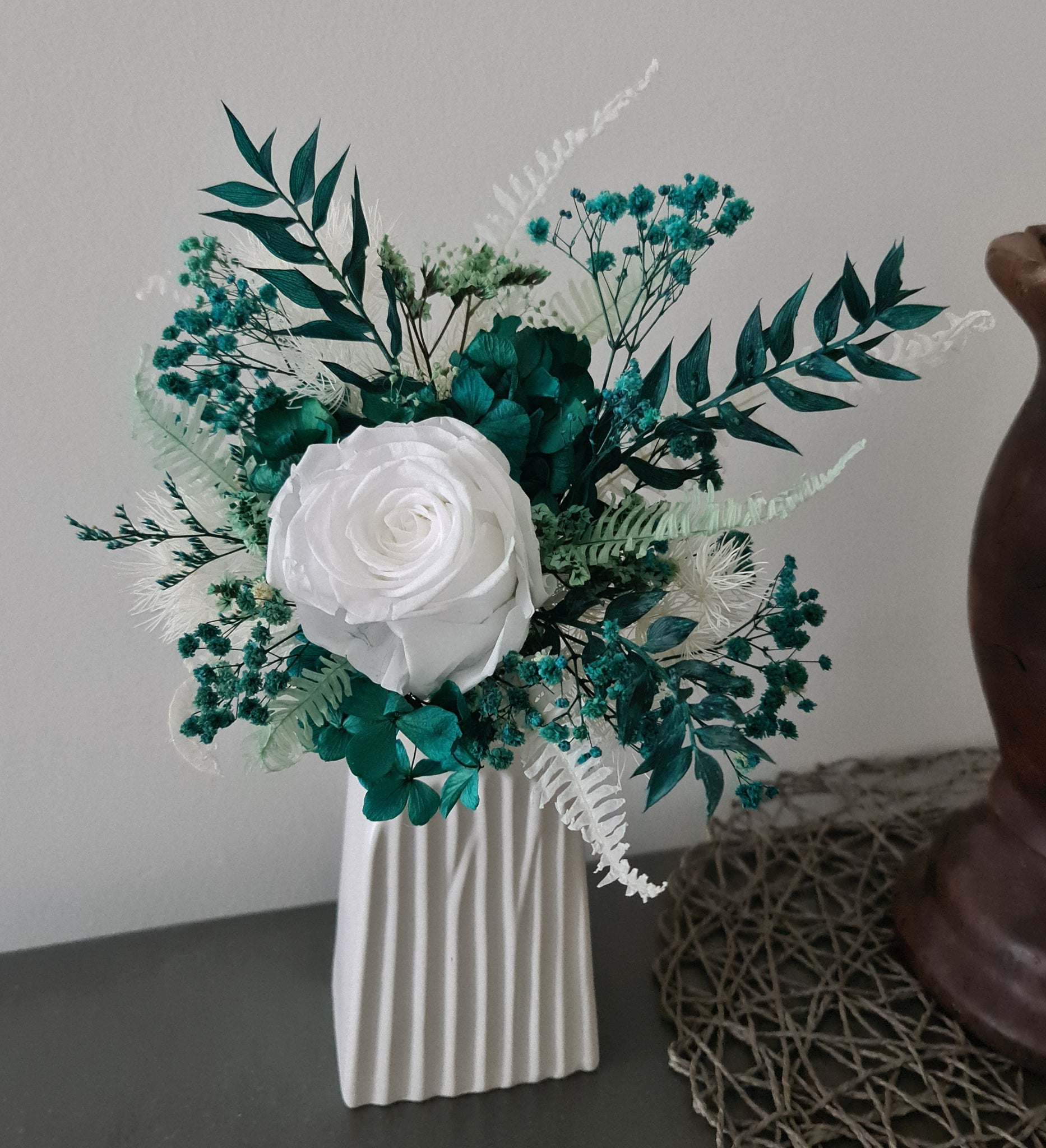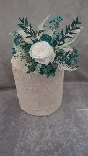 Preserved flower cake topper in emerald and white tones with white preserved rose.