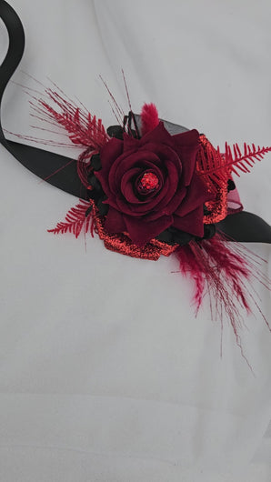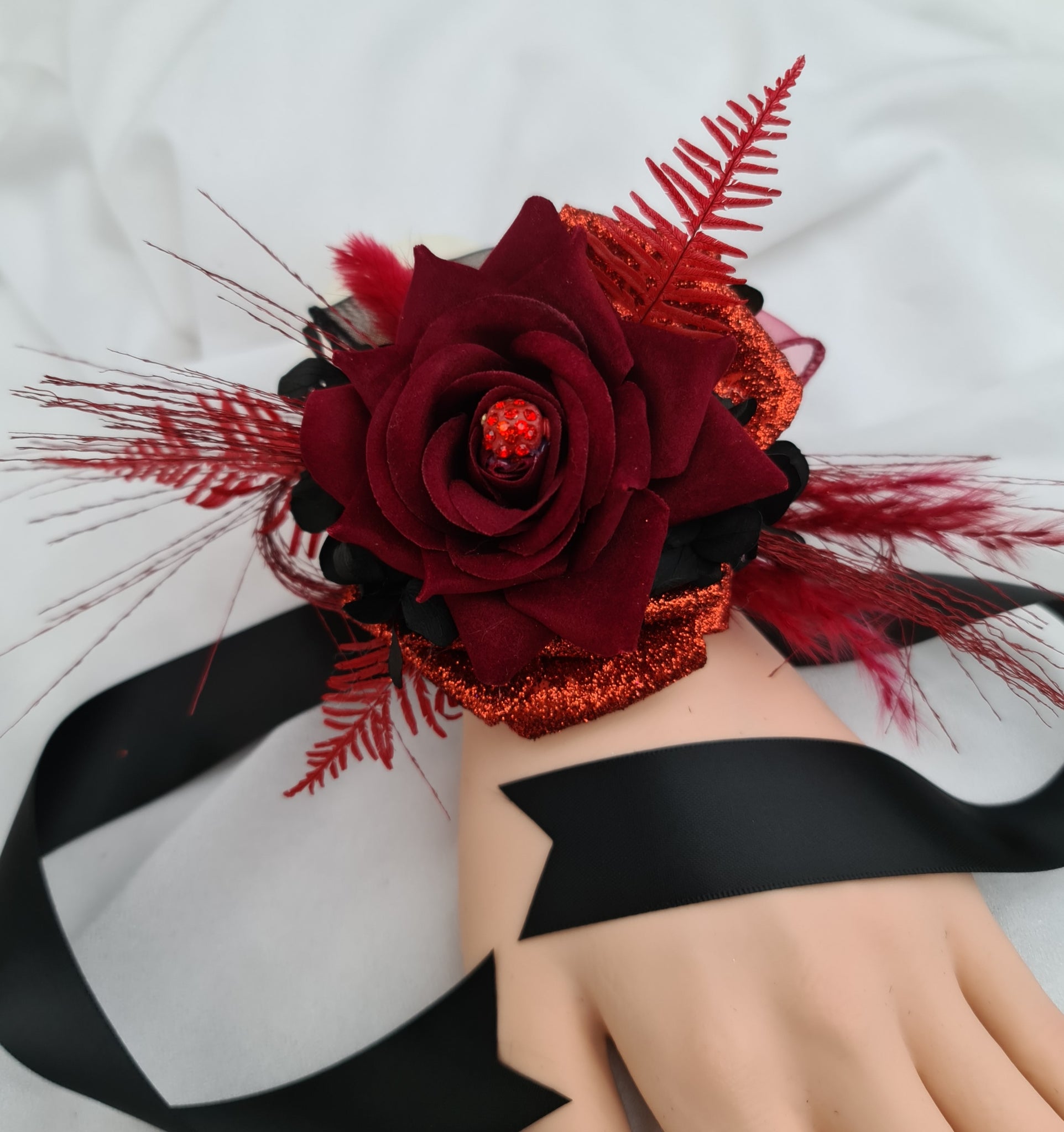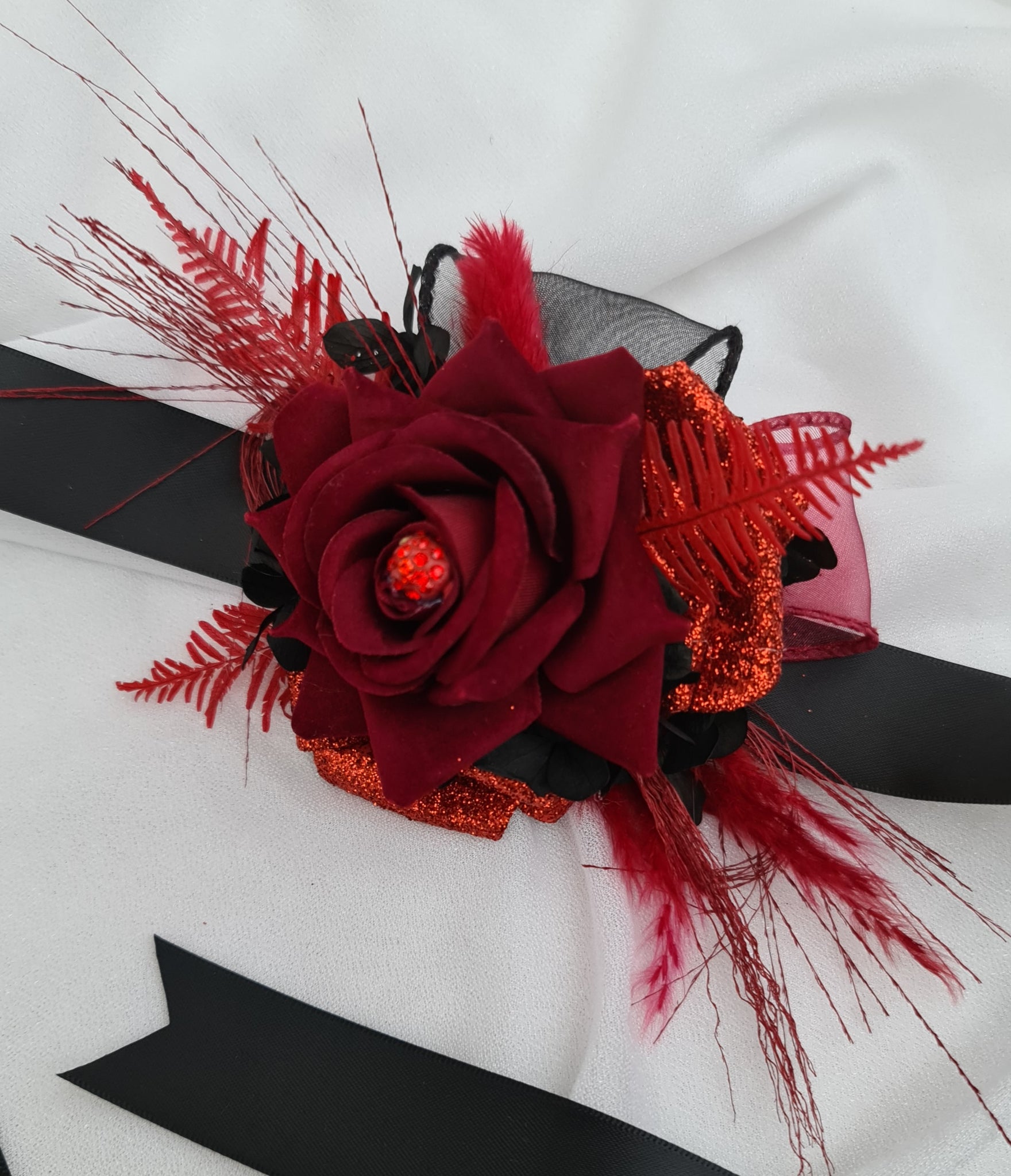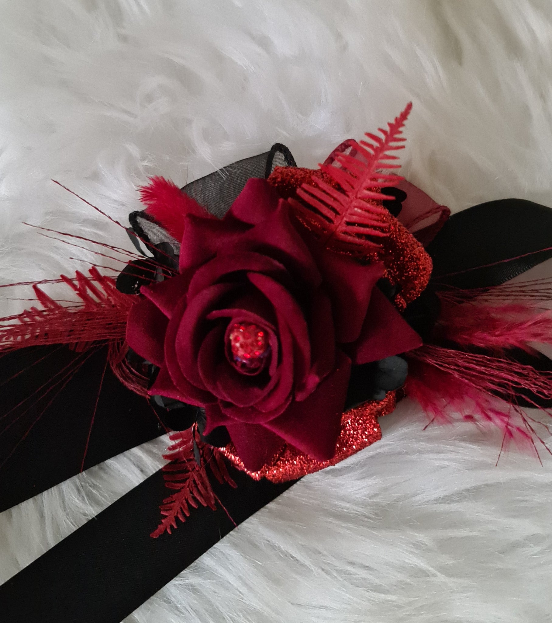 Black & red corsage combination of preserved flowers with burgundy velvet rose, crystals and glitter