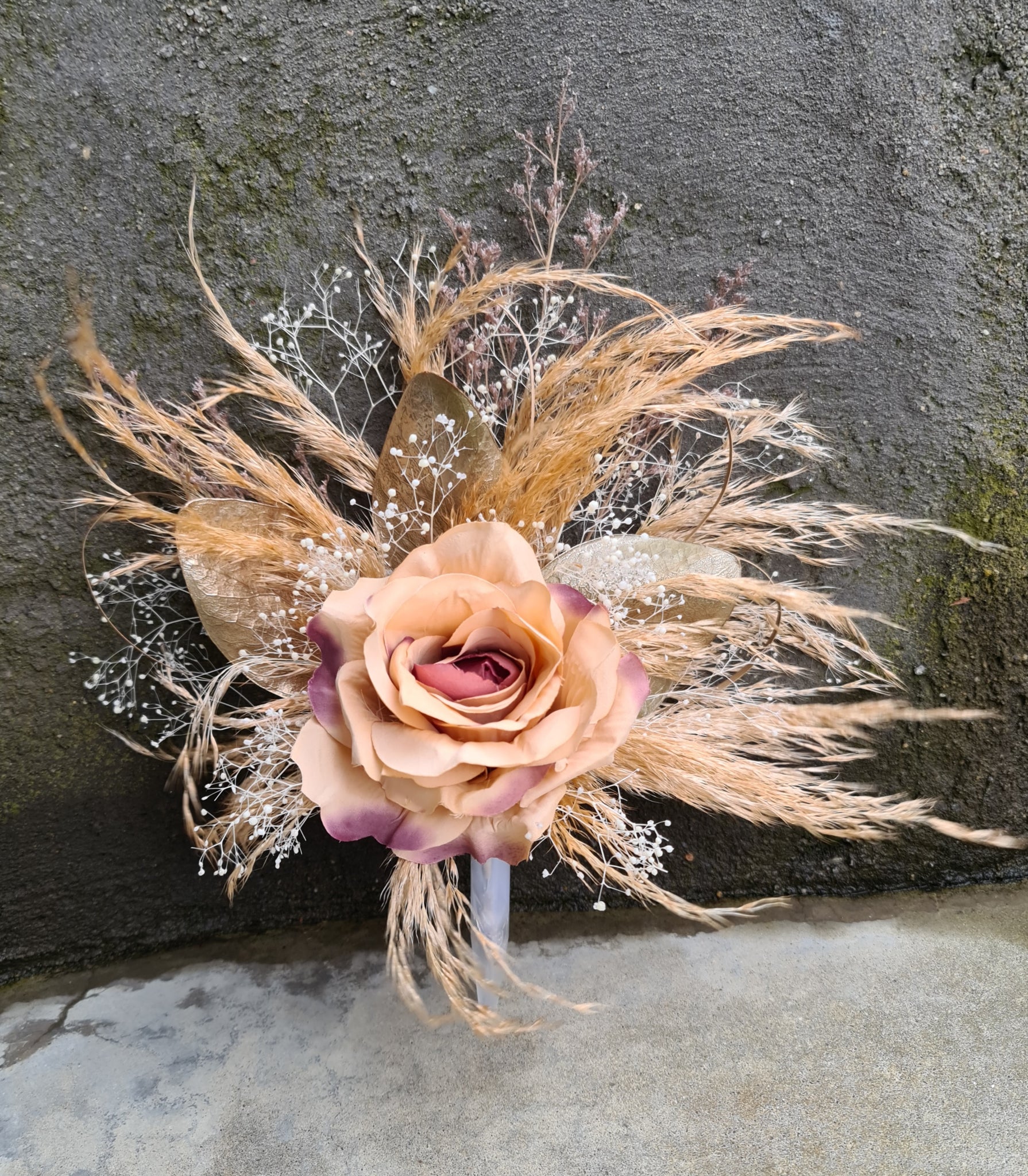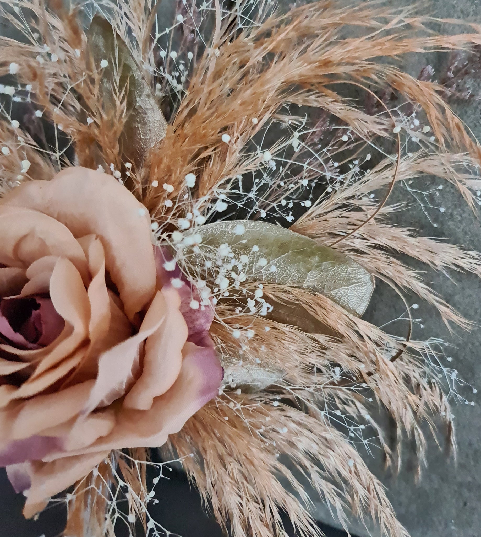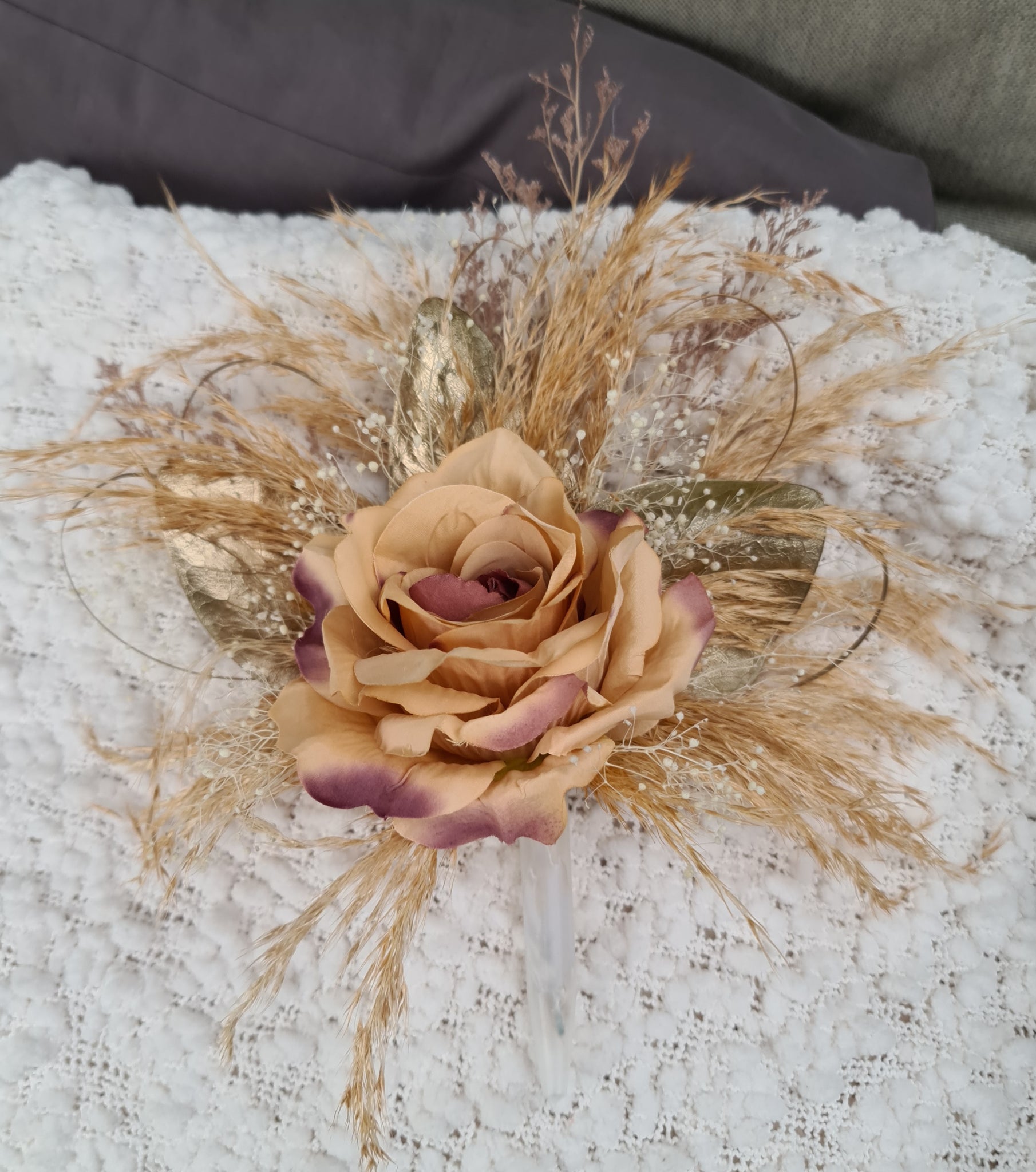 Floral cake topper – combination of everlasting preserved flowers with silk rose.