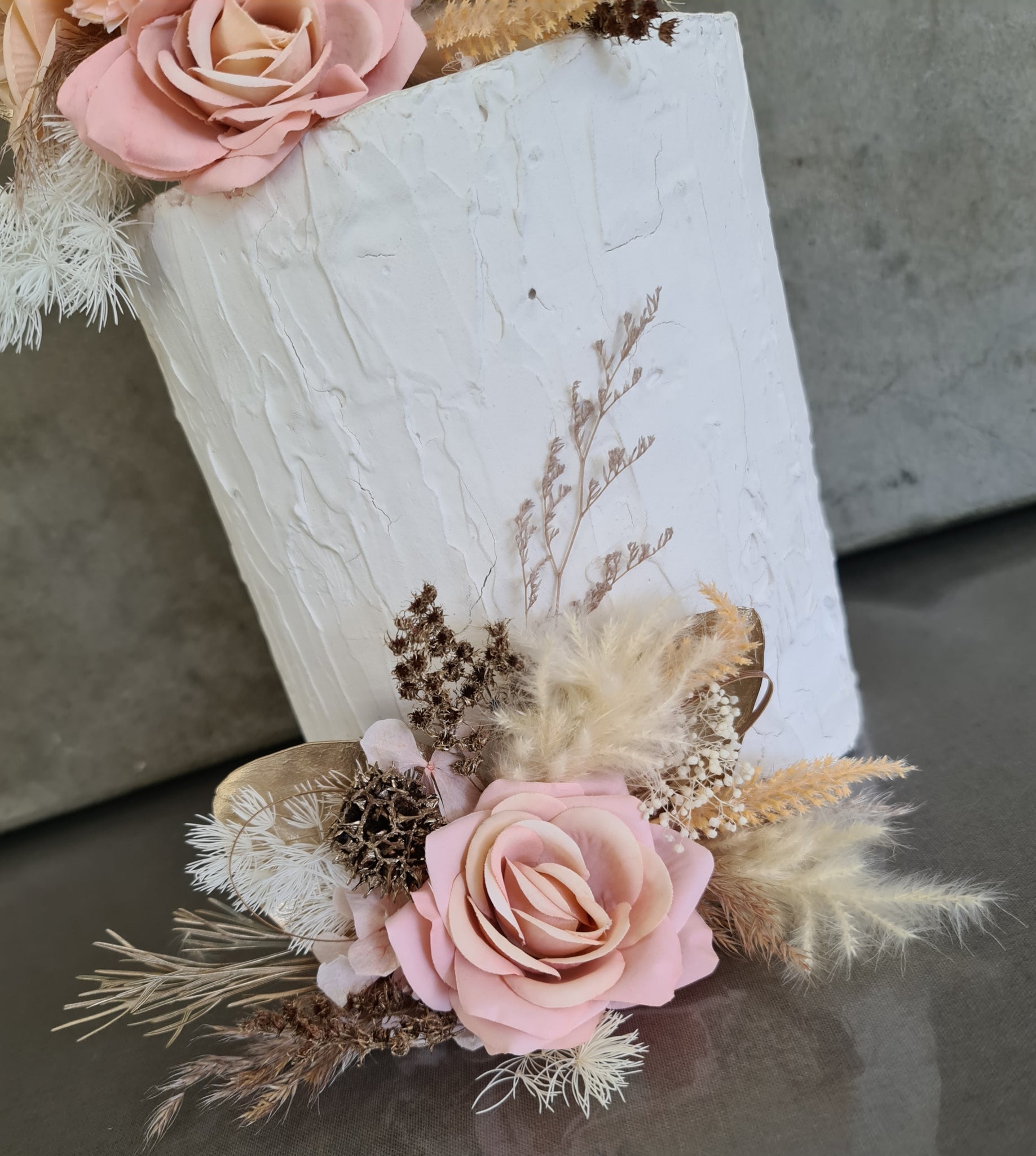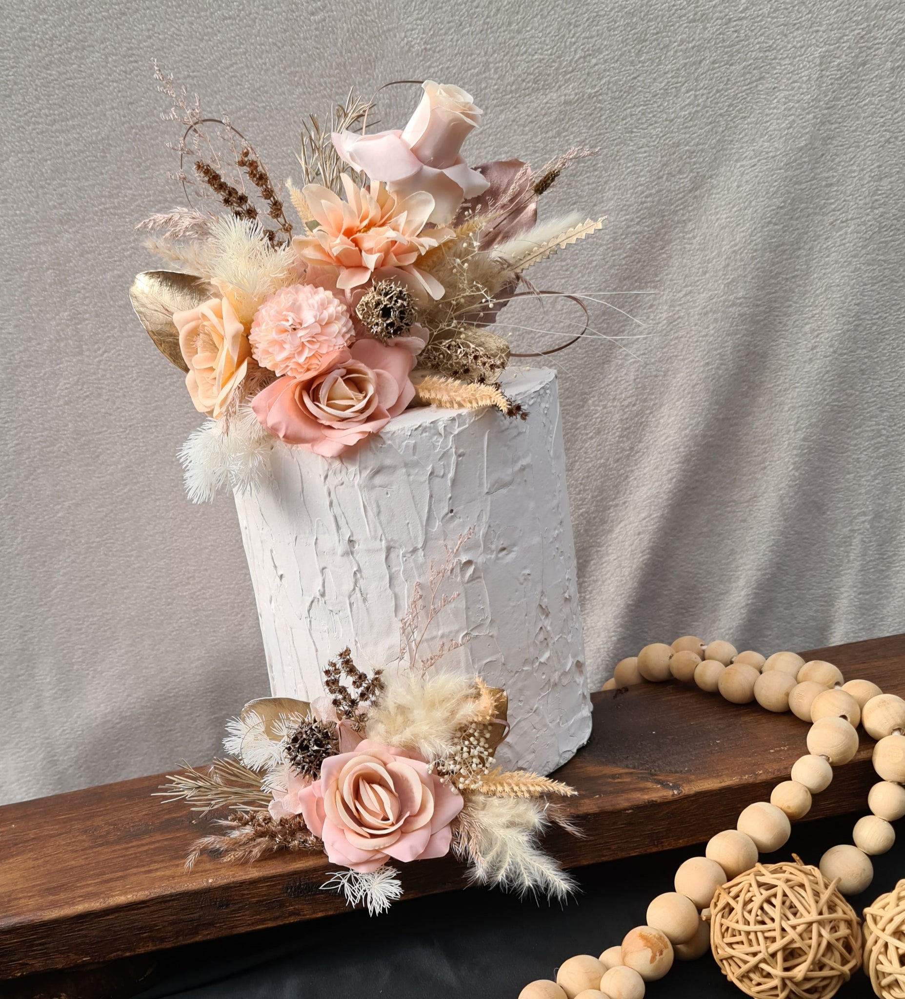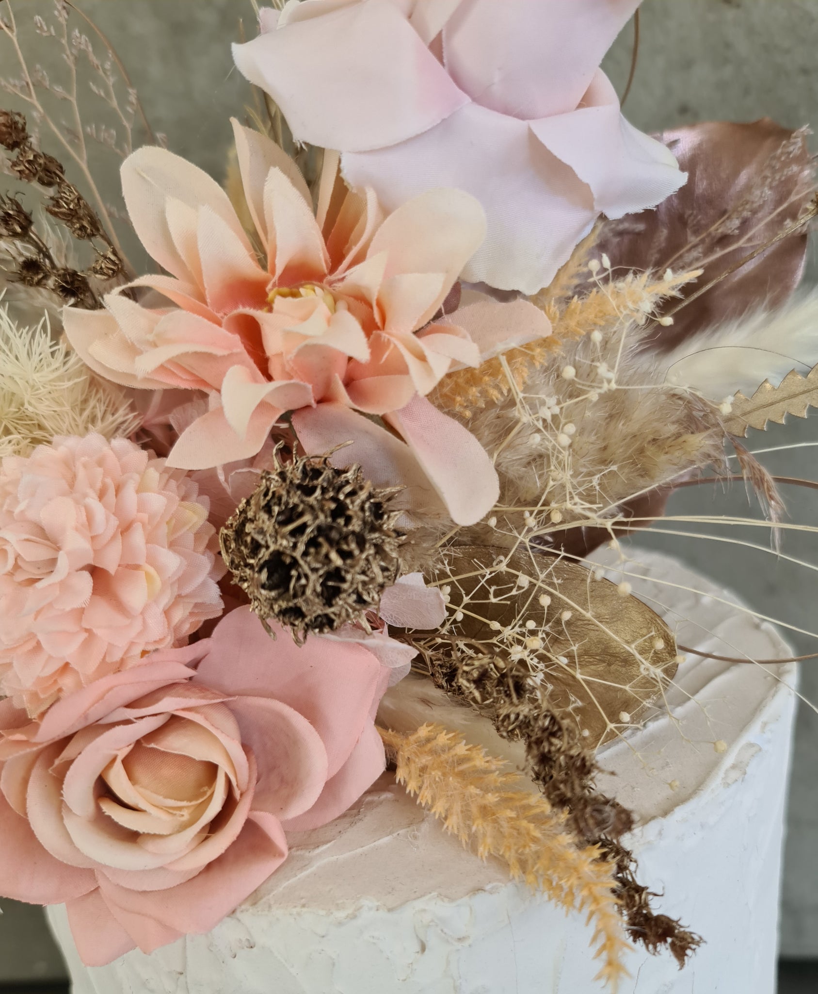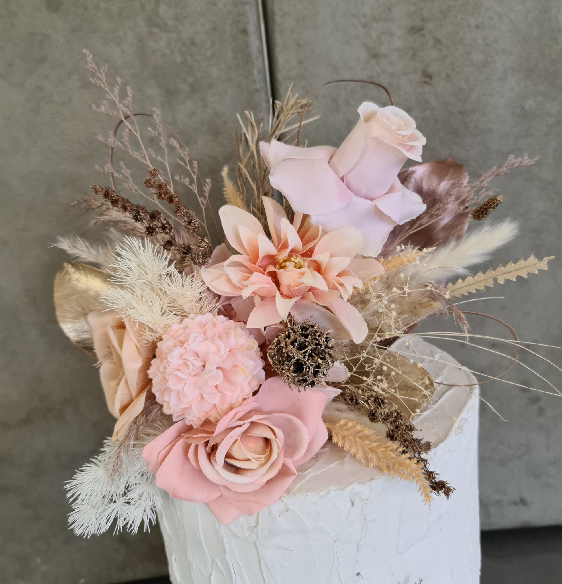 Combination of silk flowers with preserved ming fern, Limonium & hydrangeas