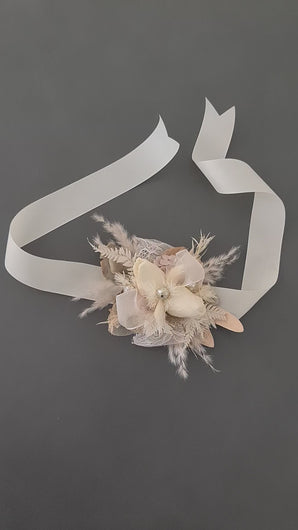 Everlasting flowers corsage; preserved flowers with real touch tulips in neutral and champagne gold tones, topped up with champagne glitter beads and lace