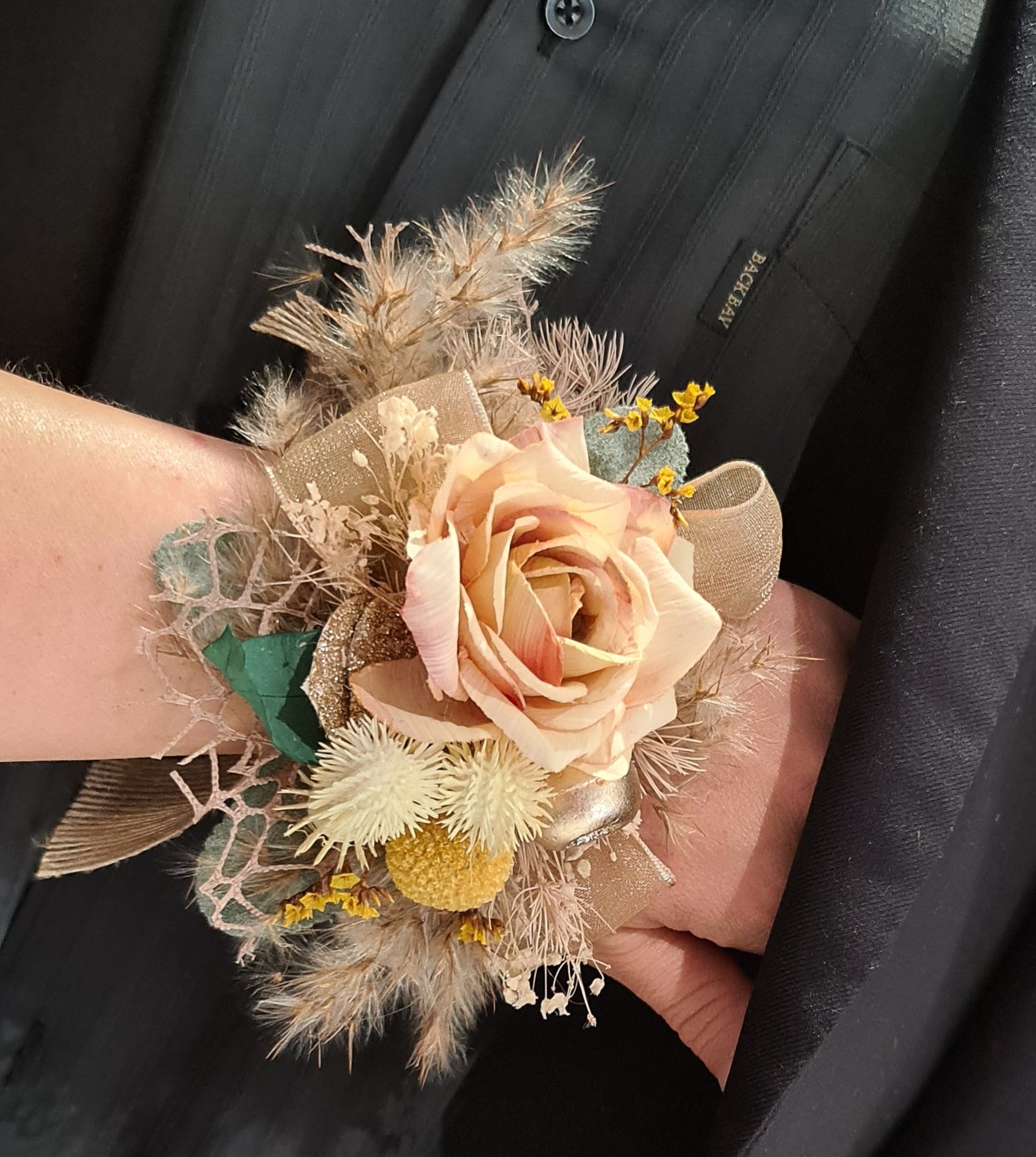 Peach, green, brown, yellow & gold glitter school formal or wedding corsage
