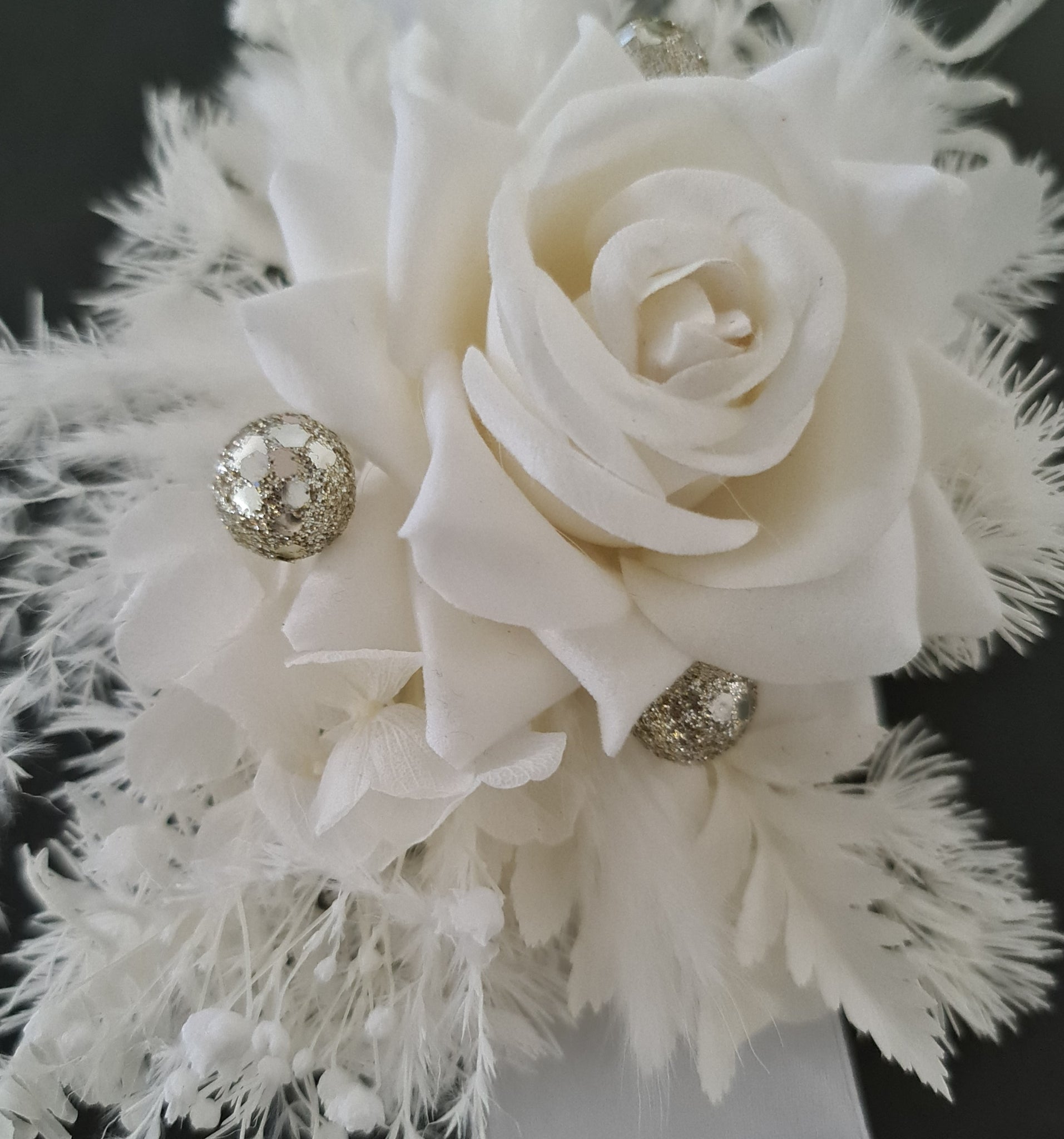 White & off white tones school formal corsage combination of silk rose and preserved flowers with champagne gold glitter beads
