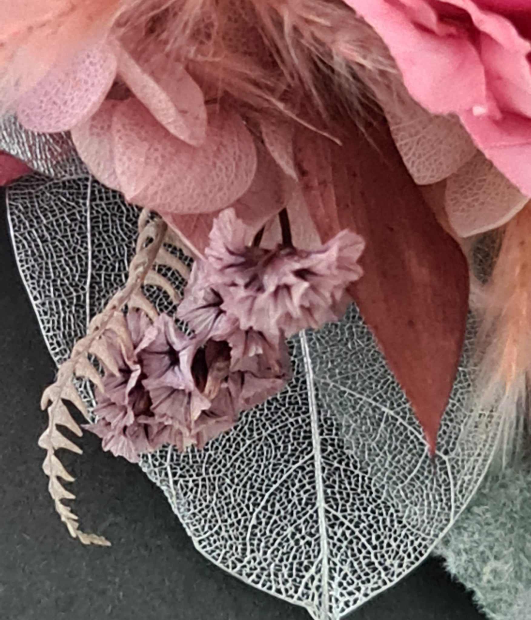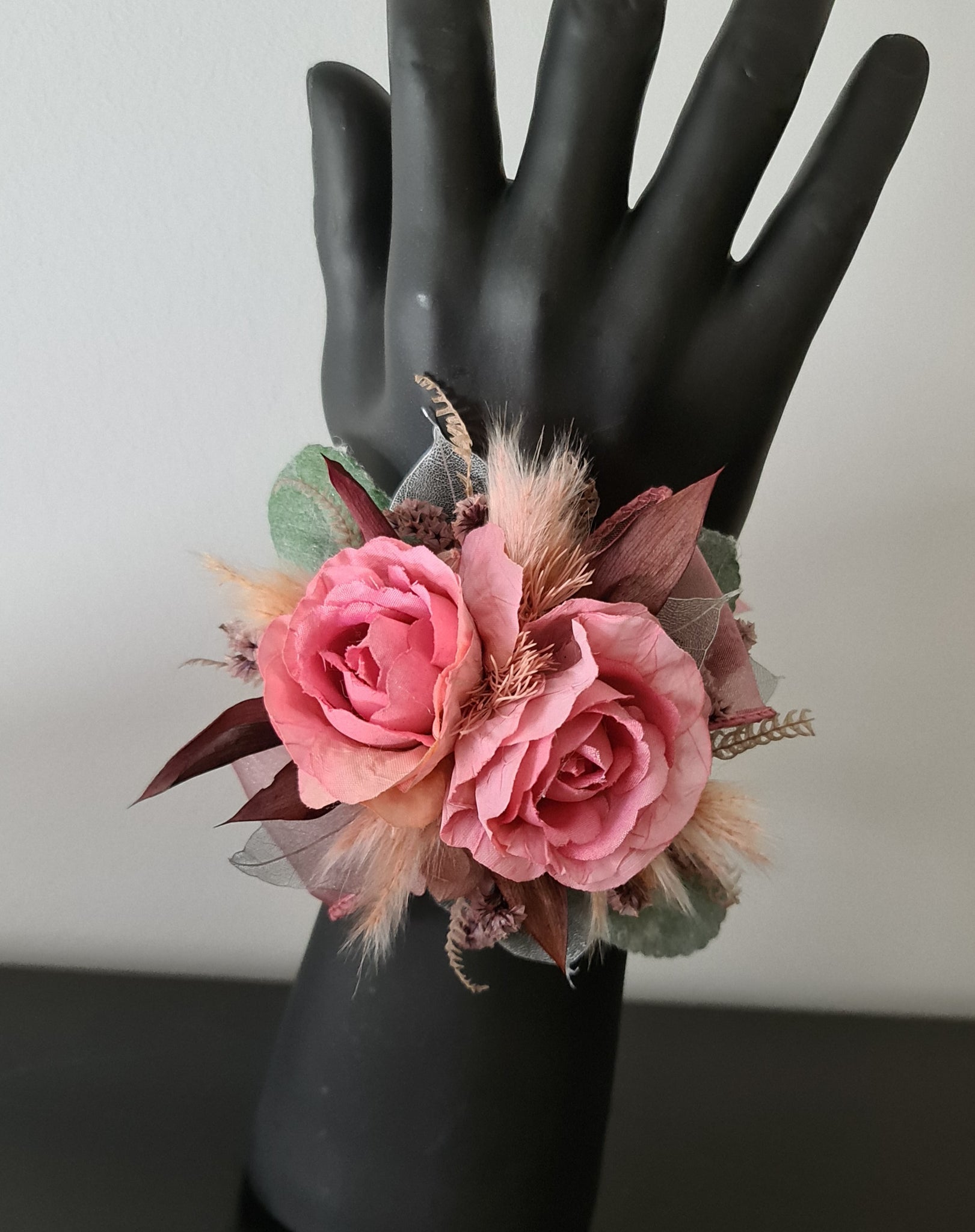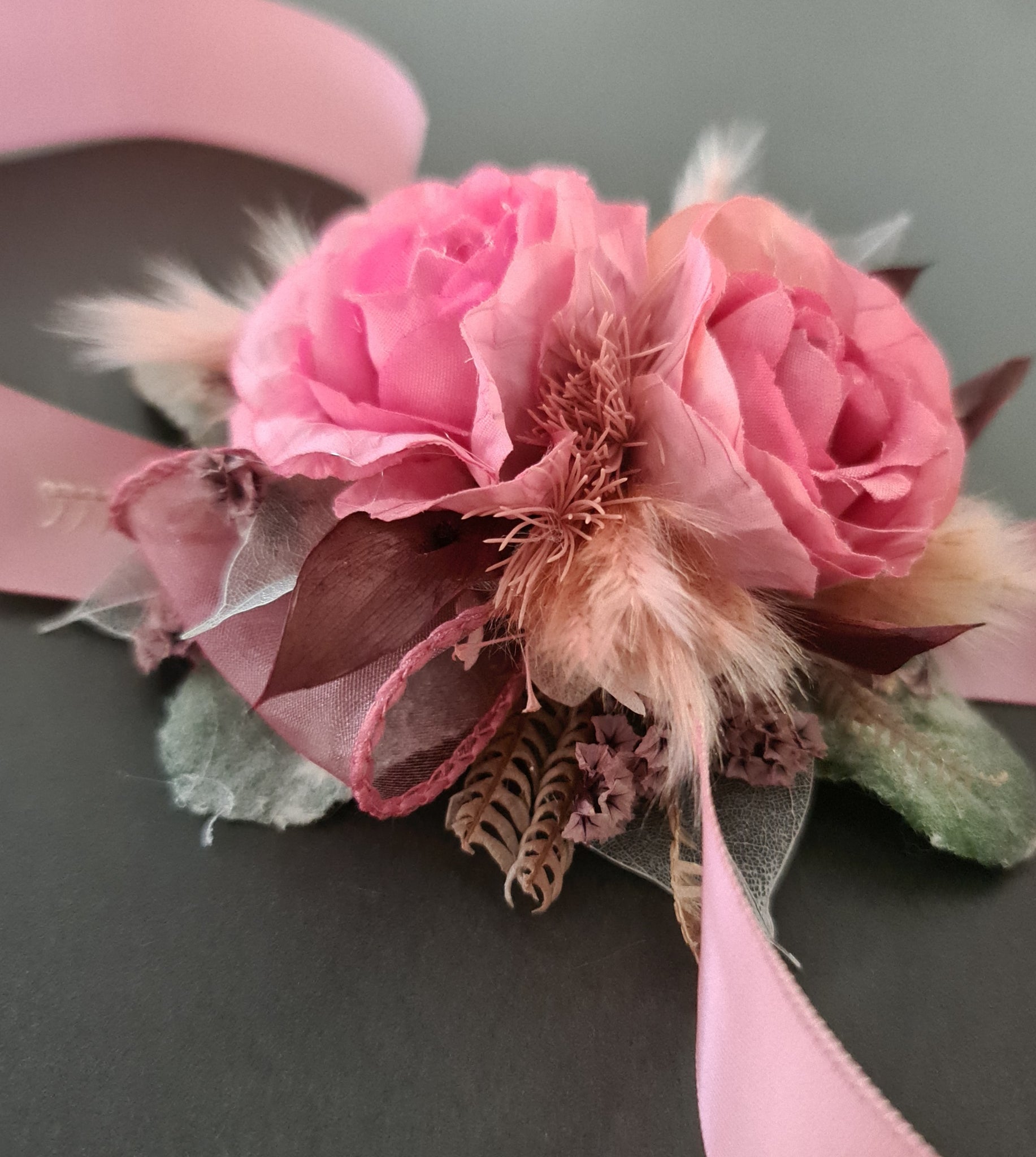 Unique school formal / wedding corsage in pink, brown, green & silver tones, combination of silk, dry and preserved everlasting flowers with silver skeleton leaves