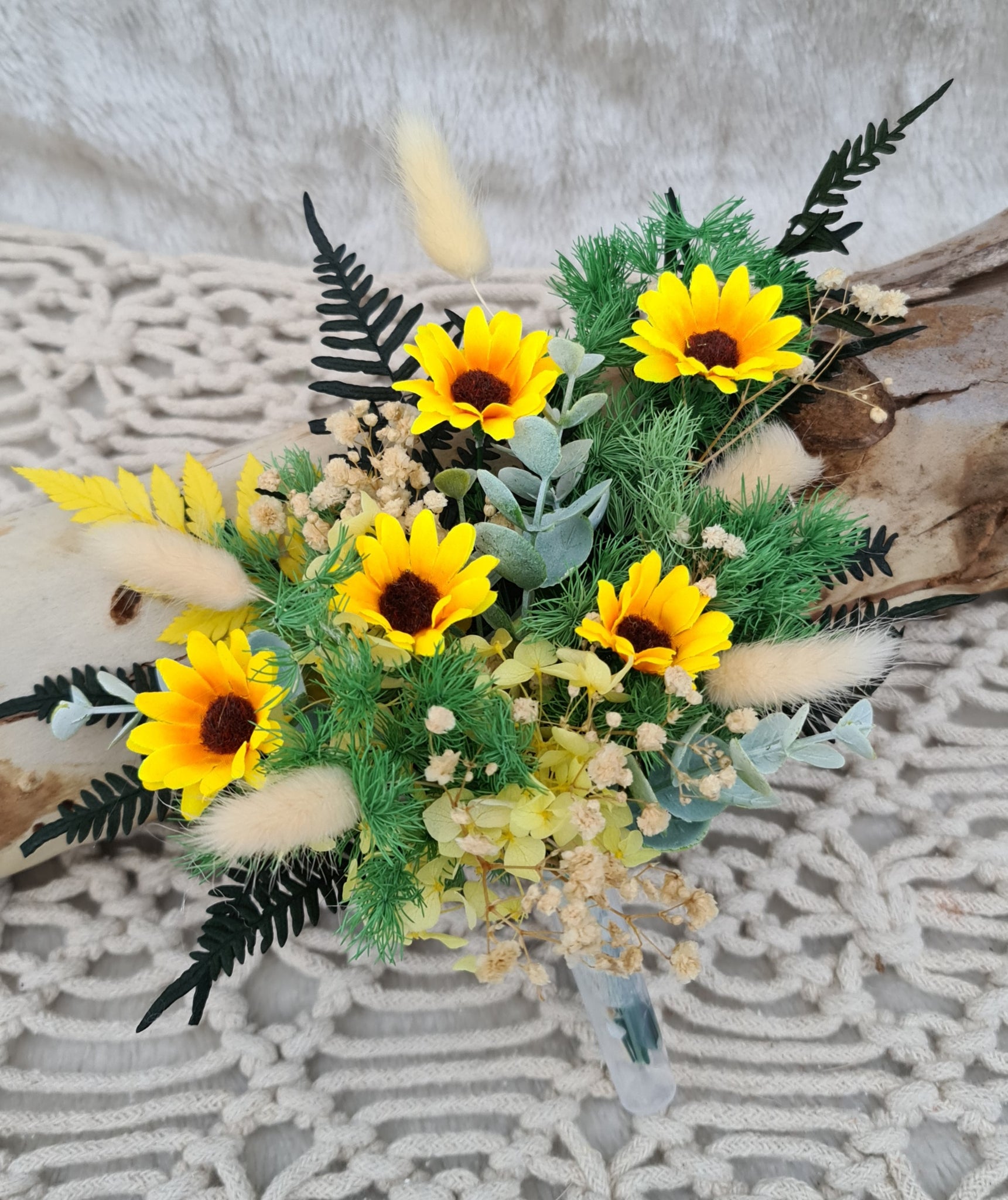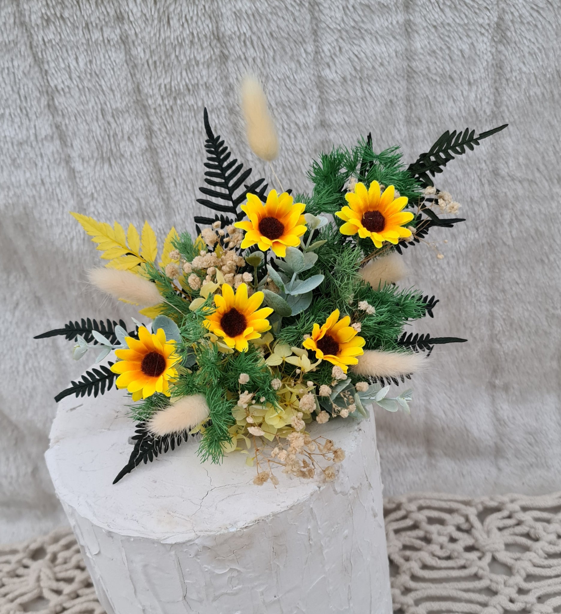 Combination of silk, dry & preserved flowers (ming fern, fern, baby’s breath, bunnies and more)