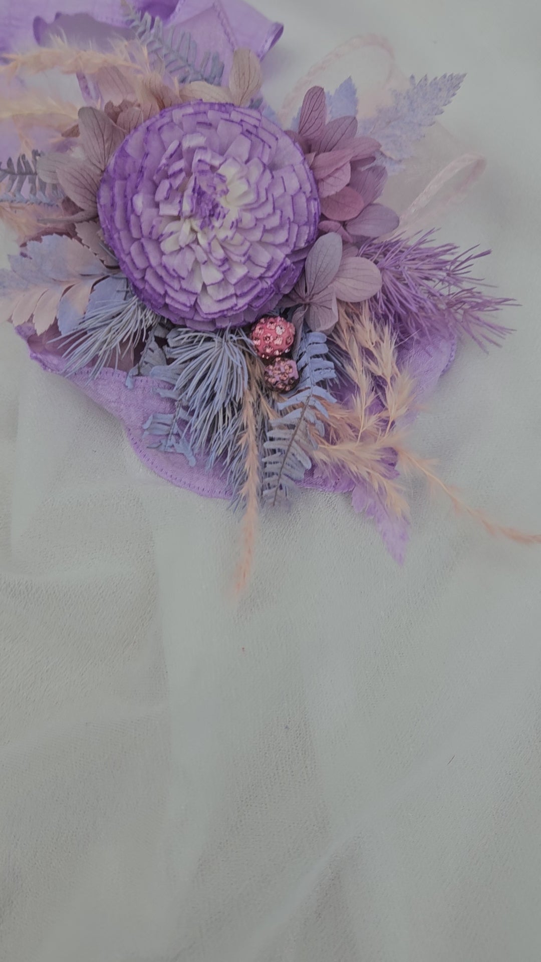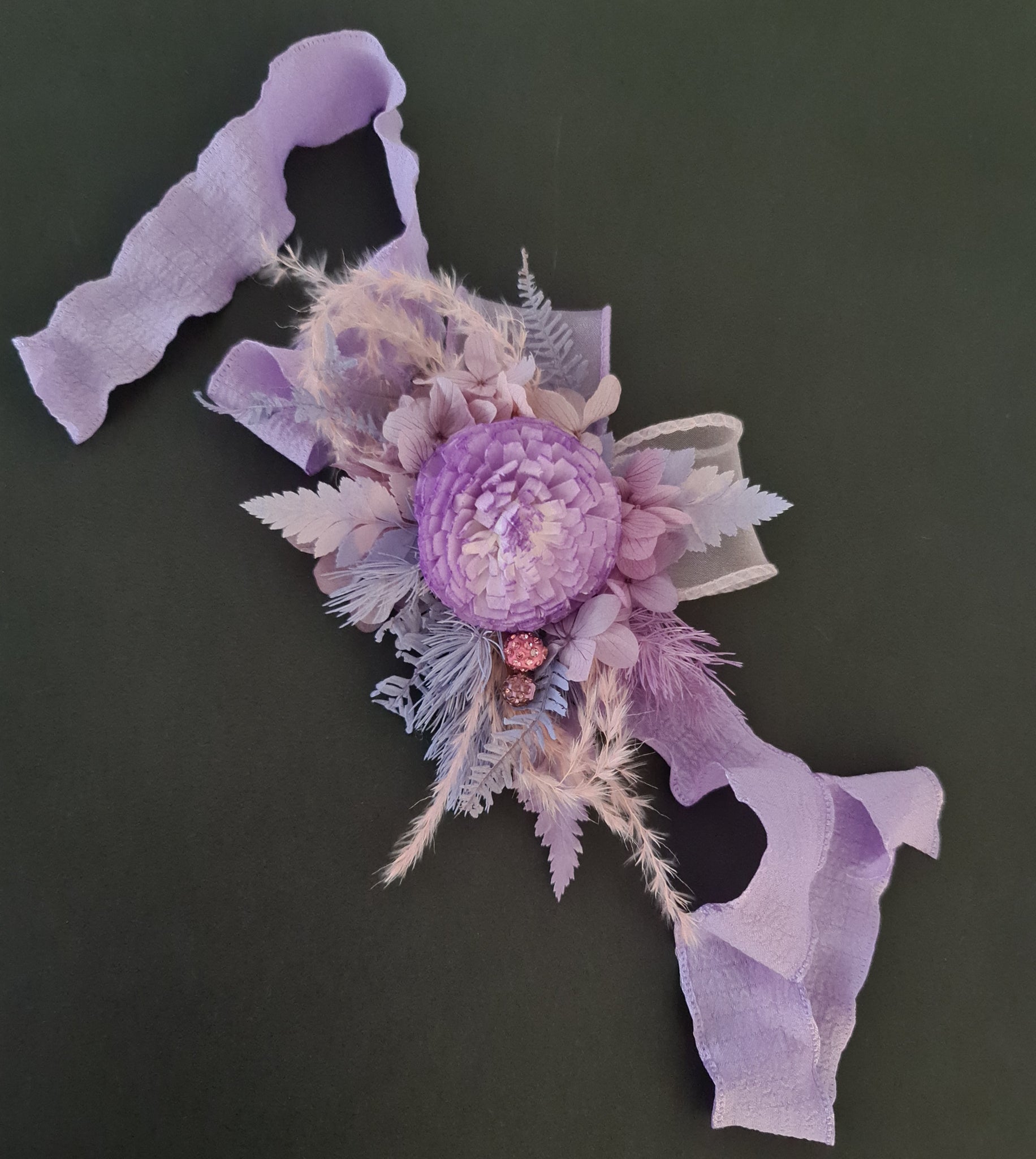 Preserved flowers corsage; combination of violet, purple and pink shades with 2 crystals in pastel colours and purple/violet sola flower