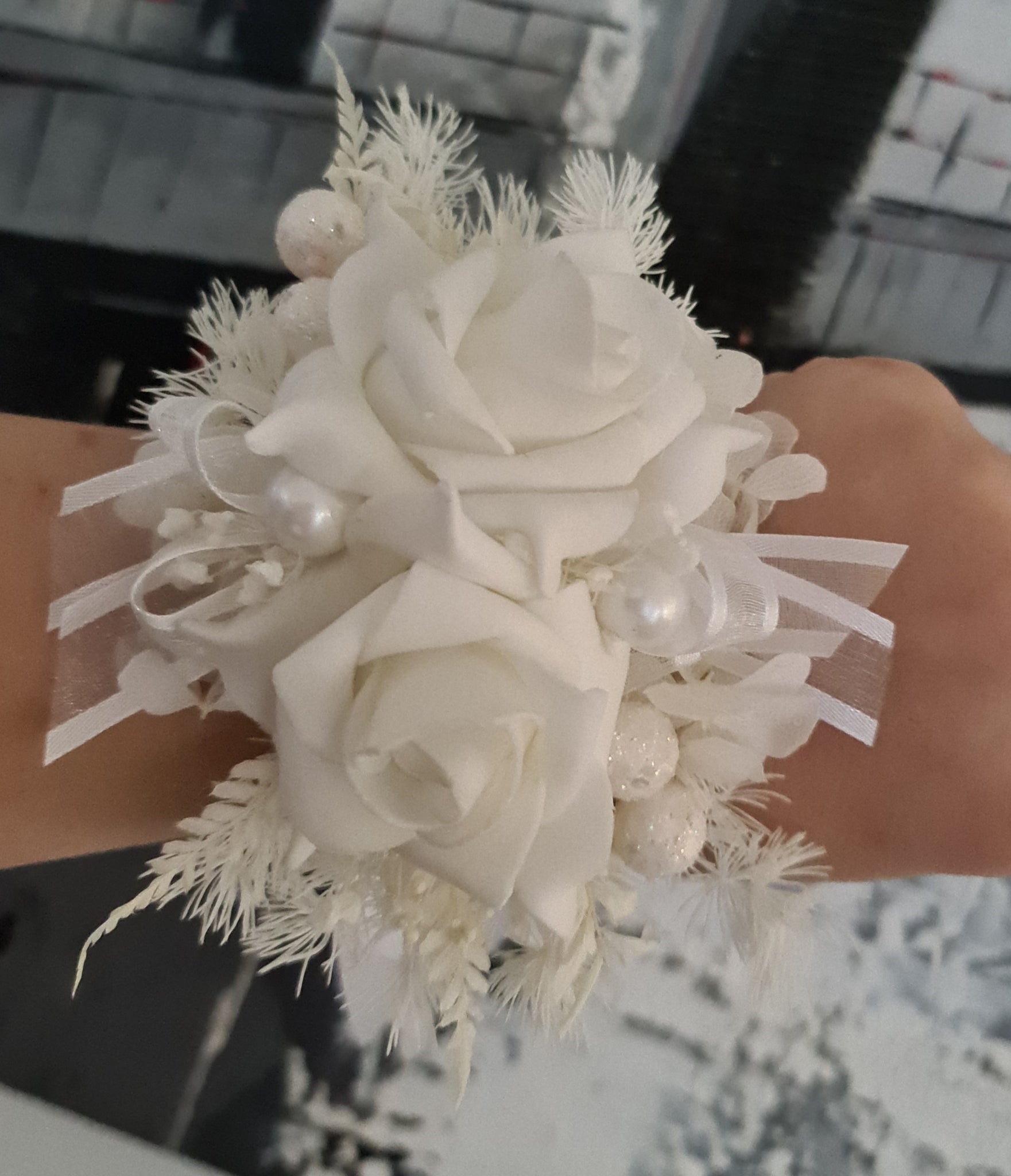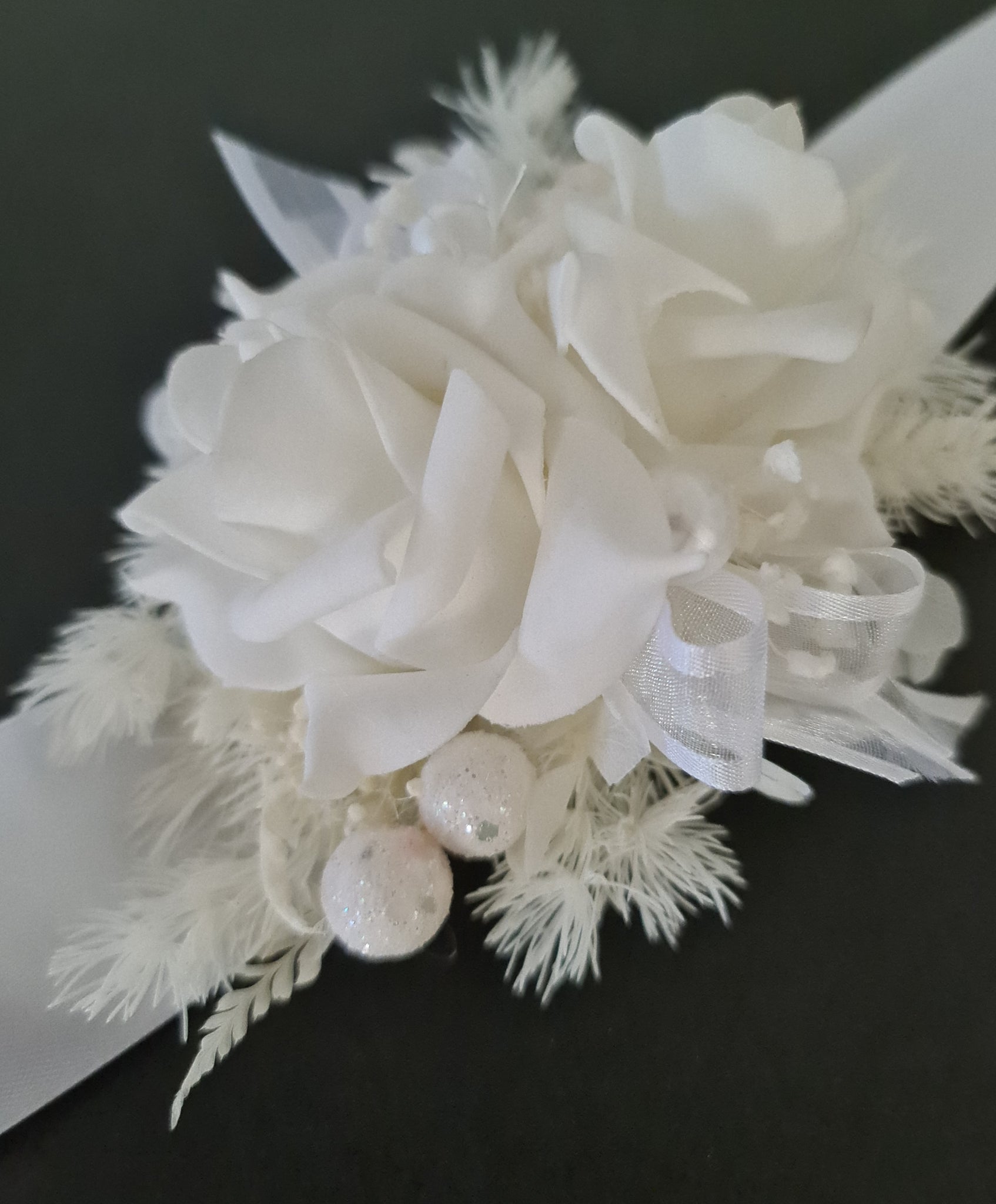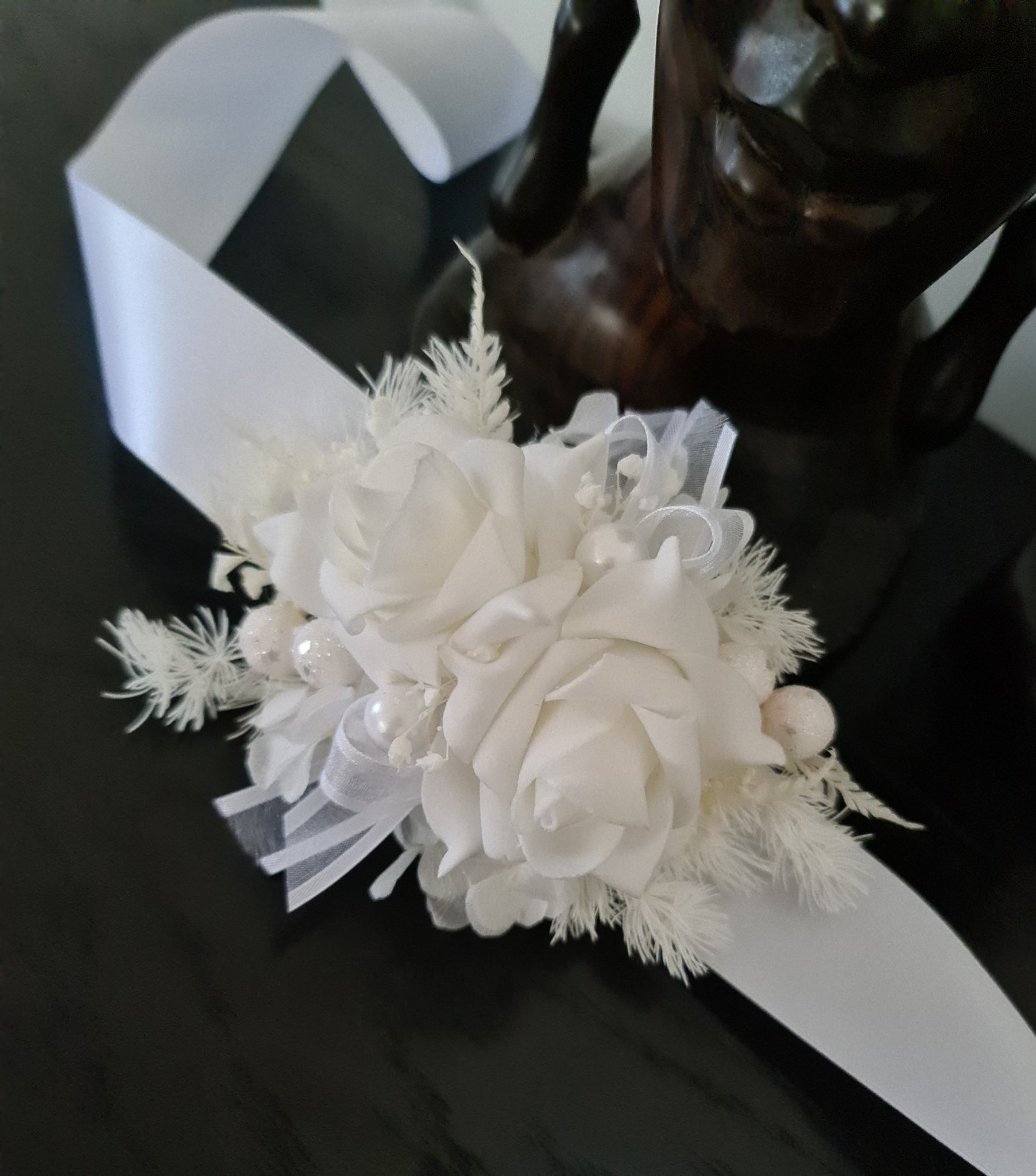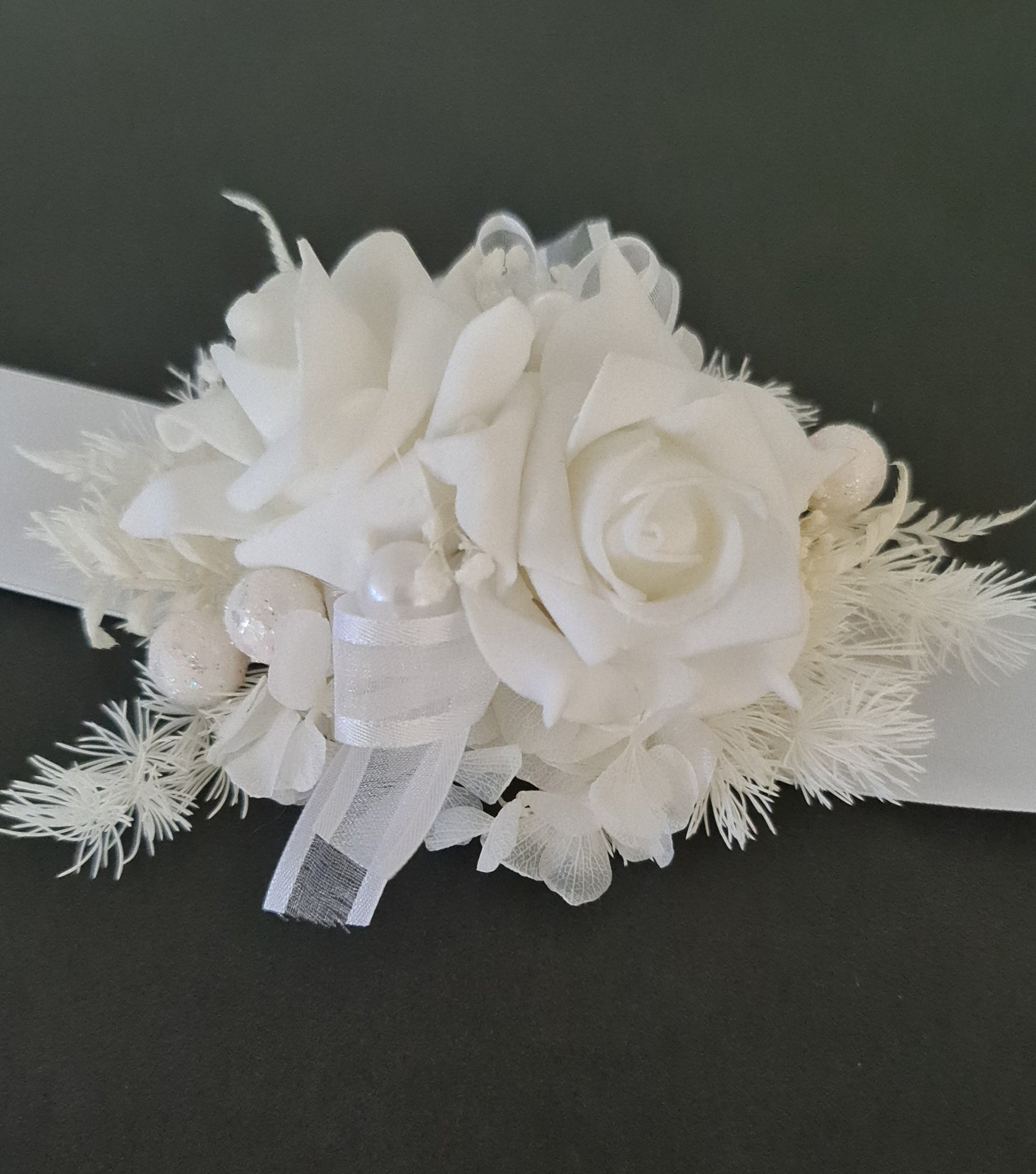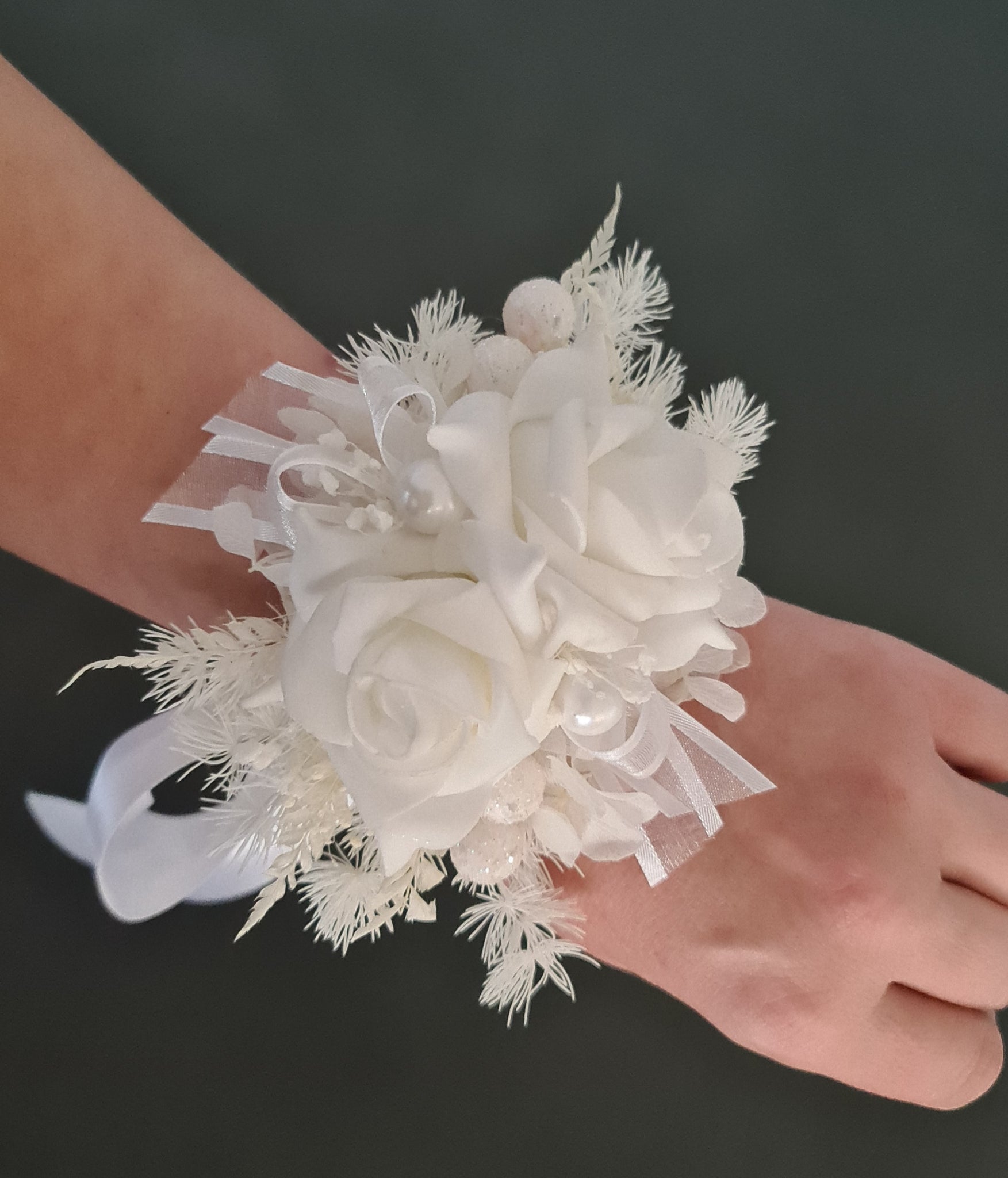 Everlasting flowers white corsage w glitter pearls - School formal / Wedding