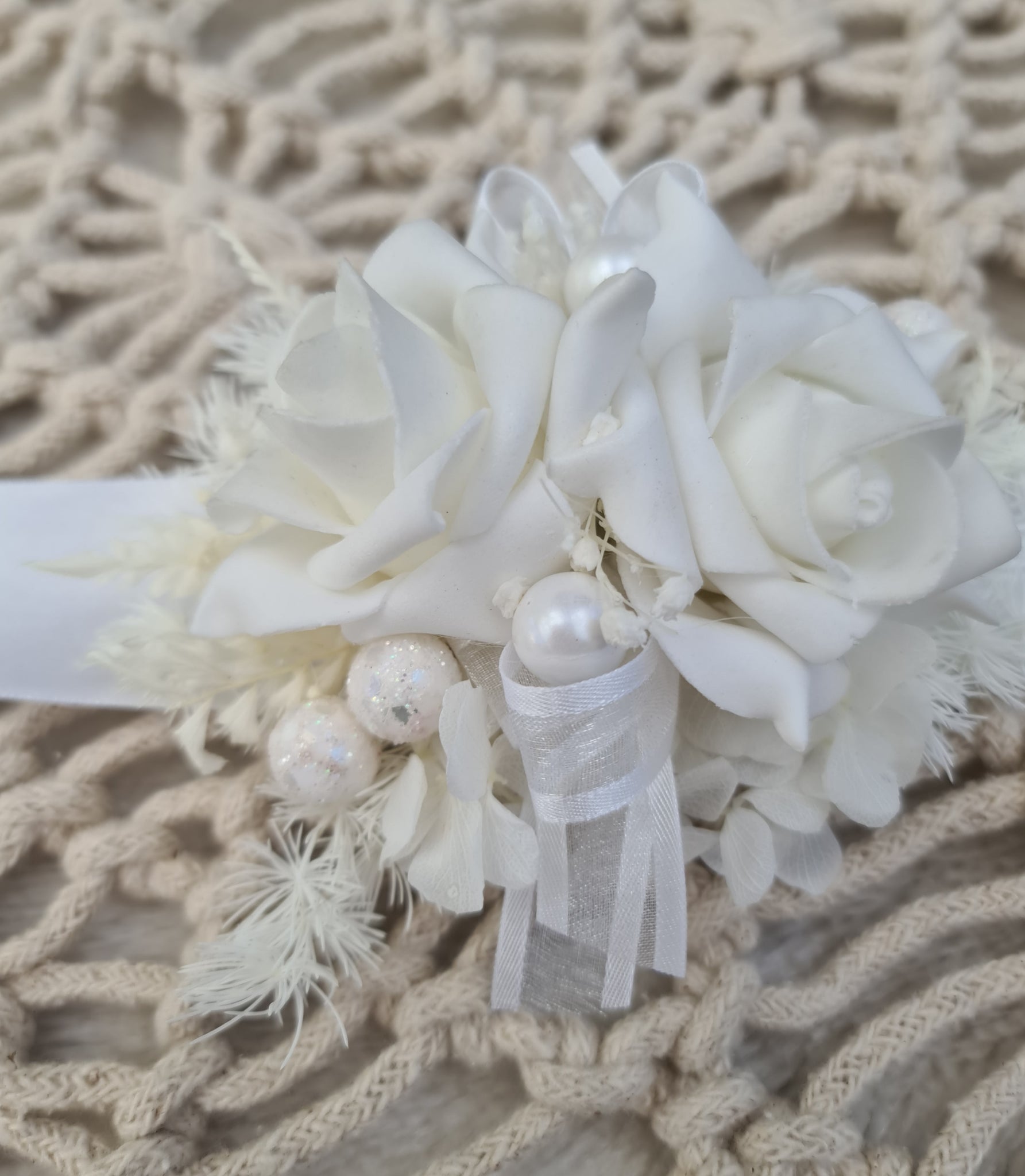 White everlasting flowers corsage combination of preserved & silk flowers with glitter pearls