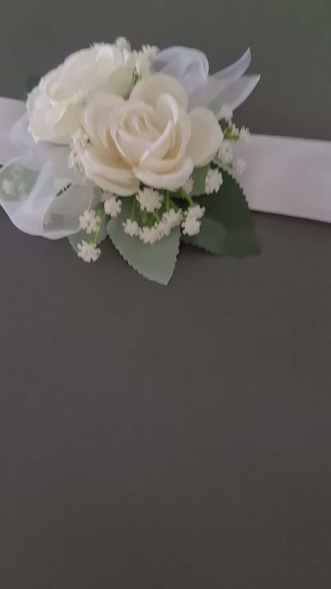 White & green corsage with silk flowers, roses & baby’s breath and satin white ribbon