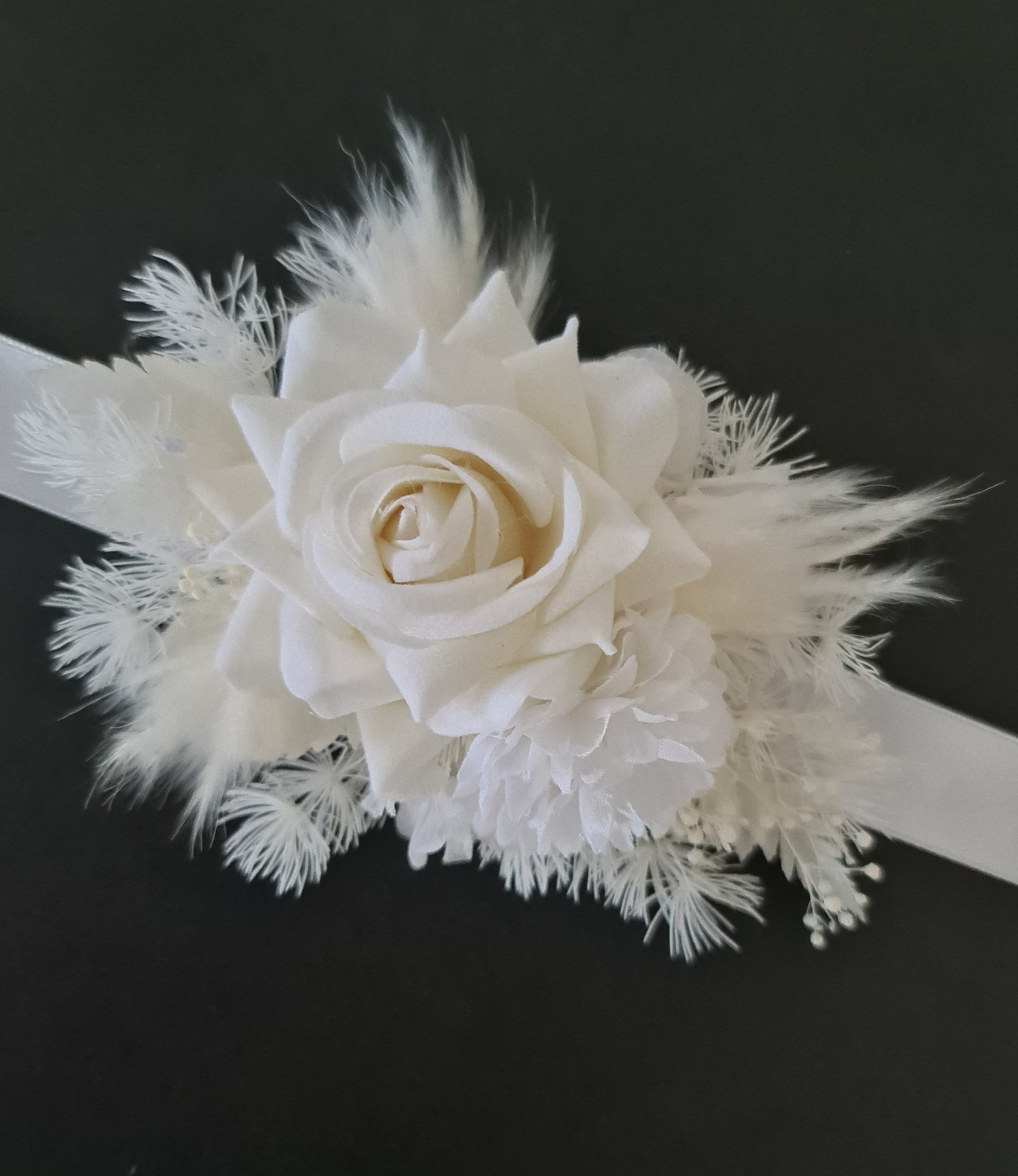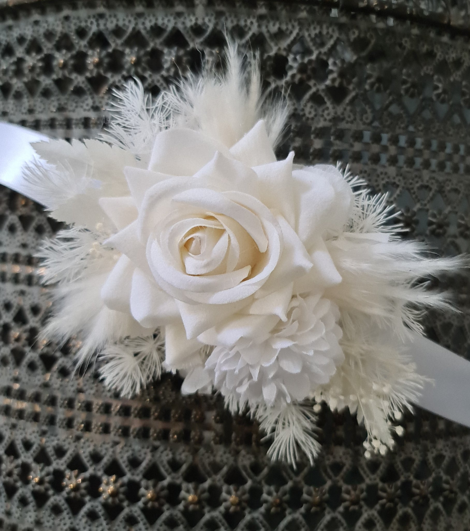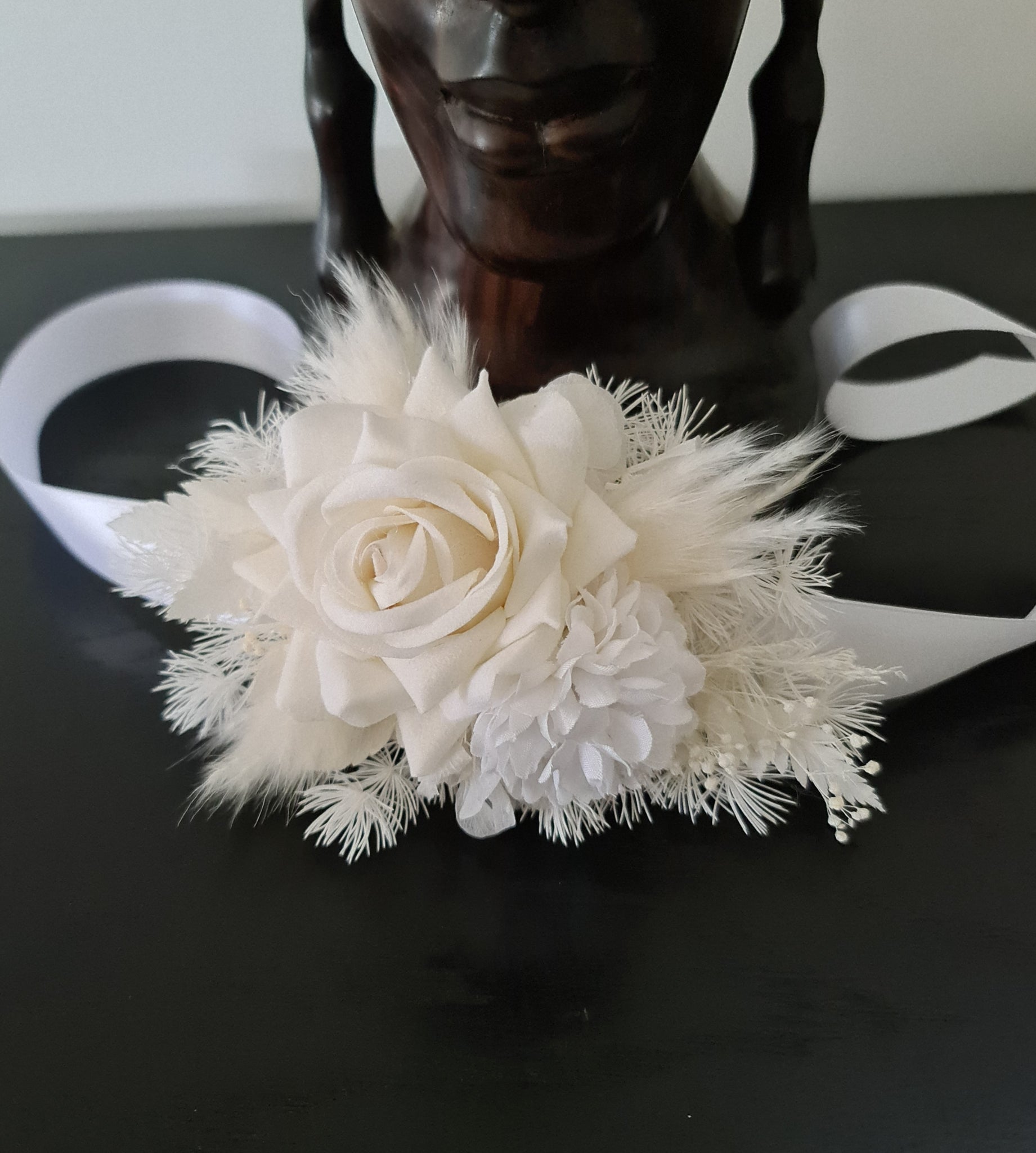 White & off white tones school formal corsage combination of silk rose and preserved flowers