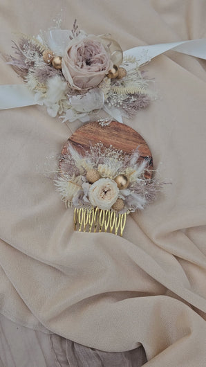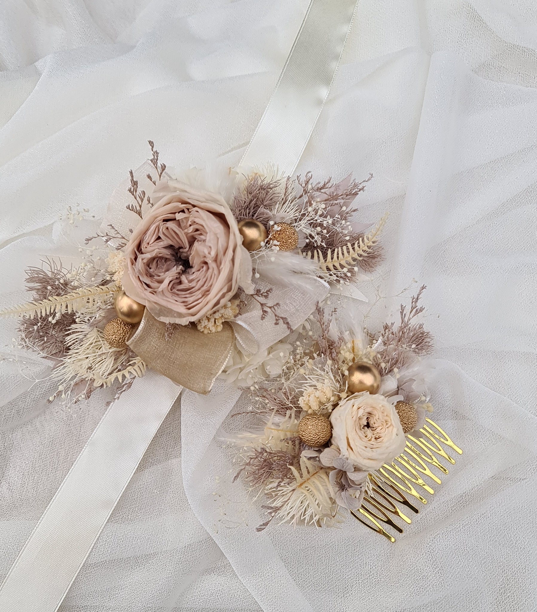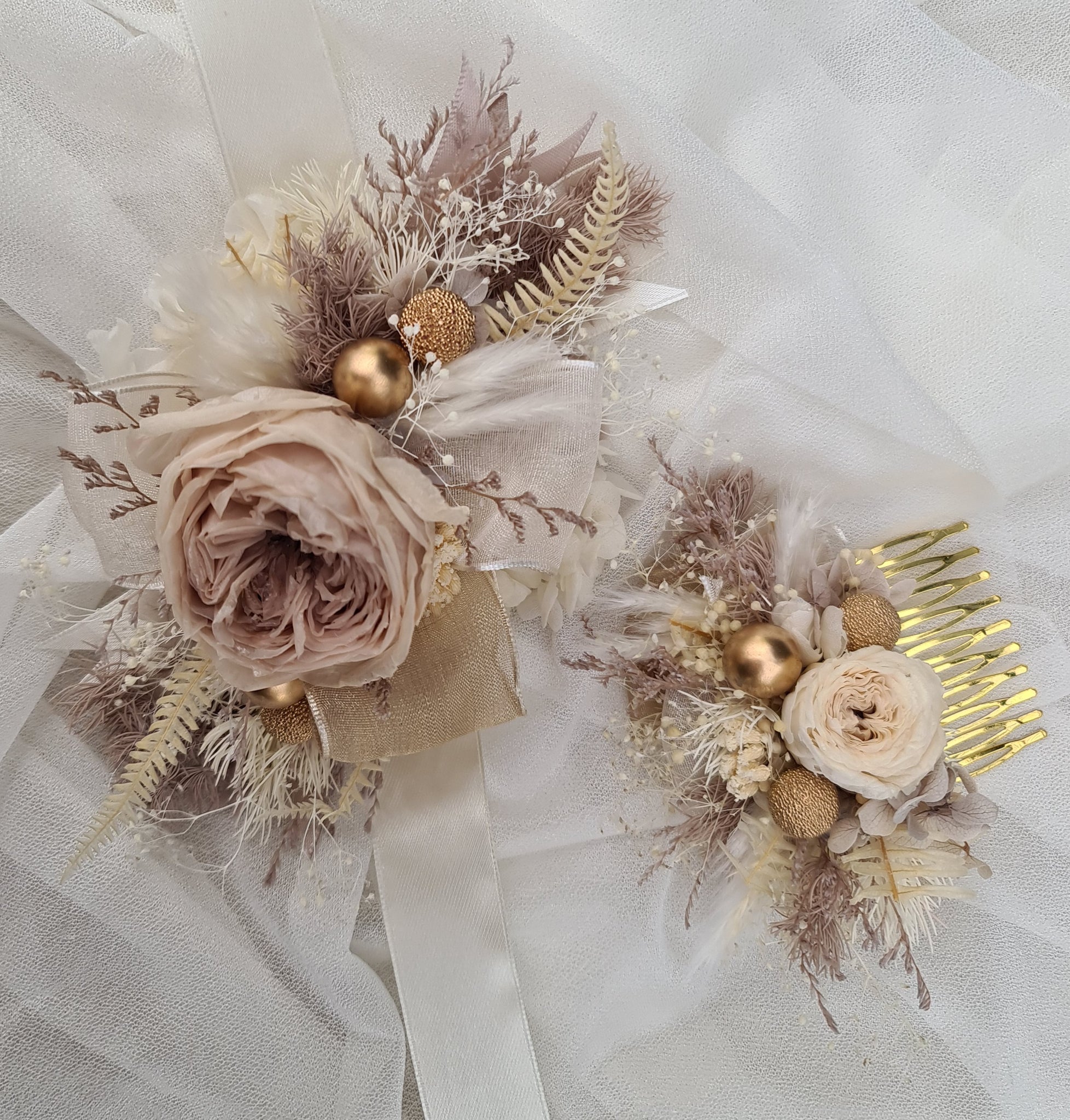Corsage with larger preserved peony, hydrangeas, ming fern, million stars, leather fern and more. Topped up with champagne gold pearls / beads