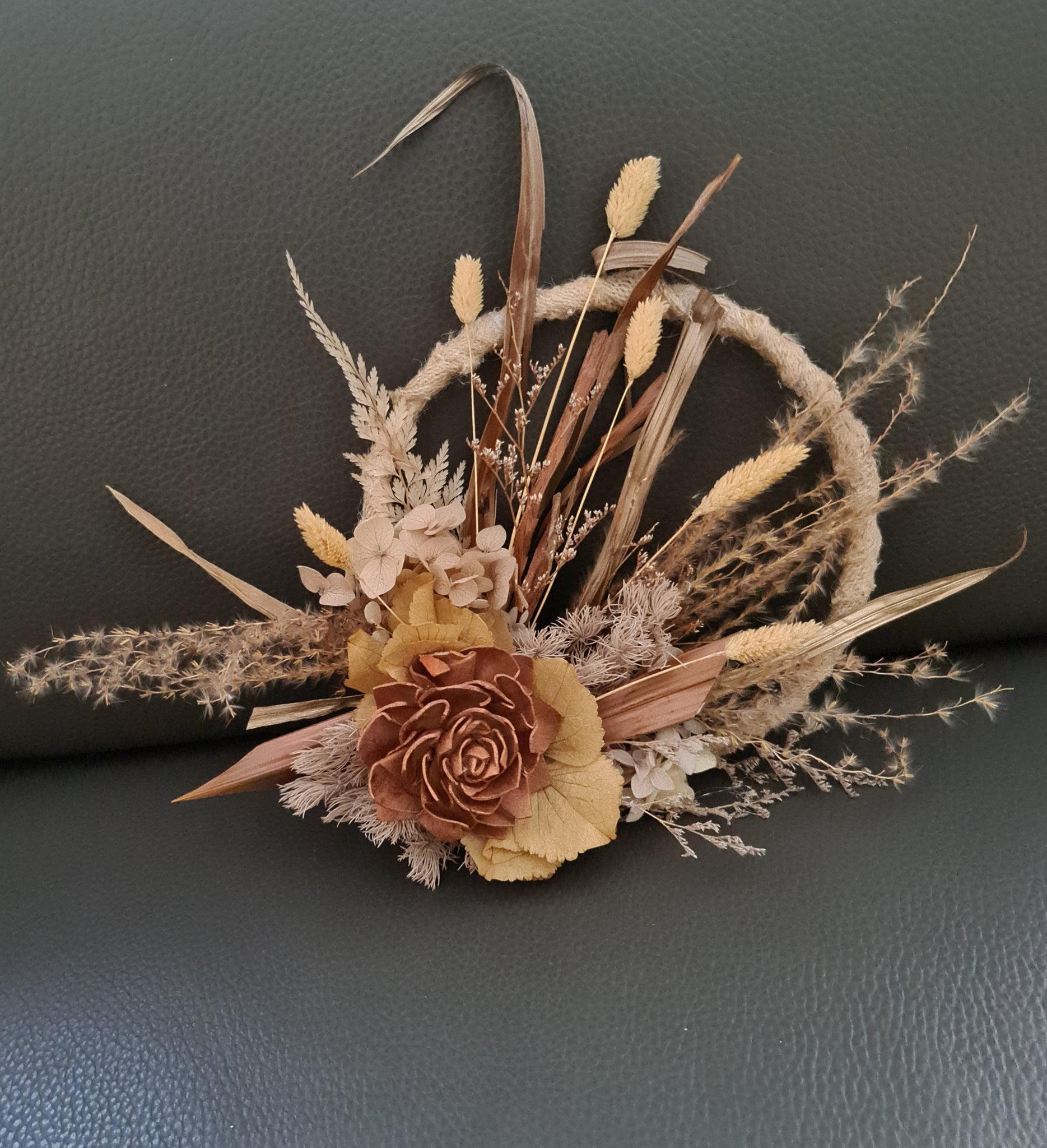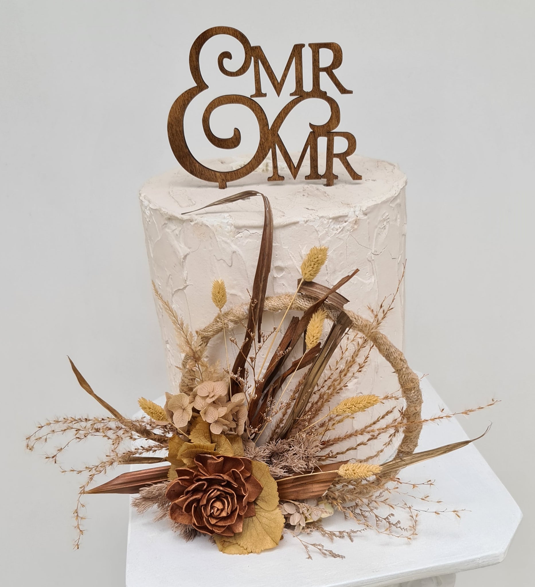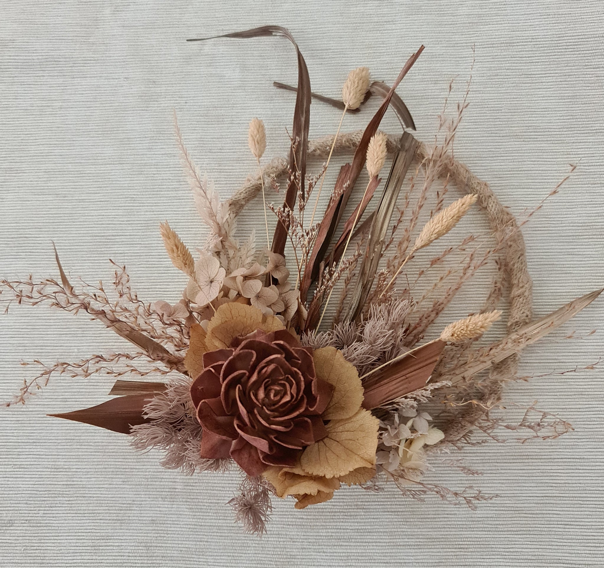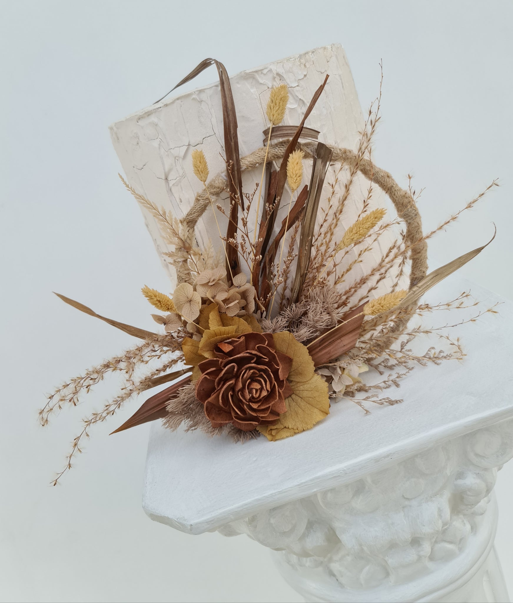 Unique handcrafted 6inch preserved & dry flowers cake hoop in autumn colours (coper, champagne gold, mustard)