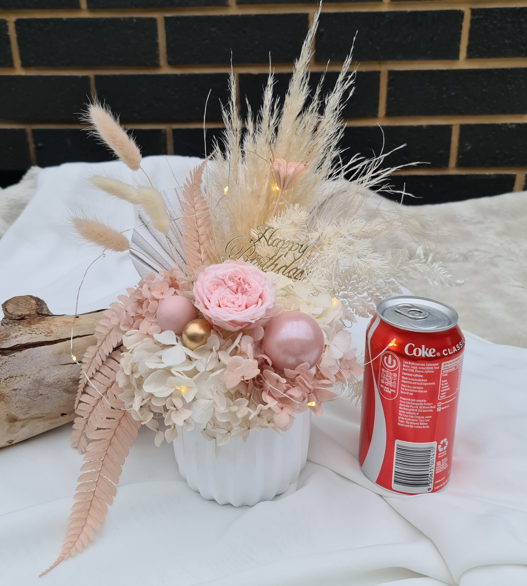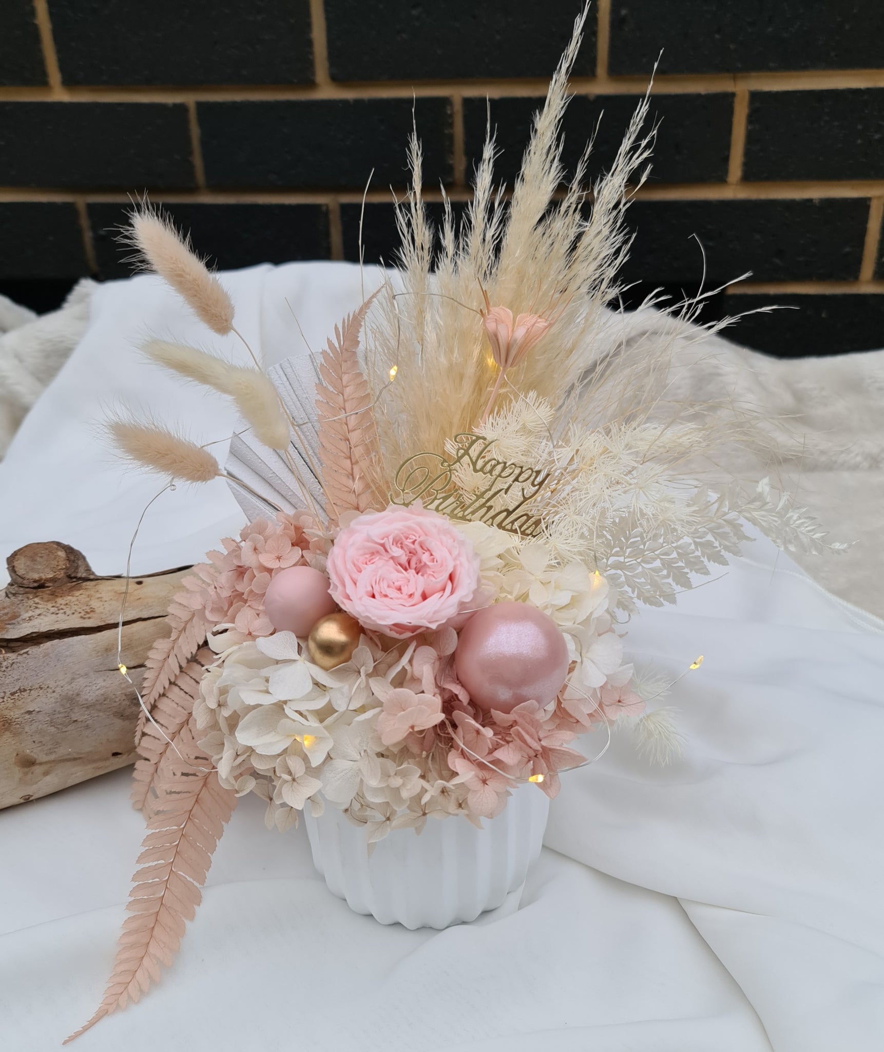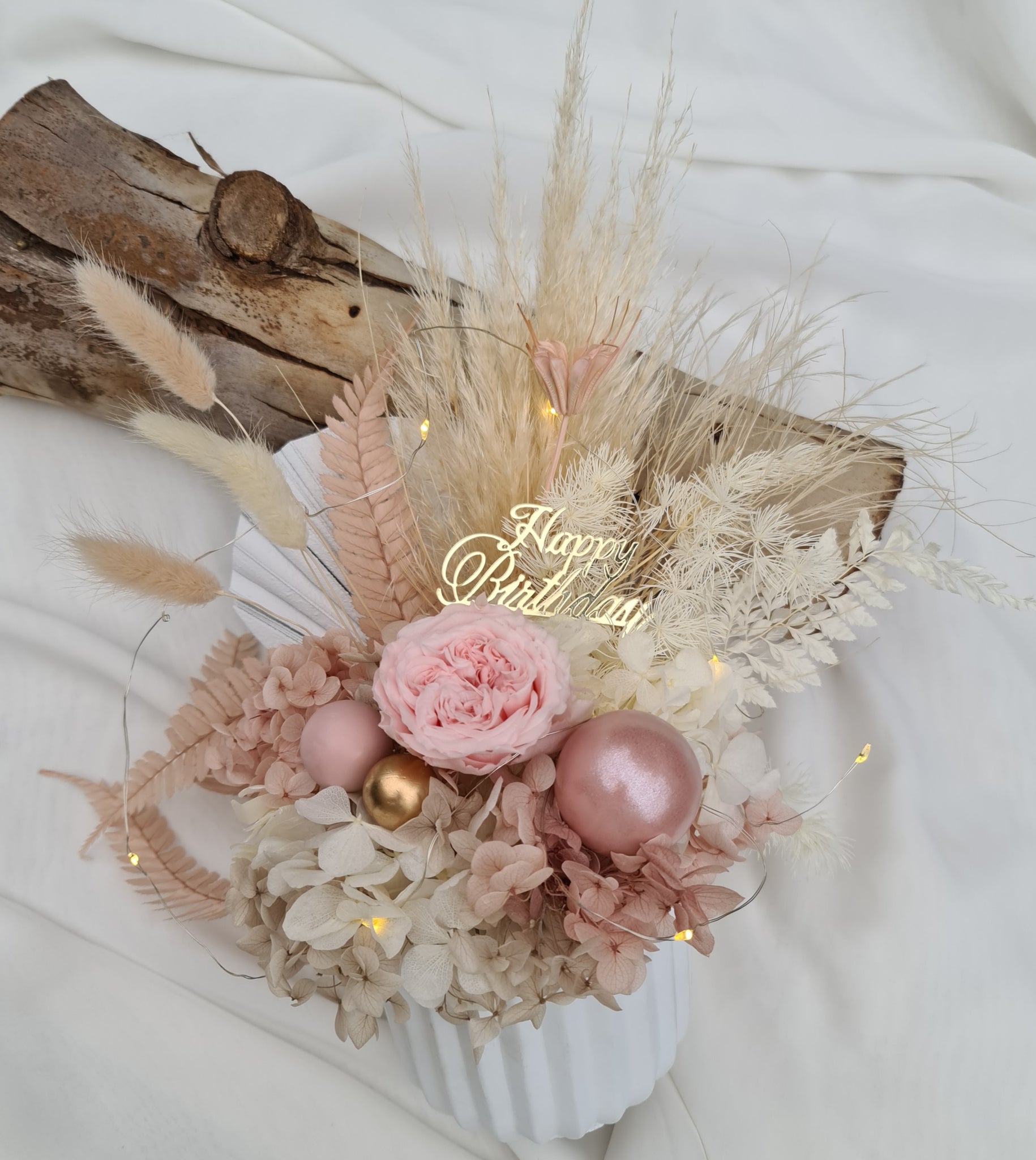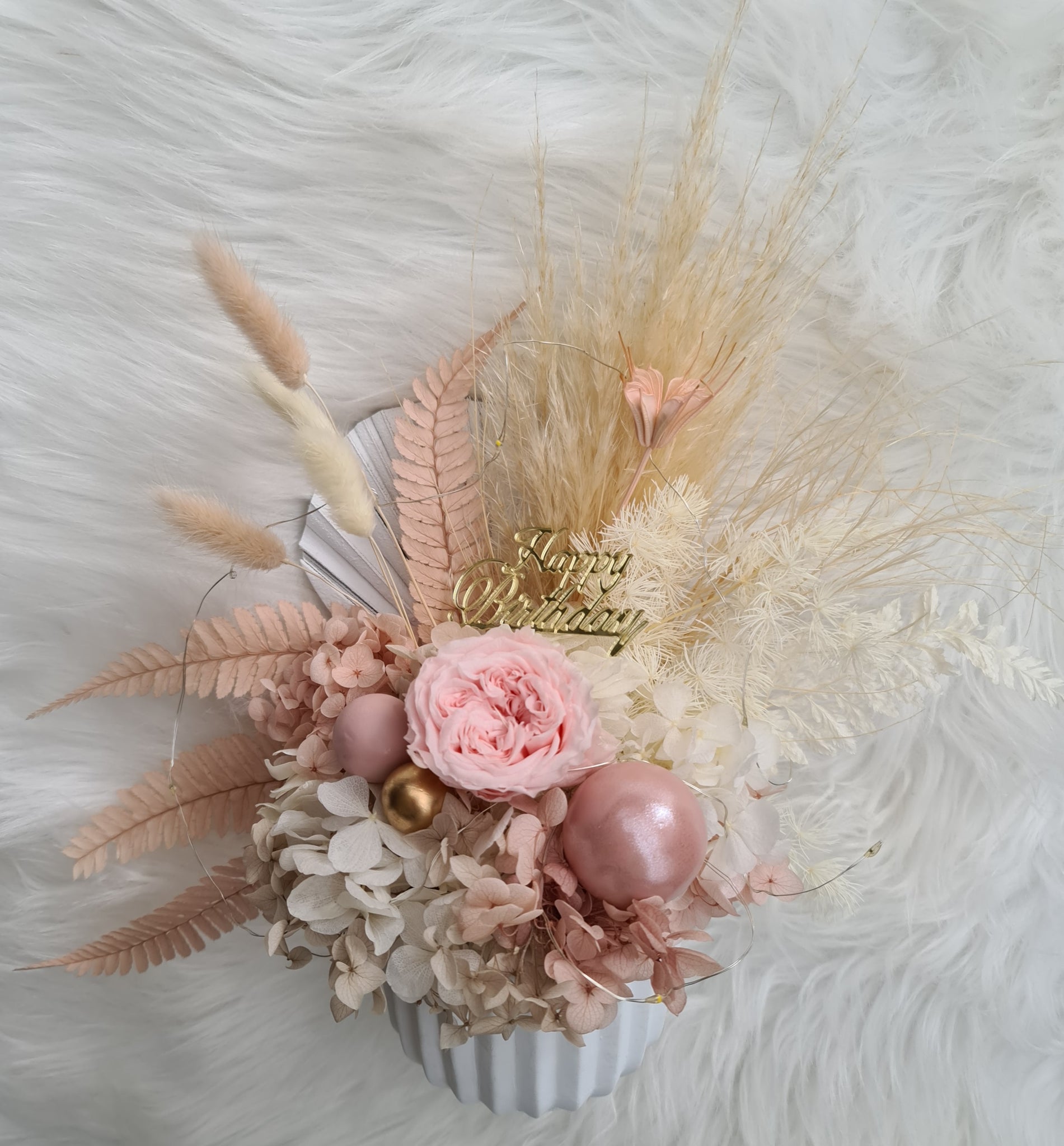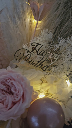 Happy Birthday preserved flowers in dusty pink, neutral & blush colours with preserved peony n lights