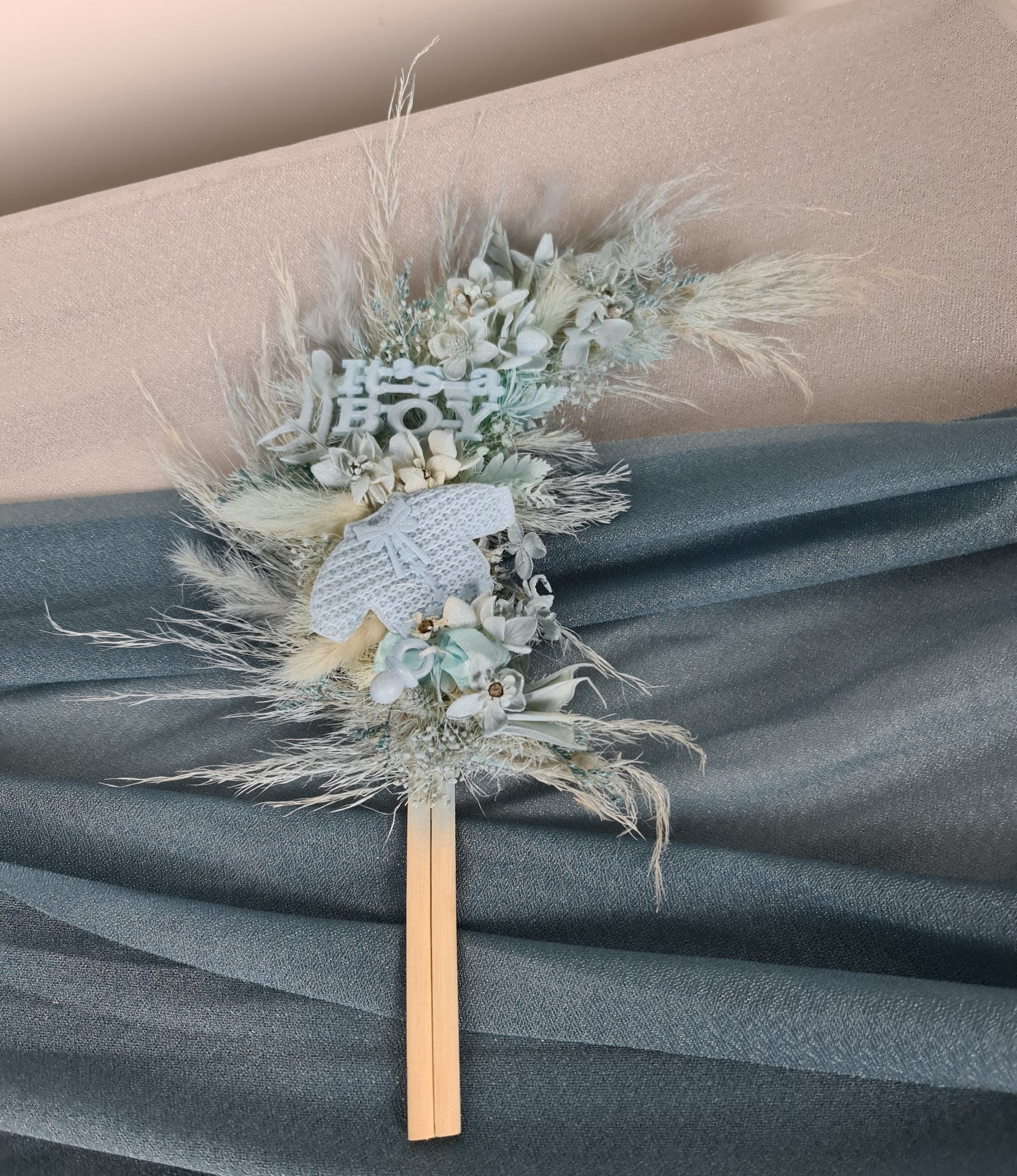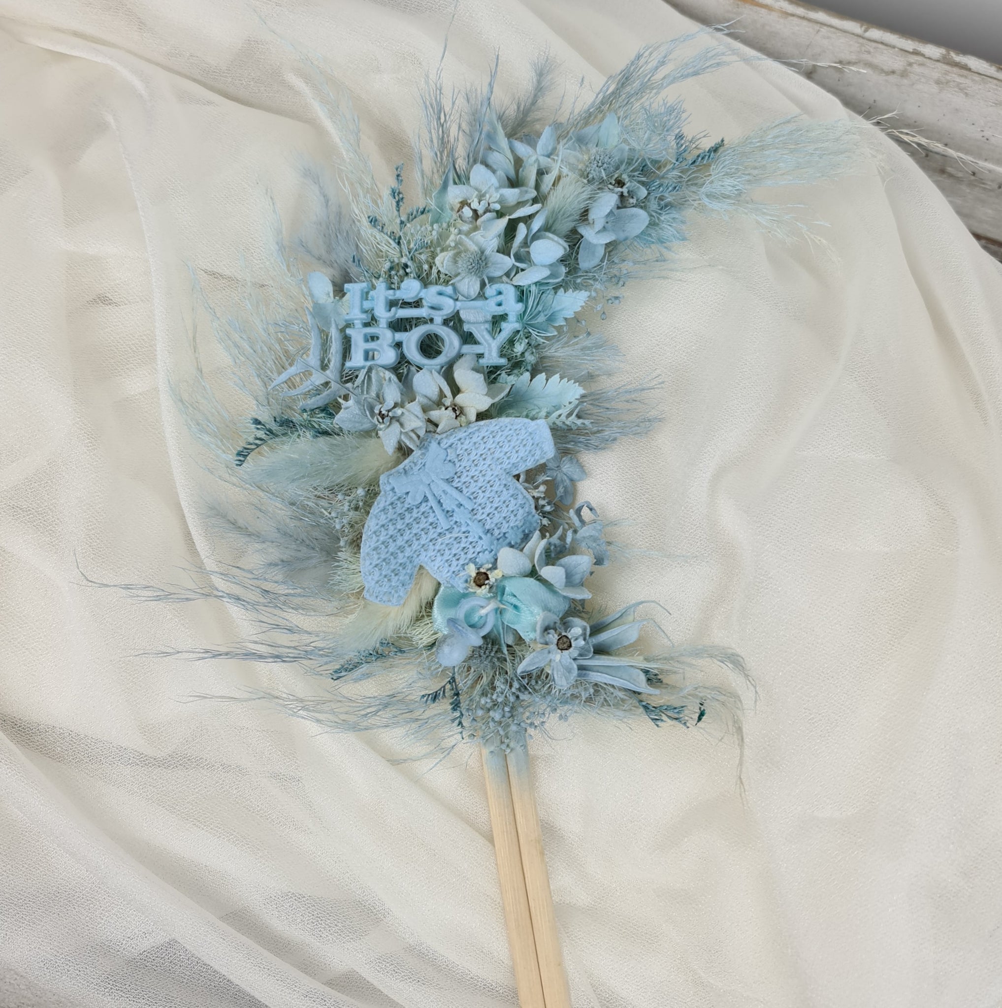 Preserved flowers with ‘It’s a Boy’ plaque, mini crochet jacket and blue dummy