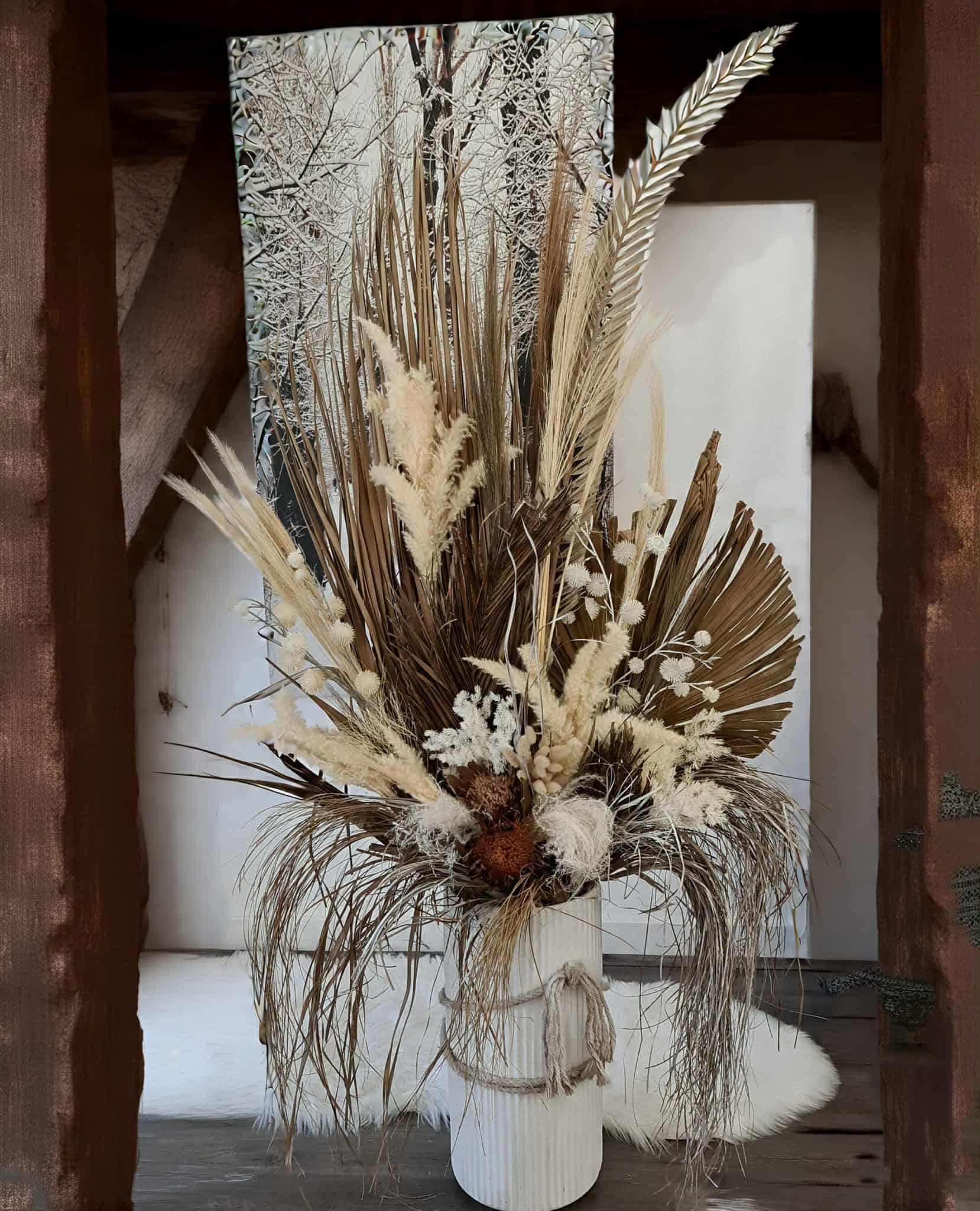 Combination of dry, preserved and silk flowers