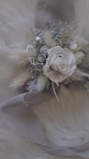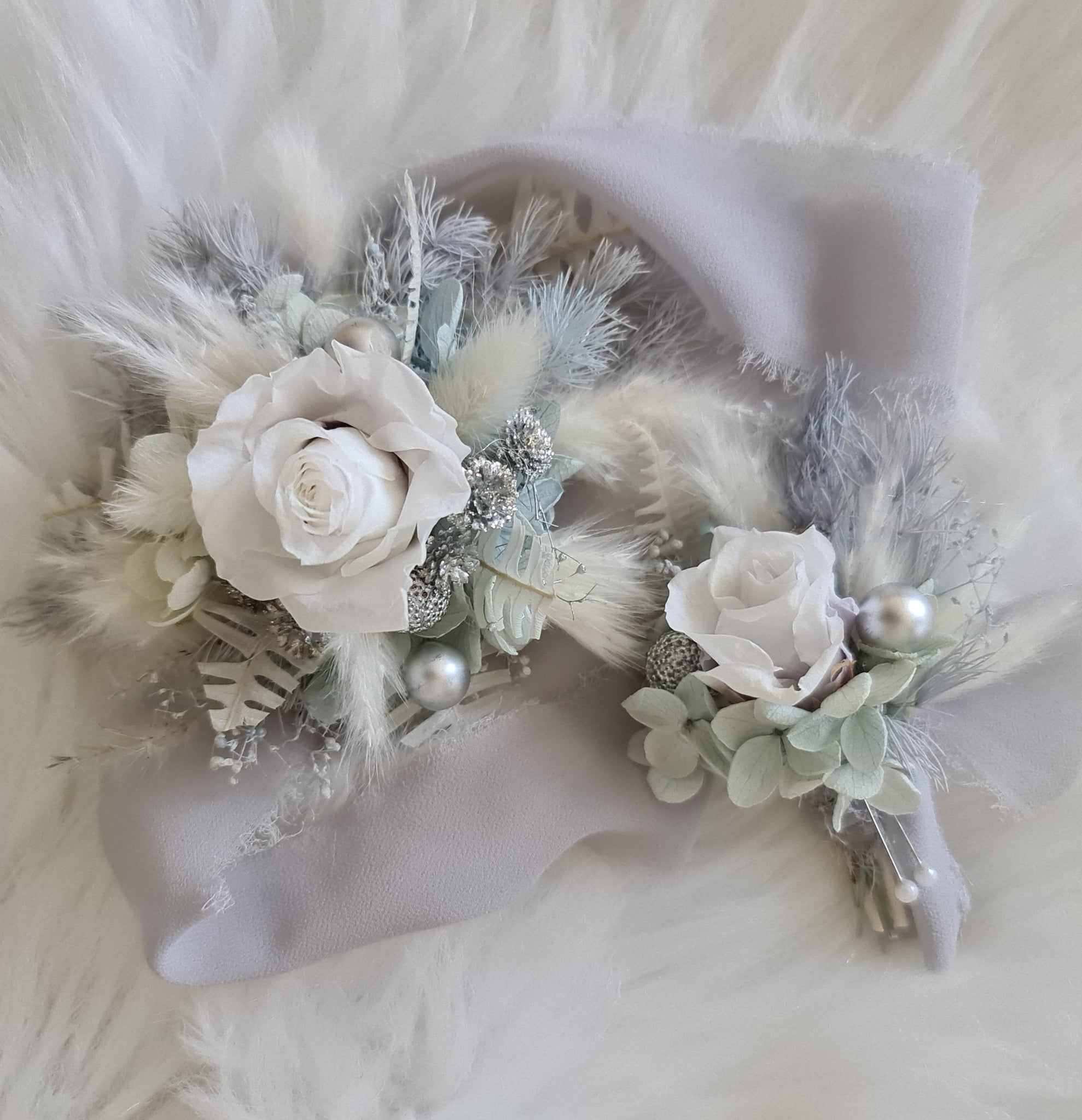 Preserved flowers corsage with mini preserved white rose & matching buttonhole