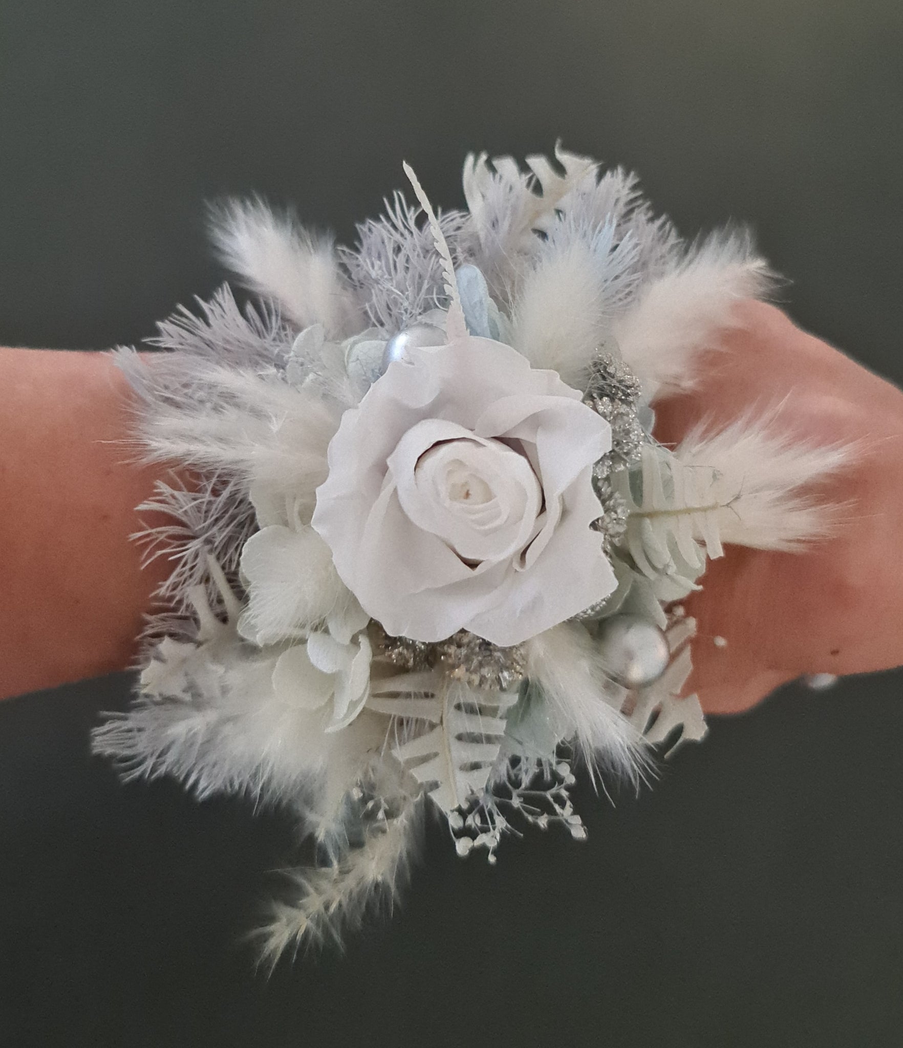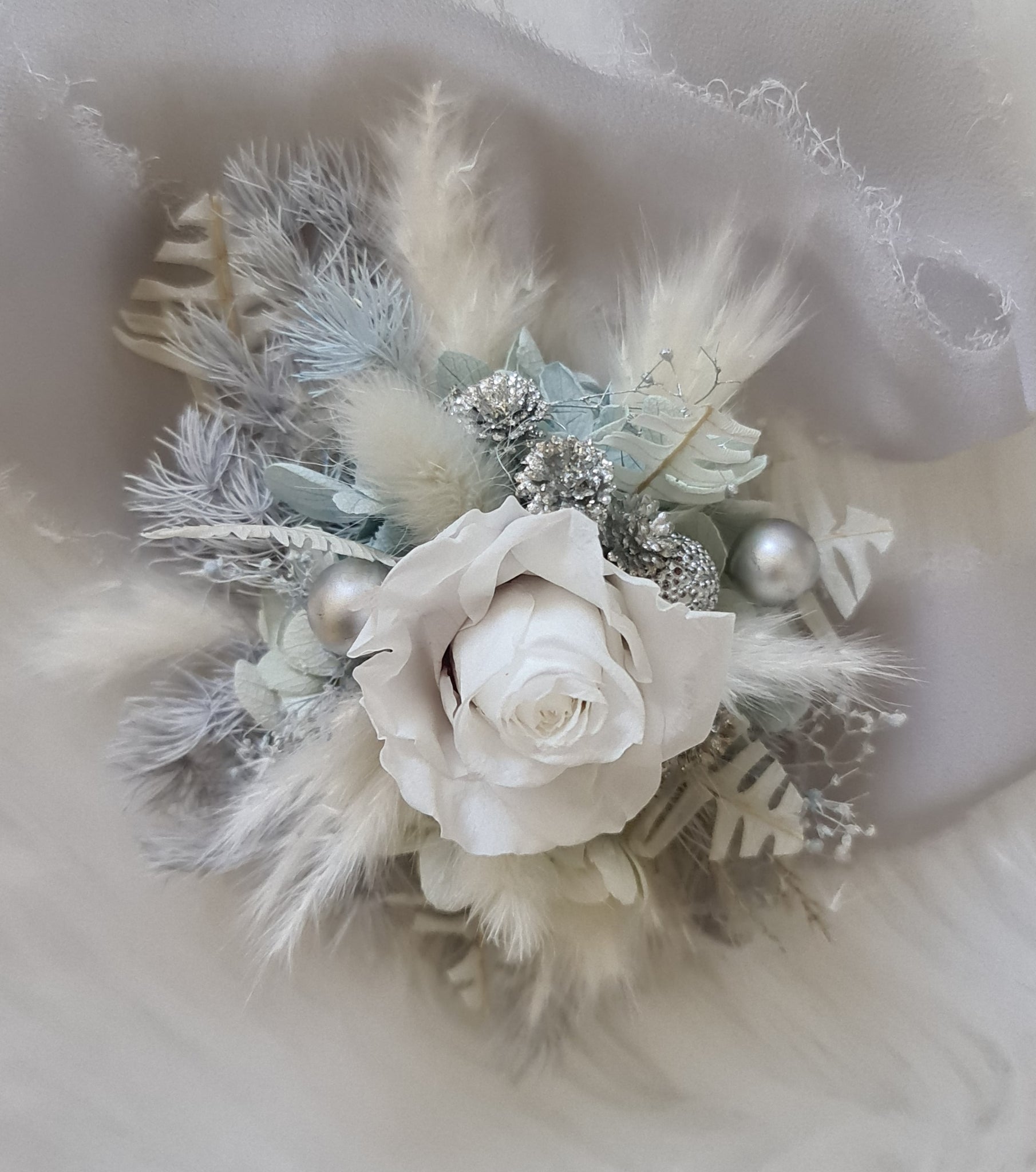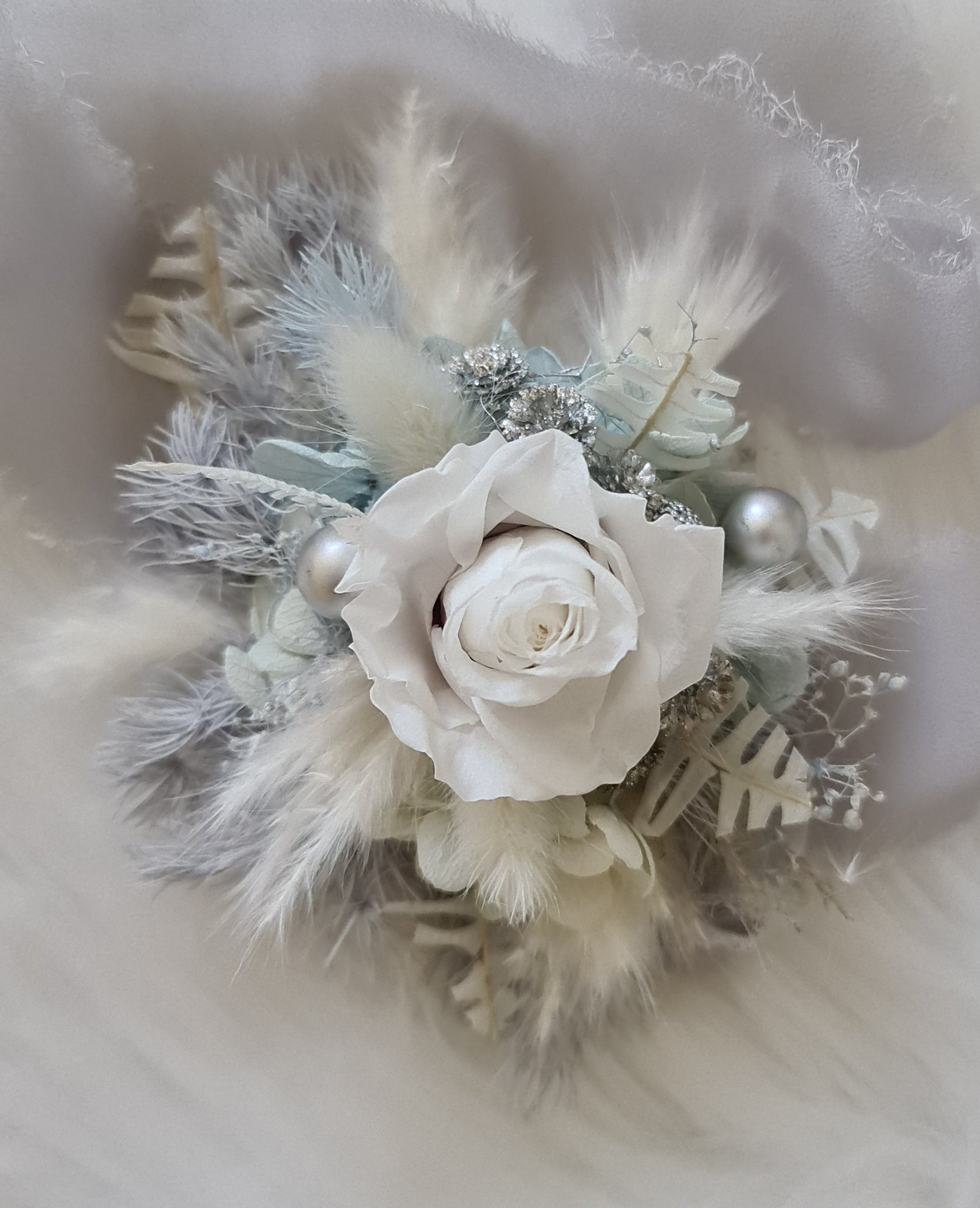 Mini preserved rose corsage & buttonhole – baby blue, grey, white – school formal