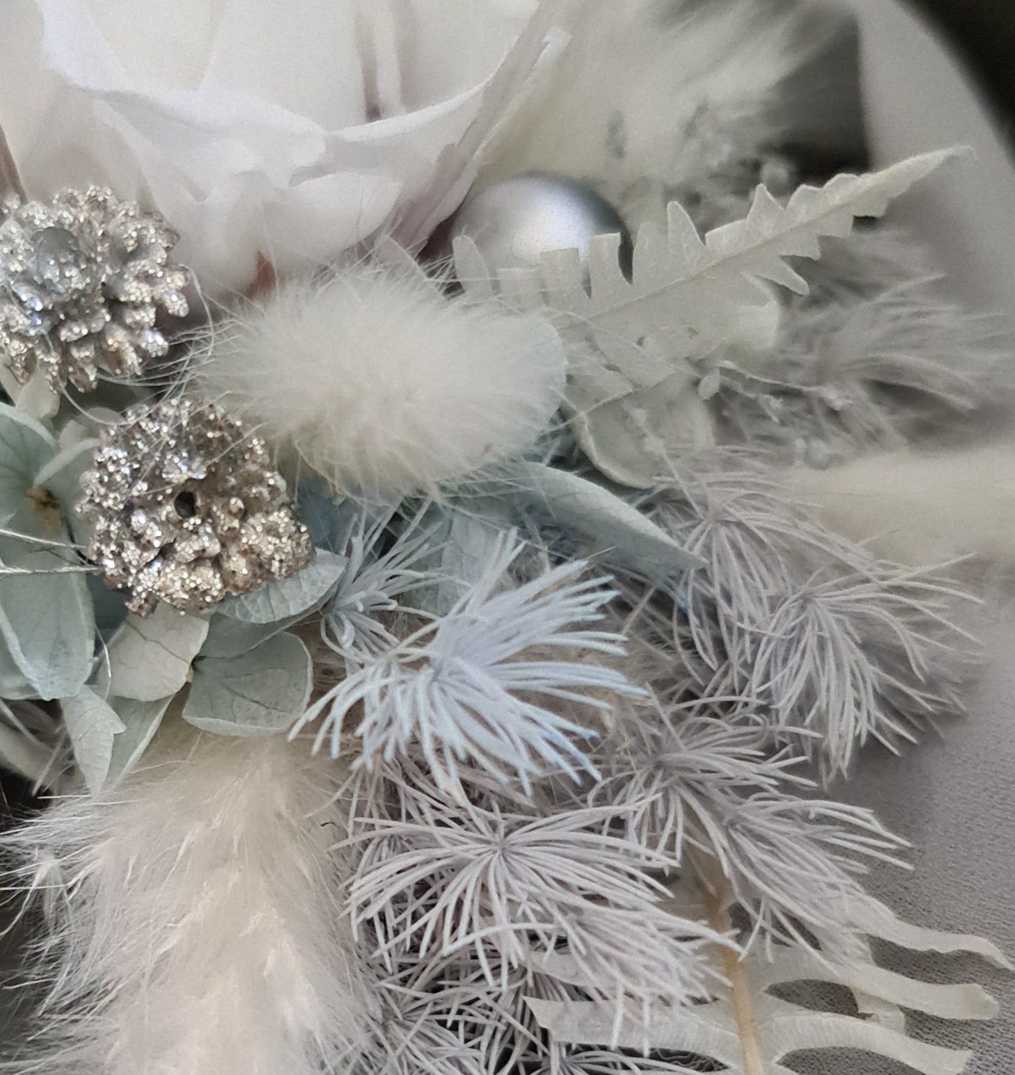 Combination of preserved flowers in blue, grey and white tones with pearls & glitter beads