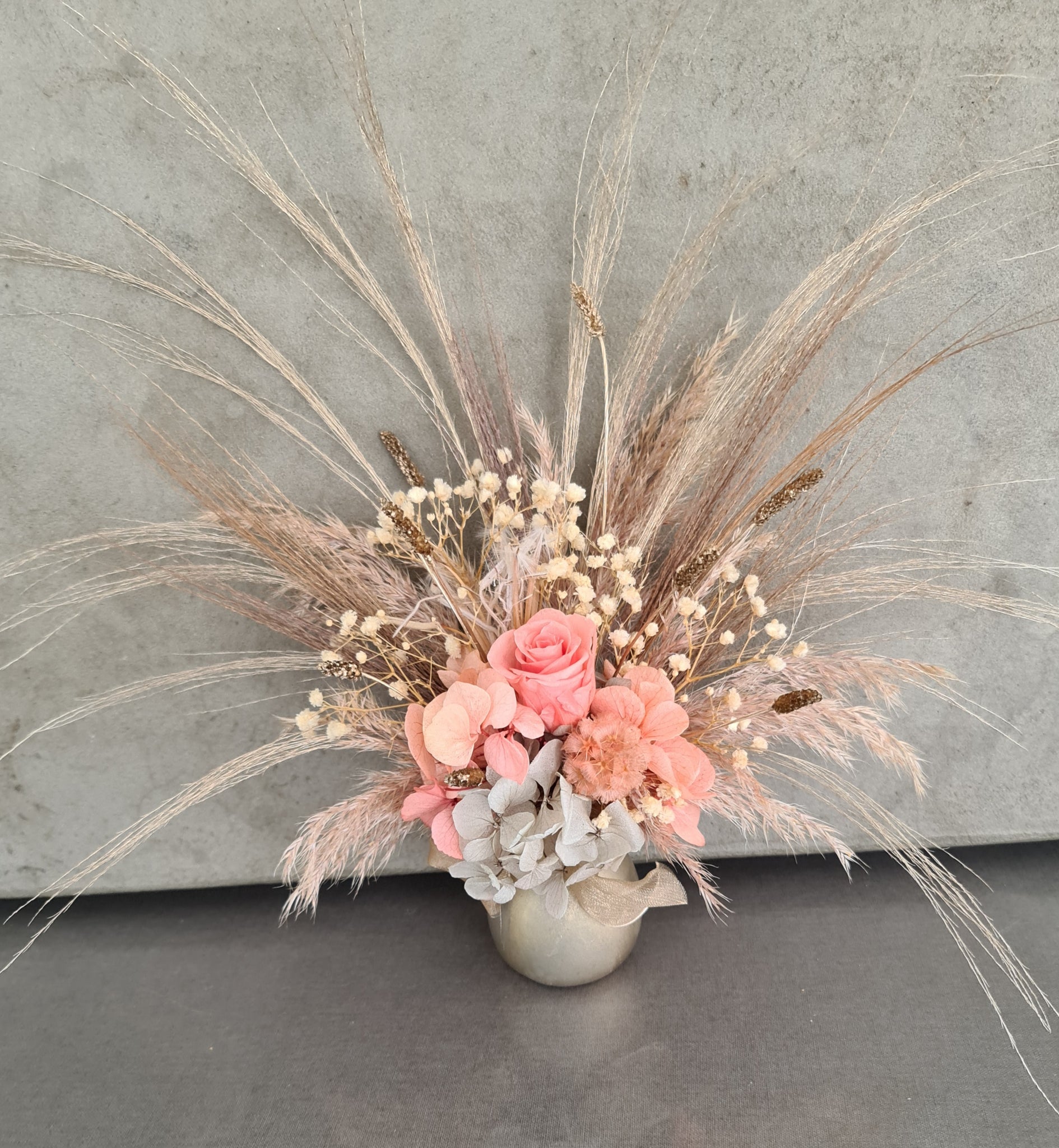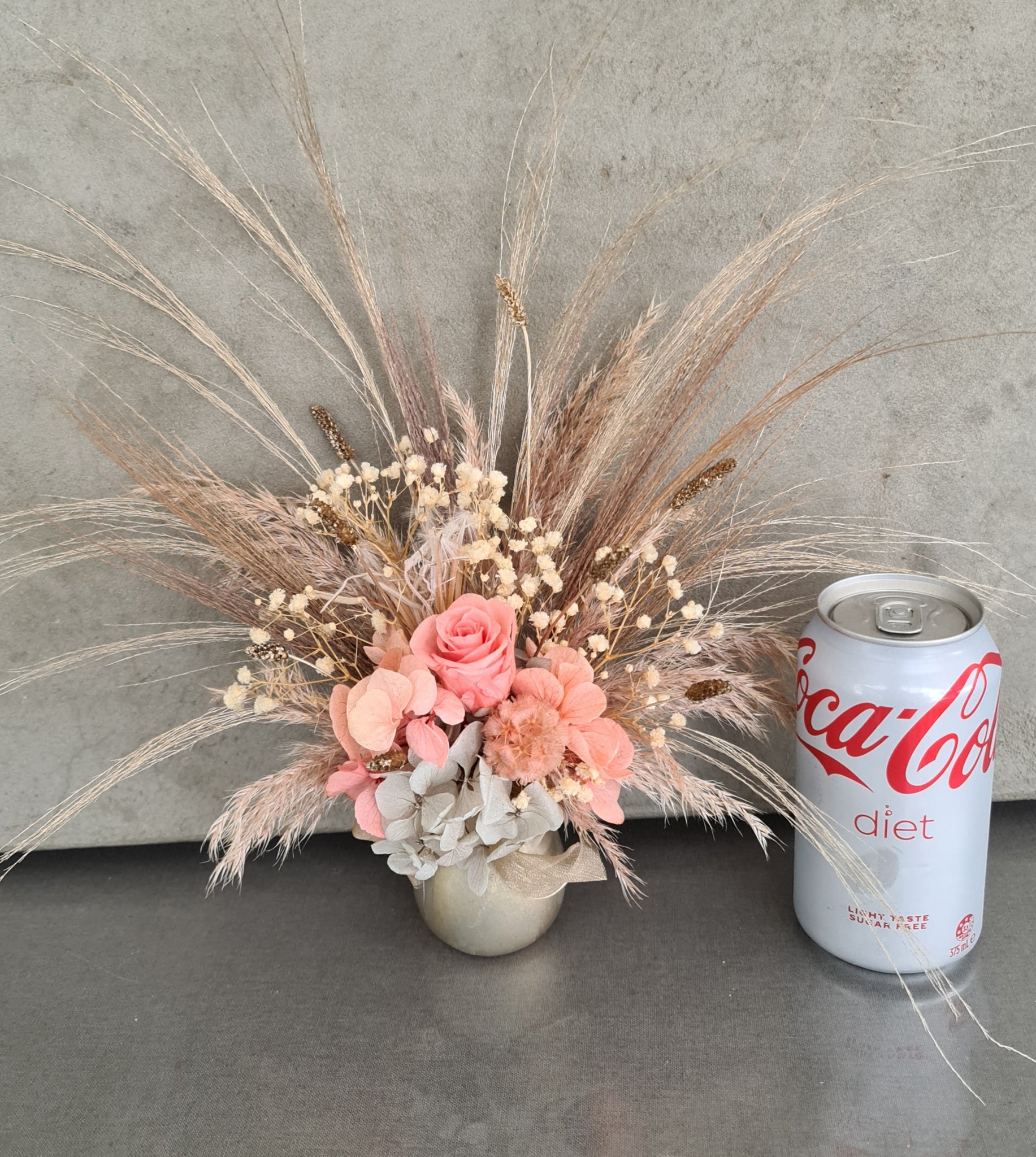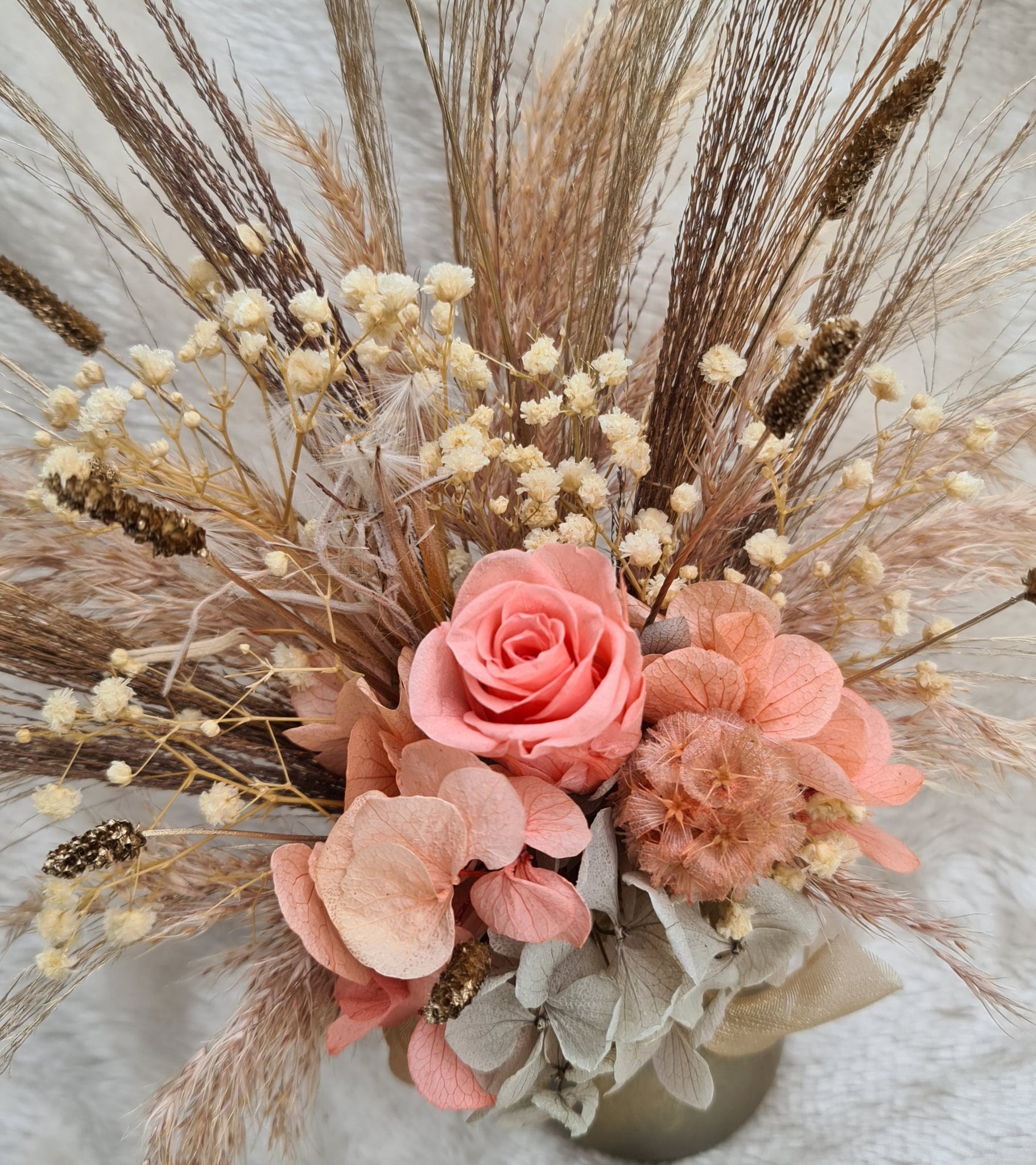 Mini flower arrangement with preserved rose, hydrangeas and broom sticks in champagne gold colour