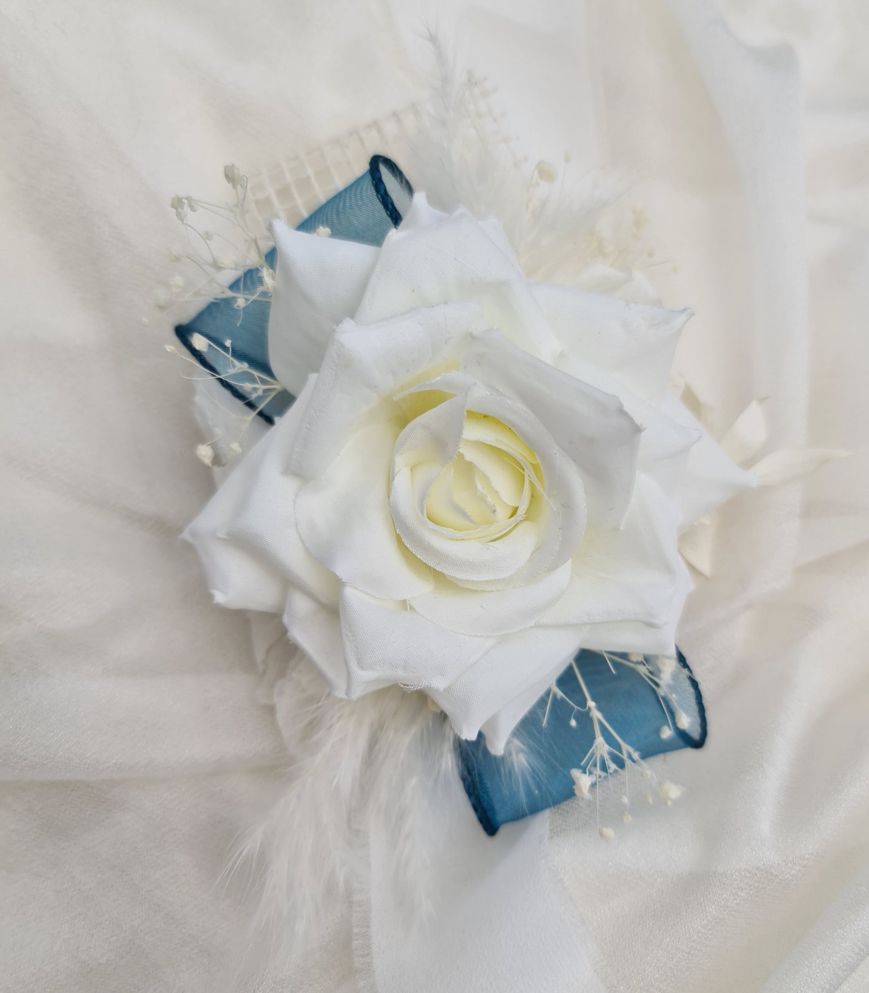 White / Off White corsage combination of silk rose and preserved flowers with blue/emerald ribbon