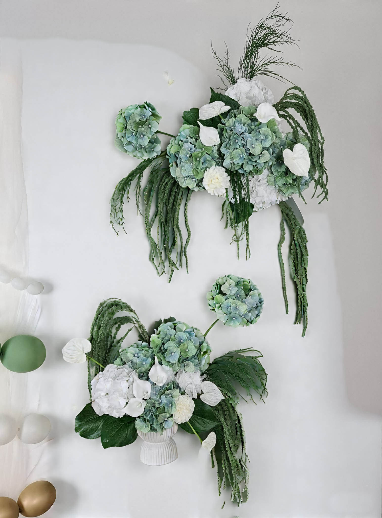 Large Green & white hanging flowers can be attached to backdrop, arch, arbour