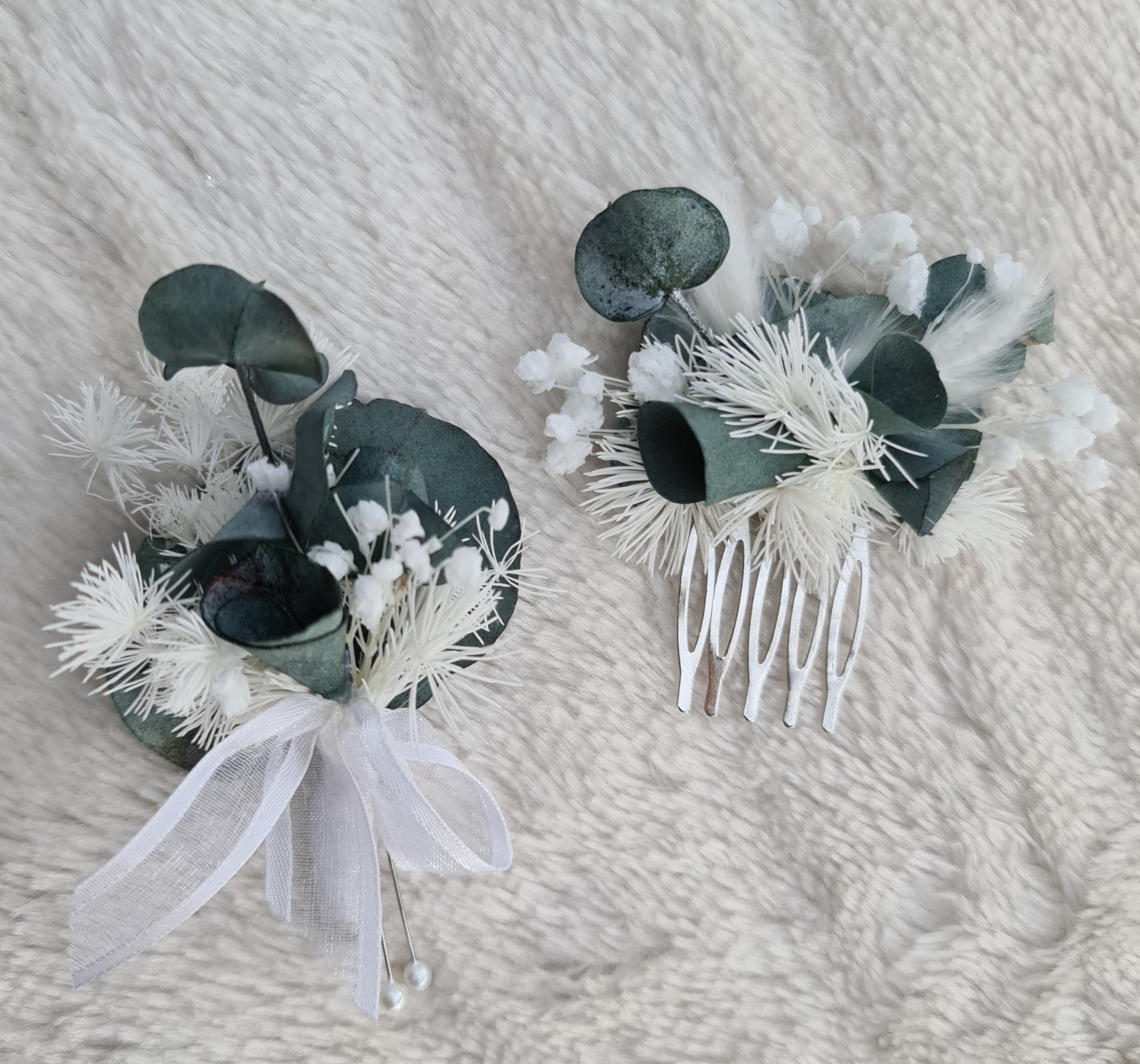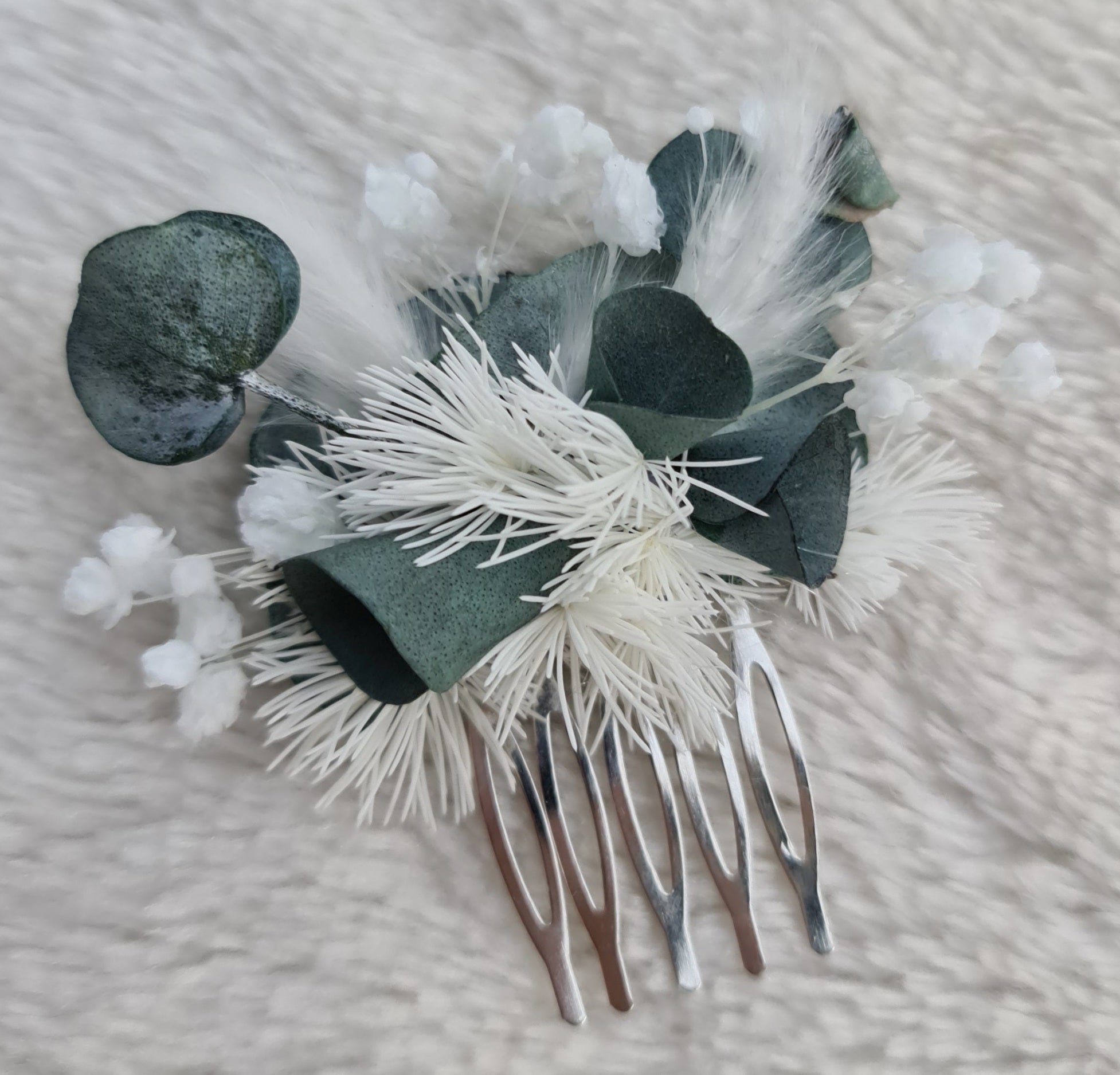 Comb – preserved dollar gum, baby’s breath & ming fern