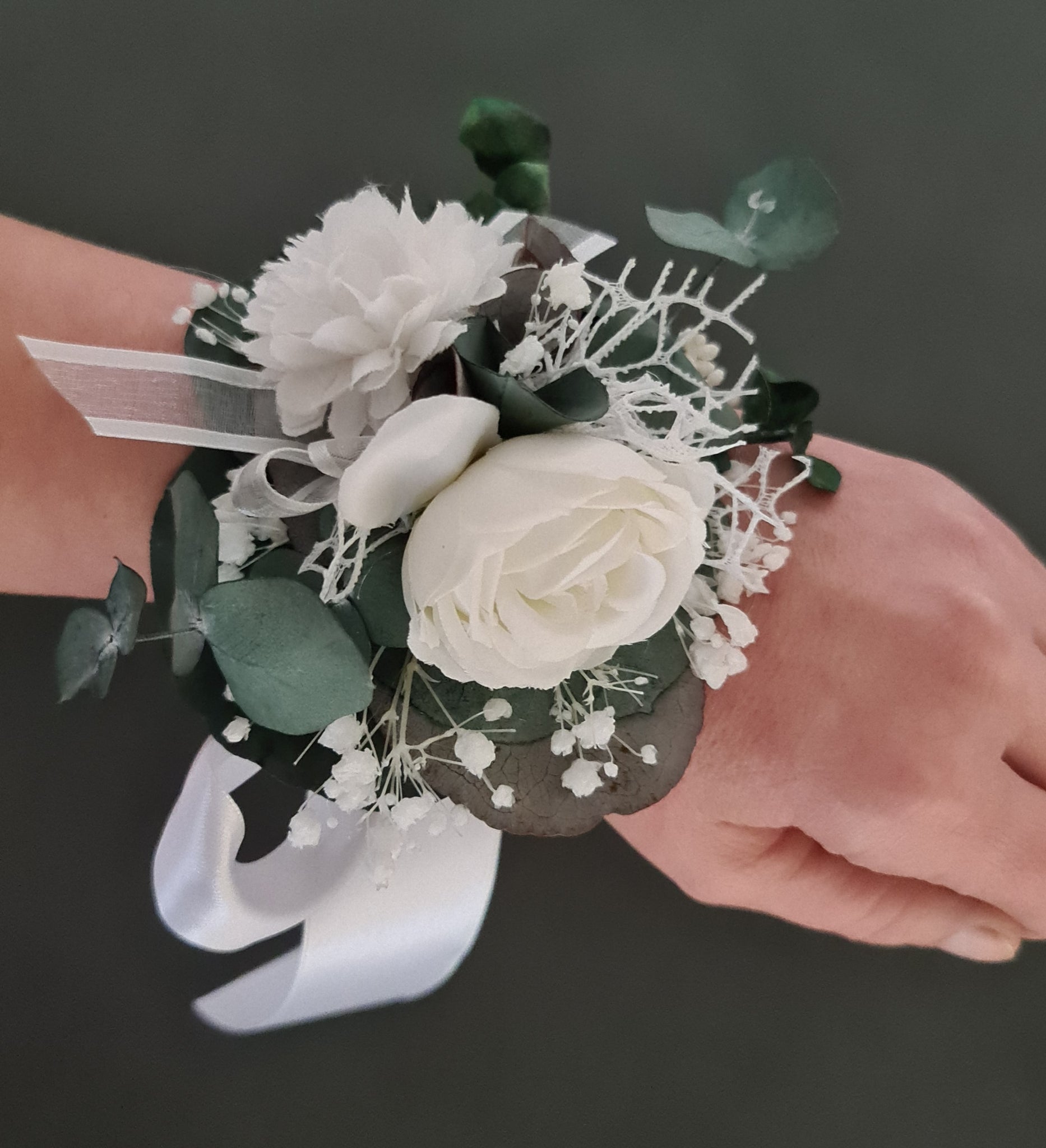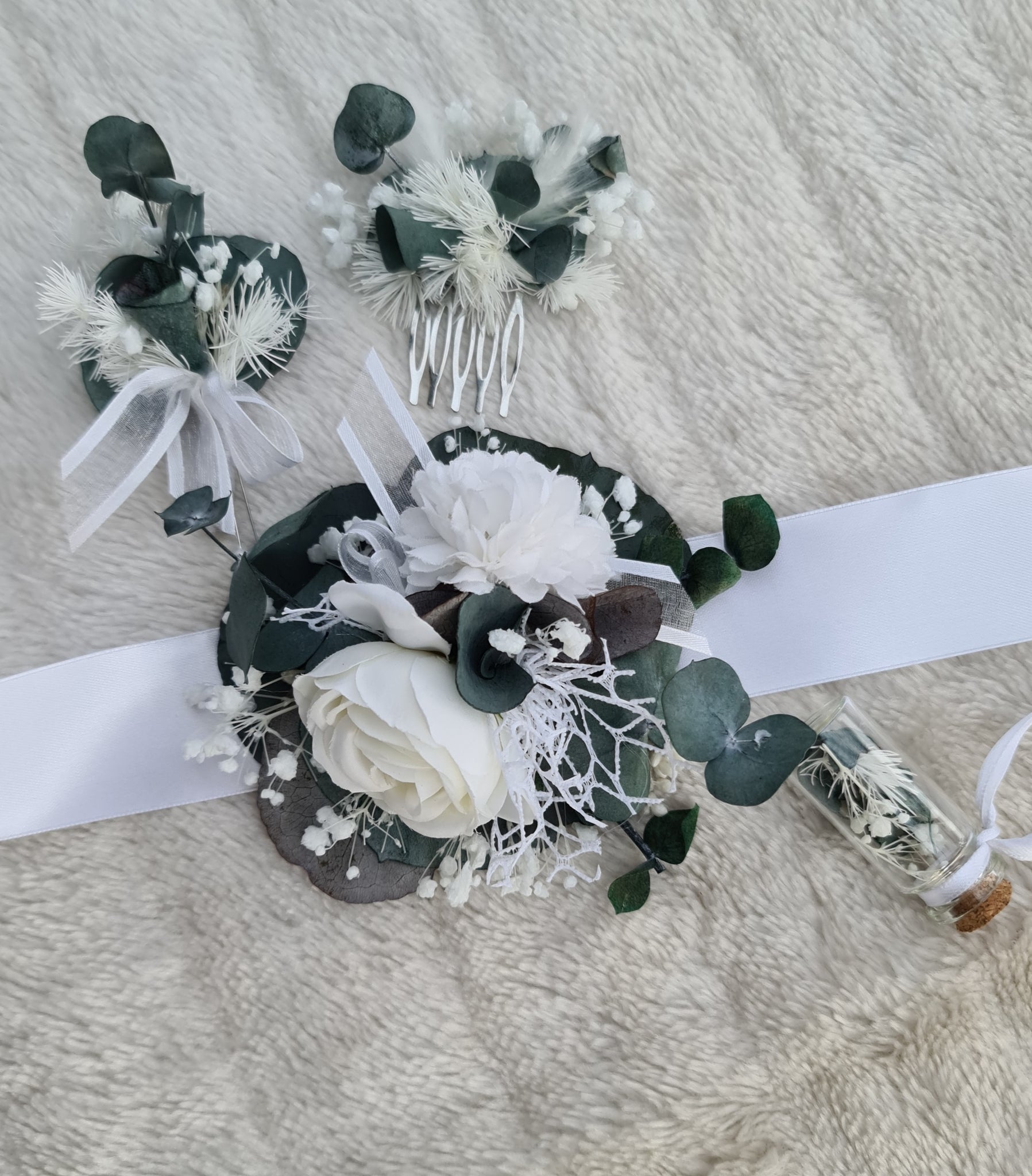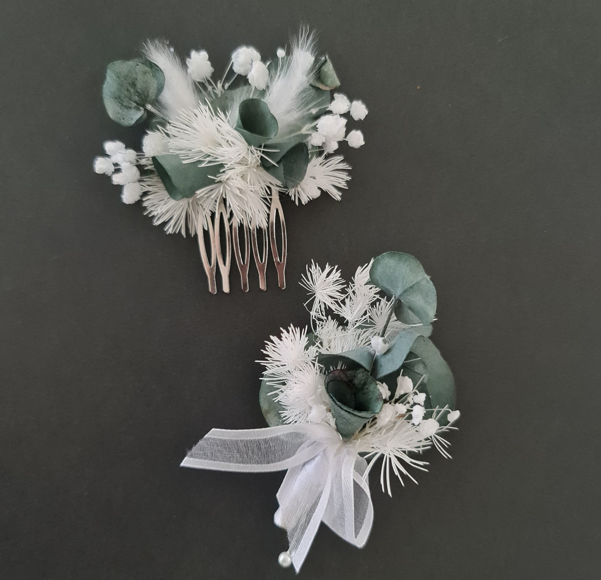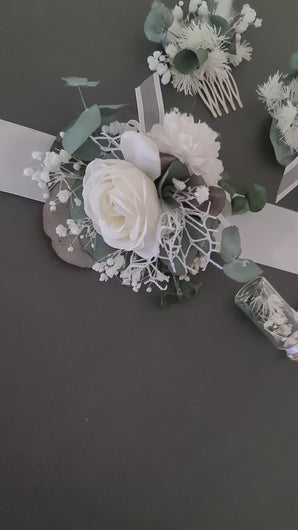 Preserved flowers White & green School prom set – corsage, buttonhole & hair comb