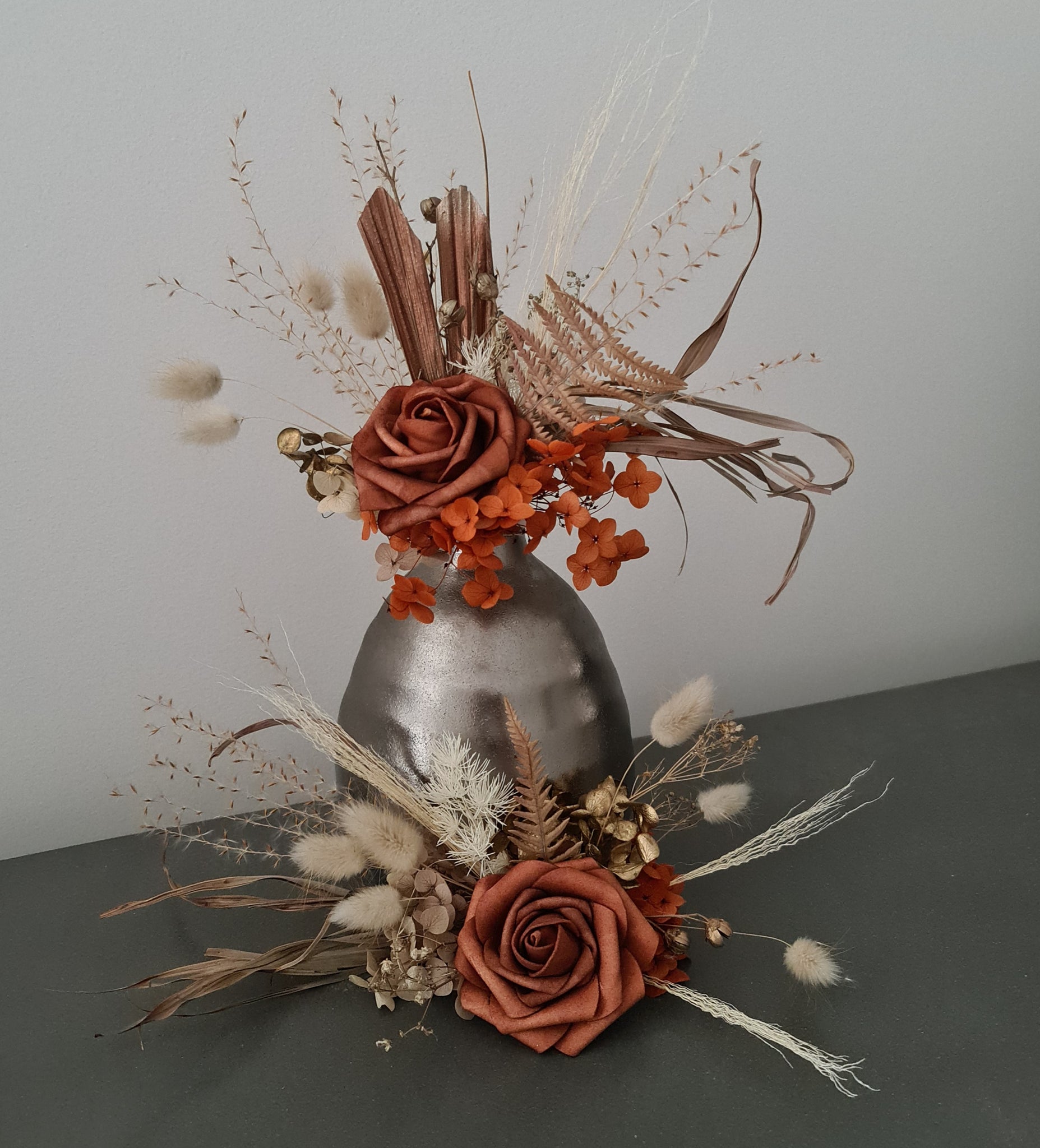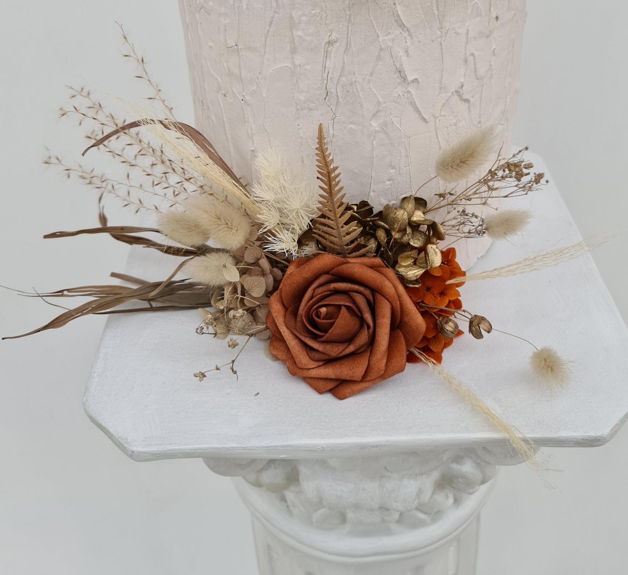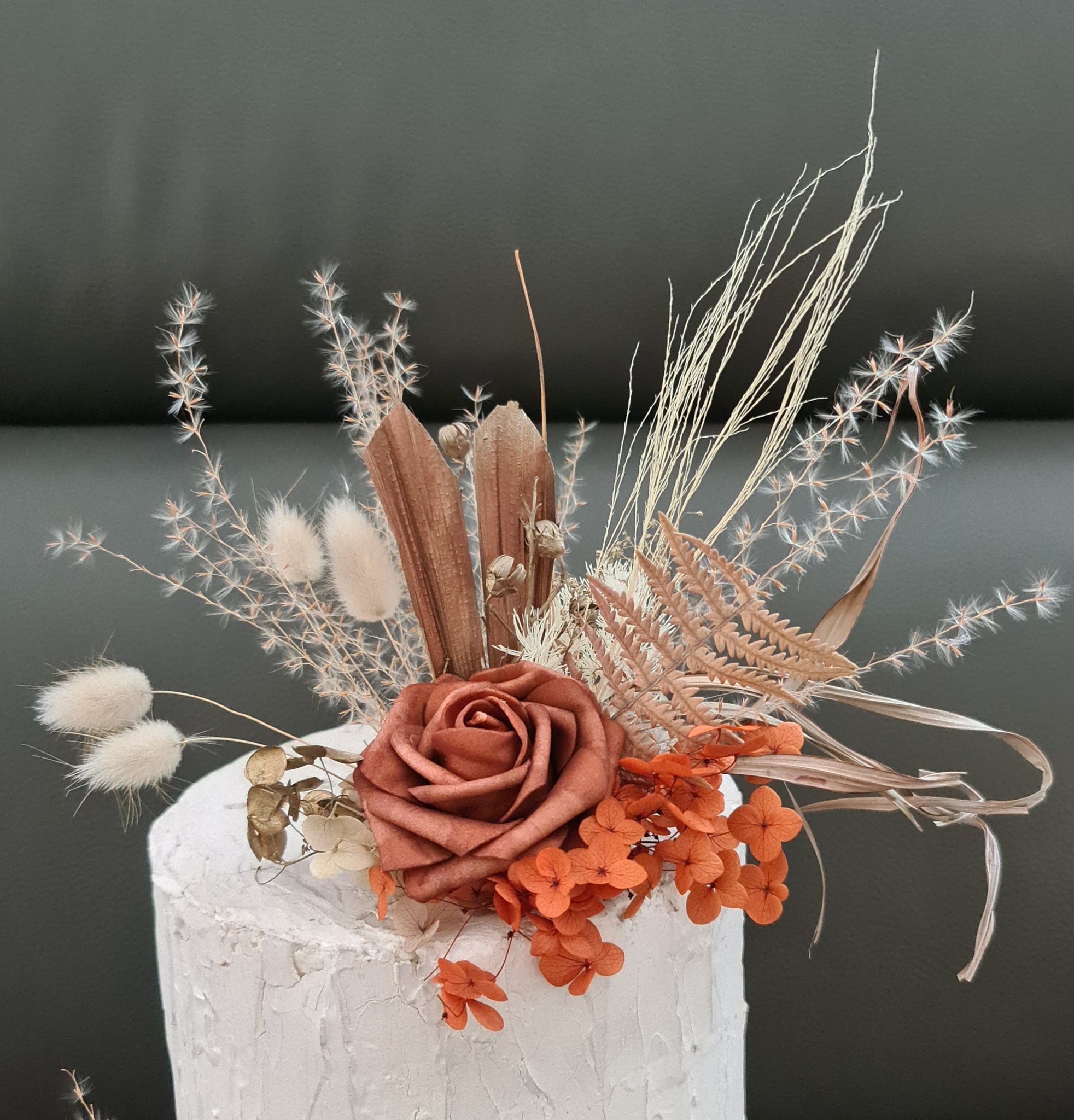 Unique rustic style double cake topper in copper, gold, orange and neutral tones