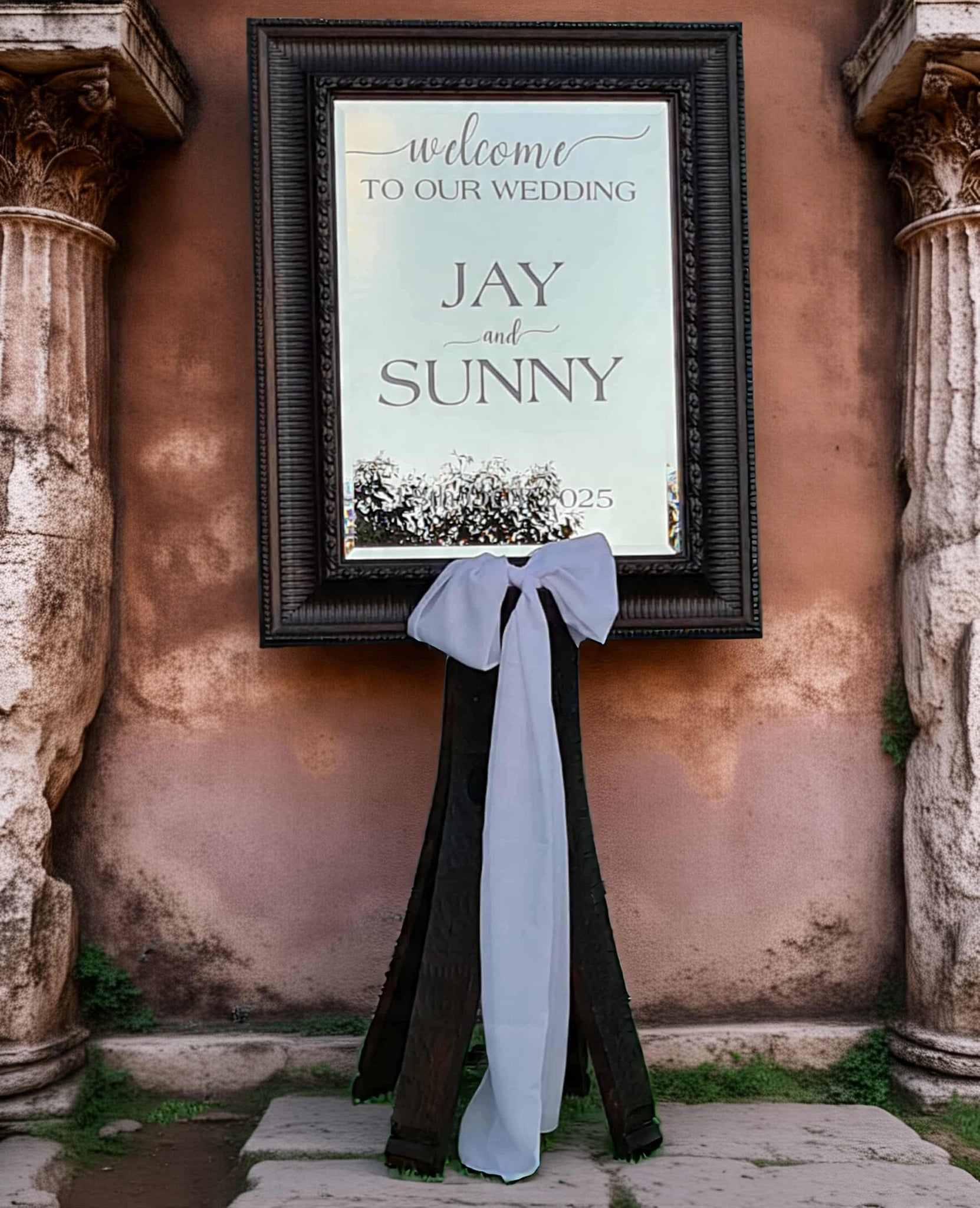 Stand can hold rustic mirror as welcome sign (mirror is additional $20 to hire), decals on the mirror available at extra cost.