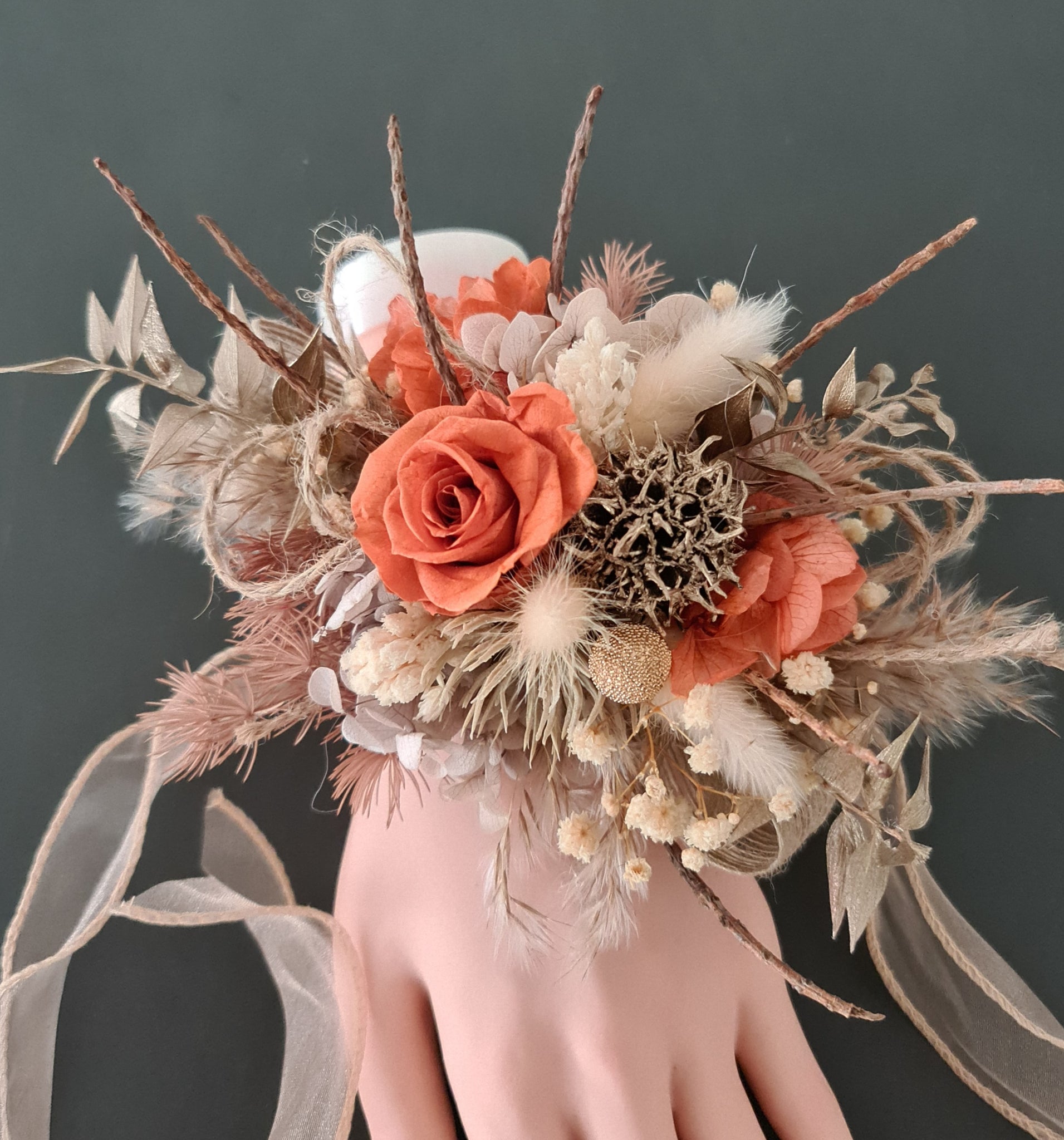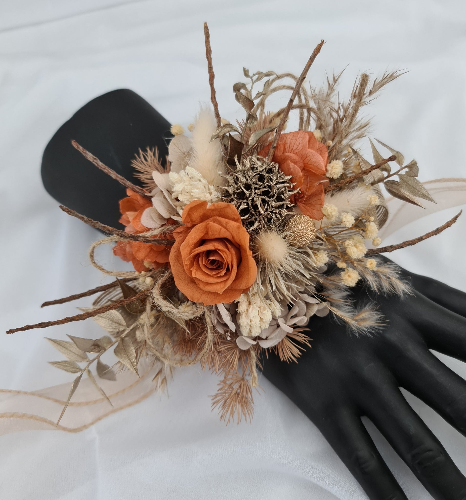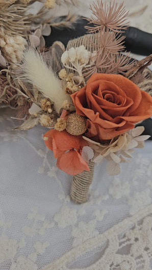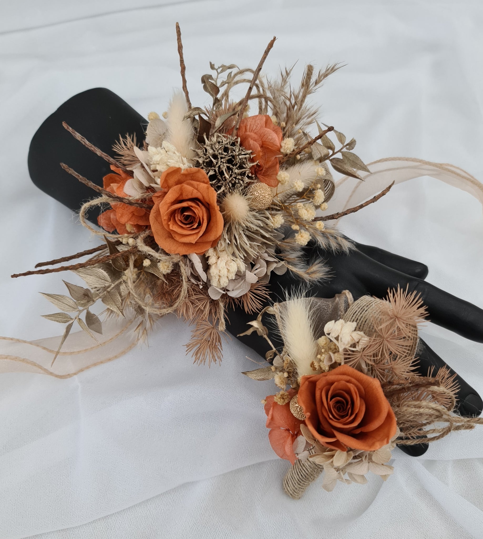 Unique rustic style preserved flowers corsage and matching boutonniere set with preserved mini roses in orange colour and dry twigs
