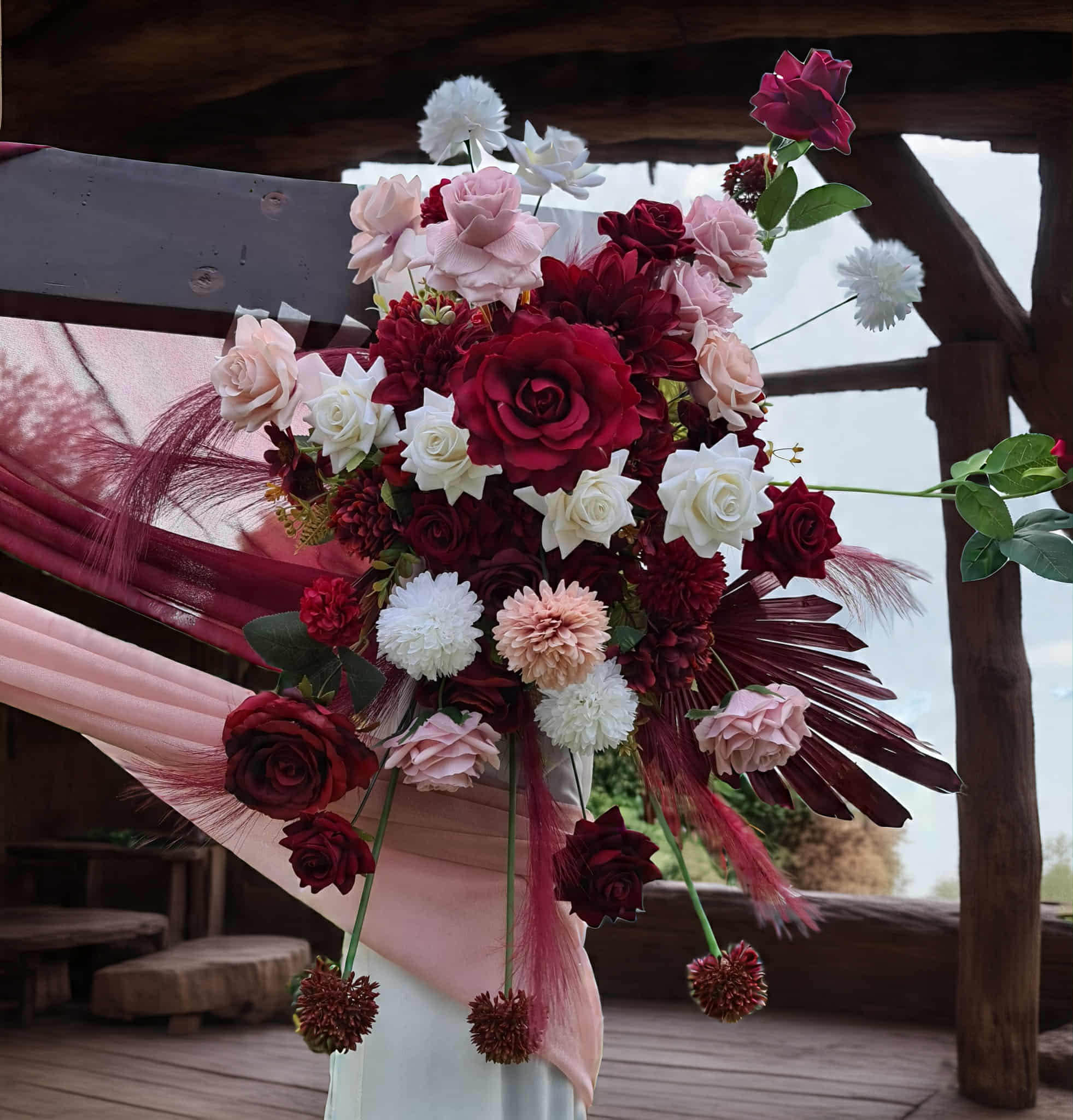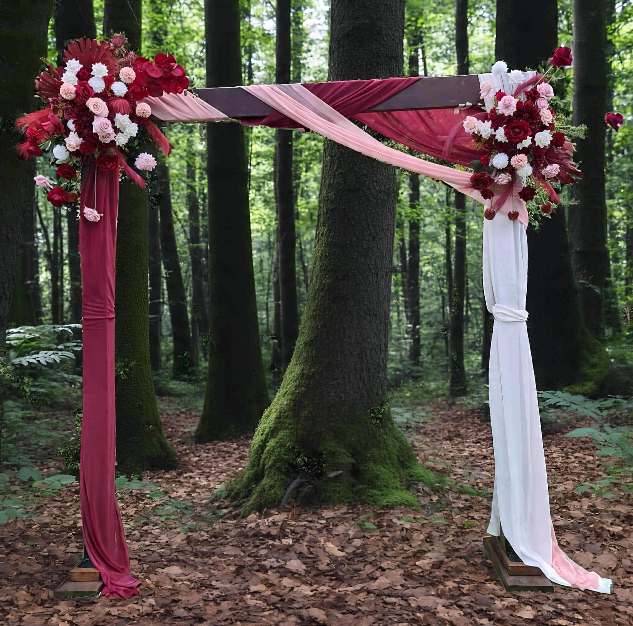 Rustic wooden arbour & 2 x red, pink & white flowers