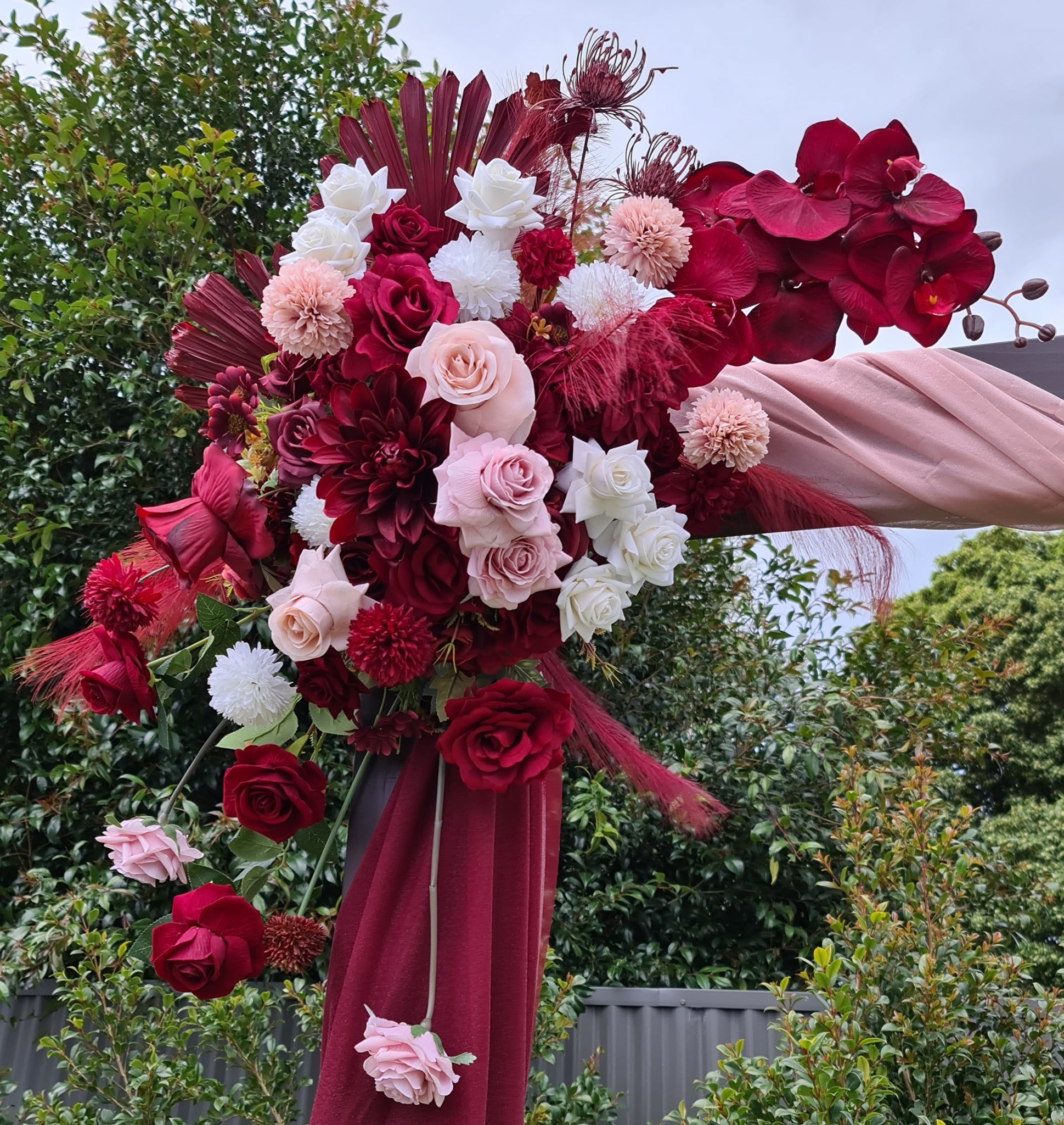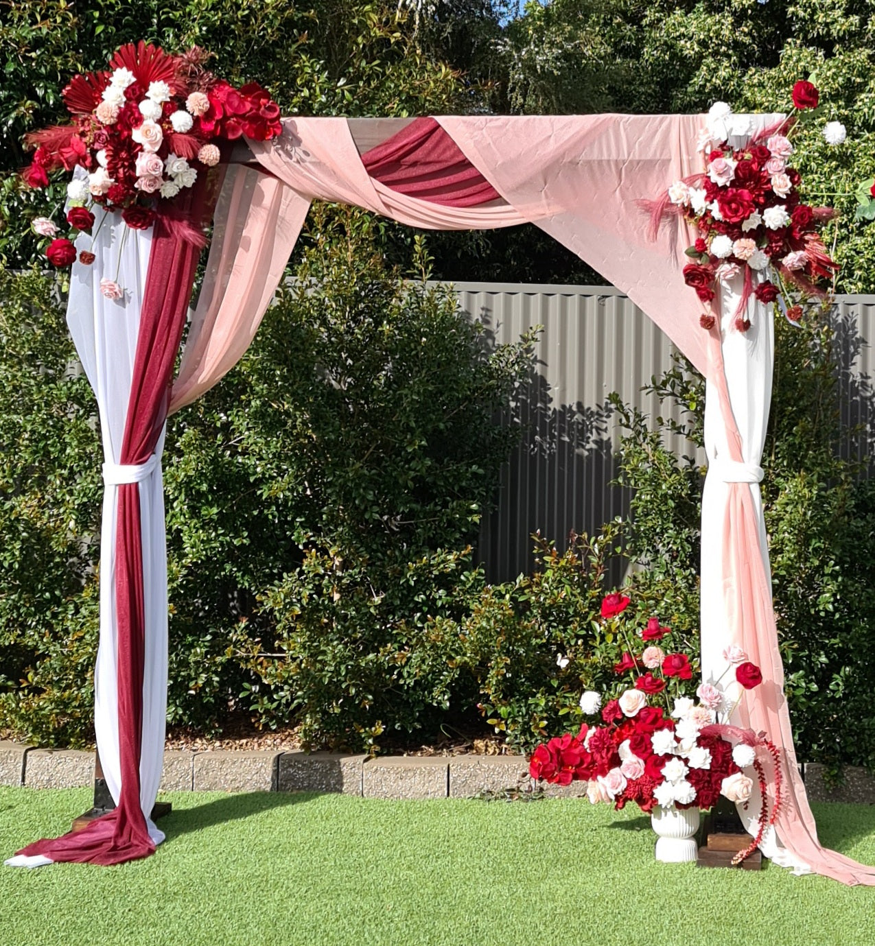 Rustic wooden arbour & 3 x red, pink & white flowers