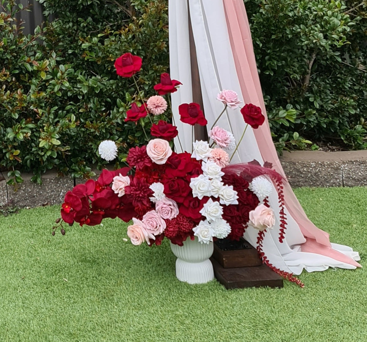 - Burgundy, Pink & white floor / plinth flowers in white ribbed pot ABH443 - $75