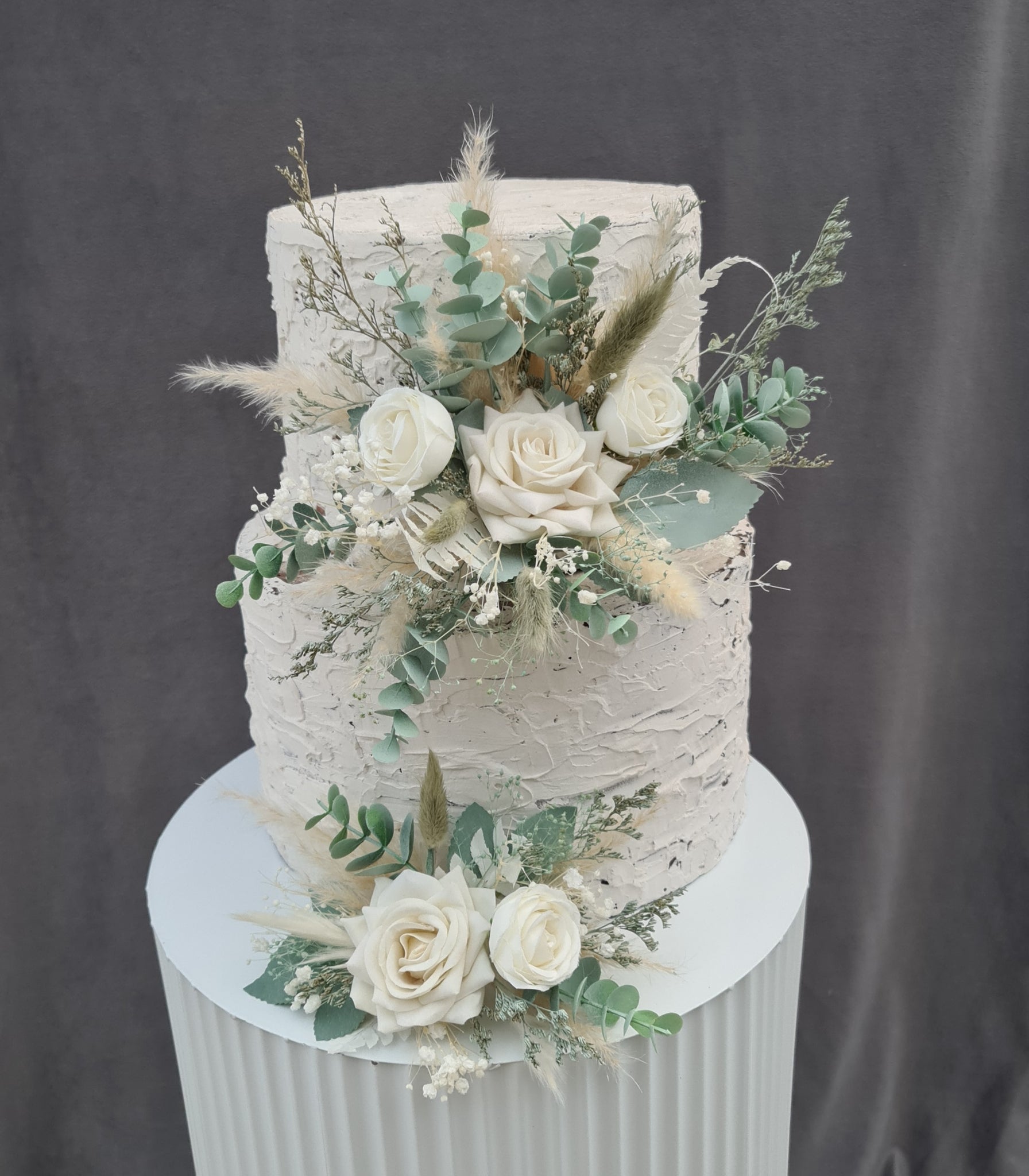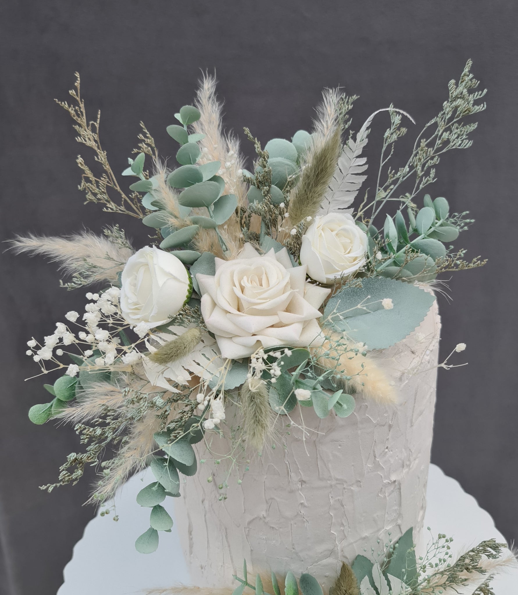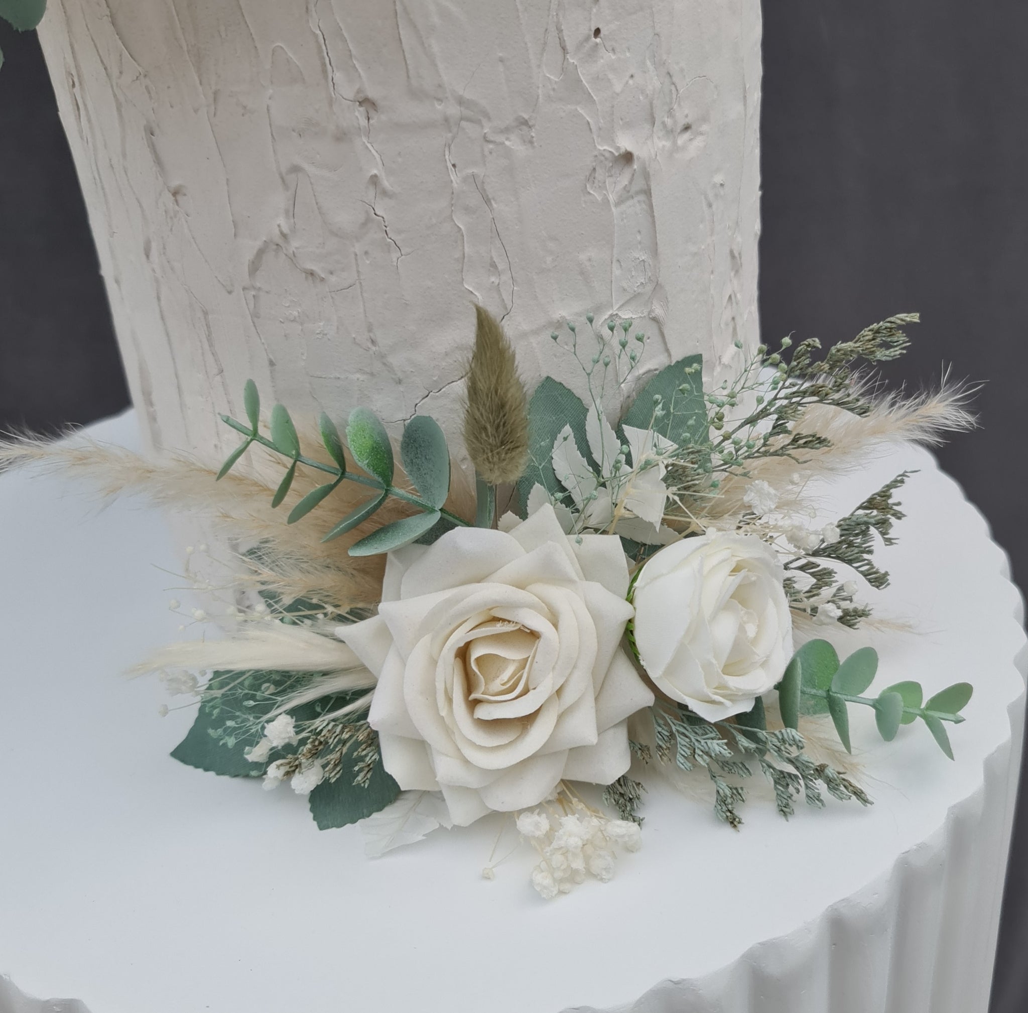 Top flowers have plastic sleeve insert for protection. Can be safely inserted in the cake