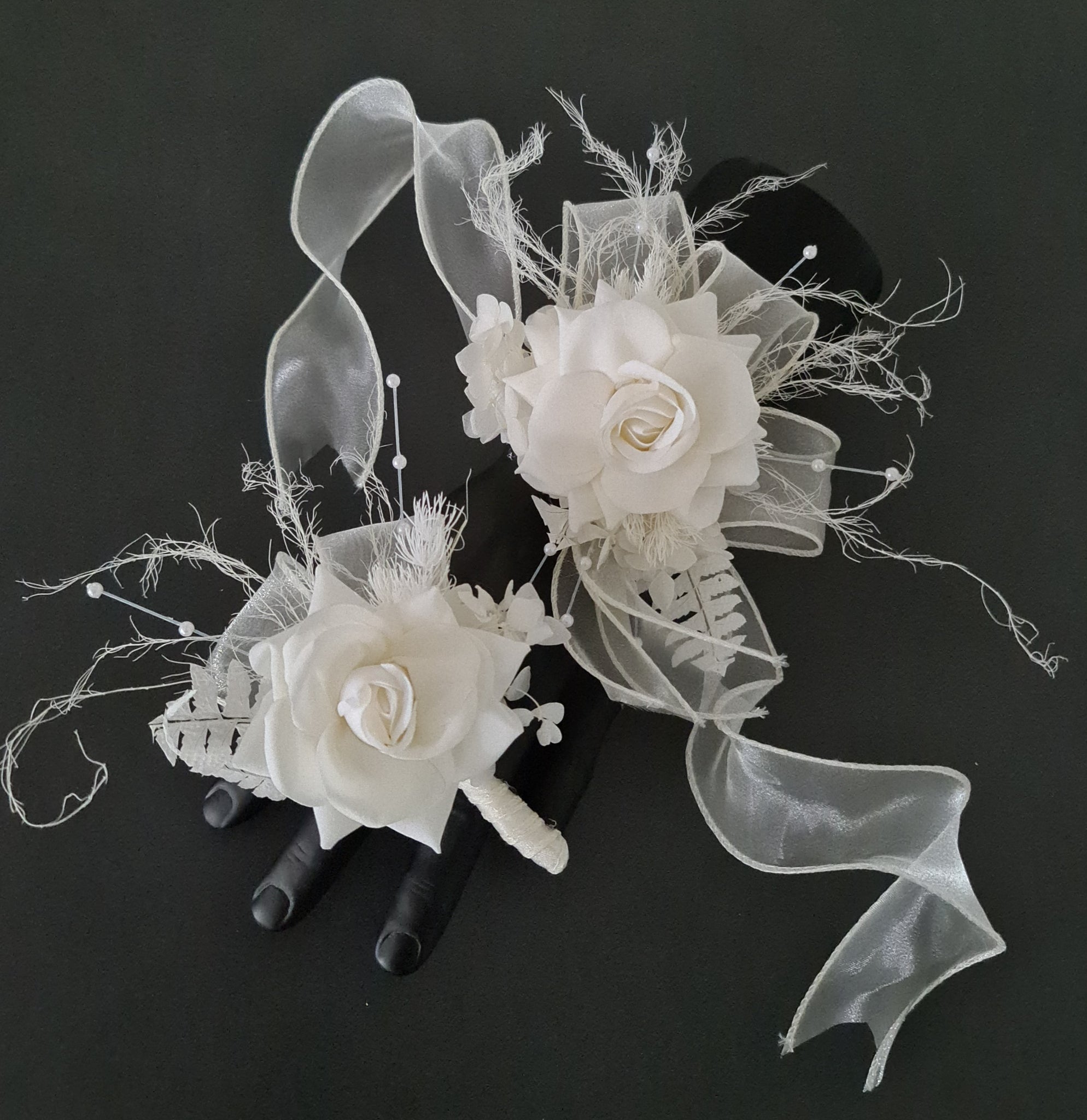Sassy elegant white corsage & buttonhole set w pearls - School formal, prom, graduation, wedding