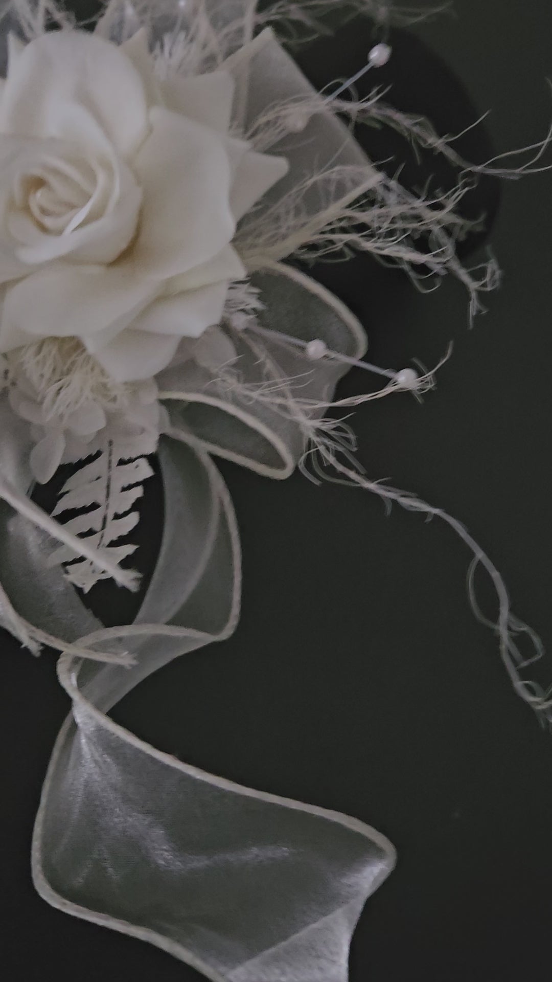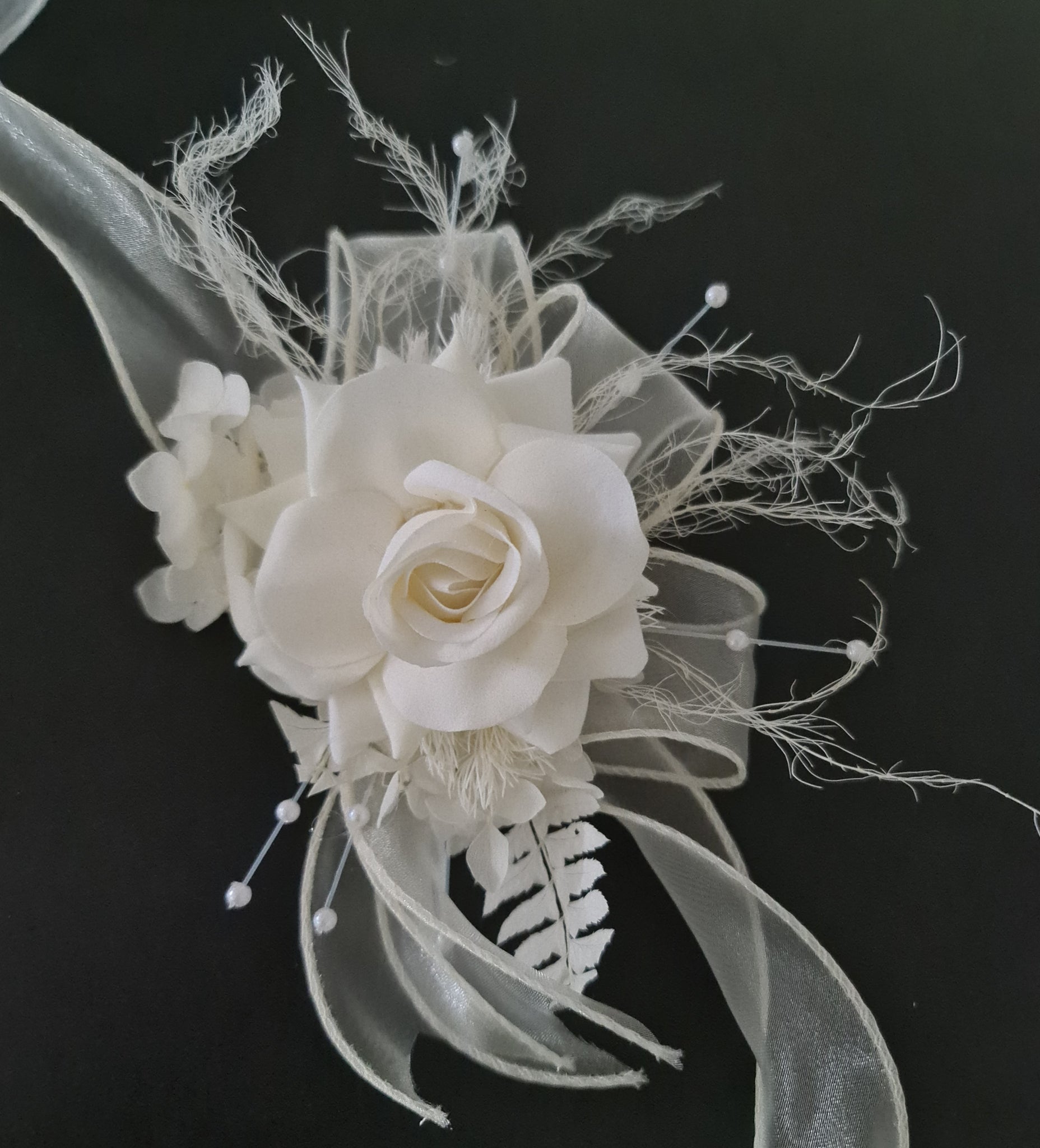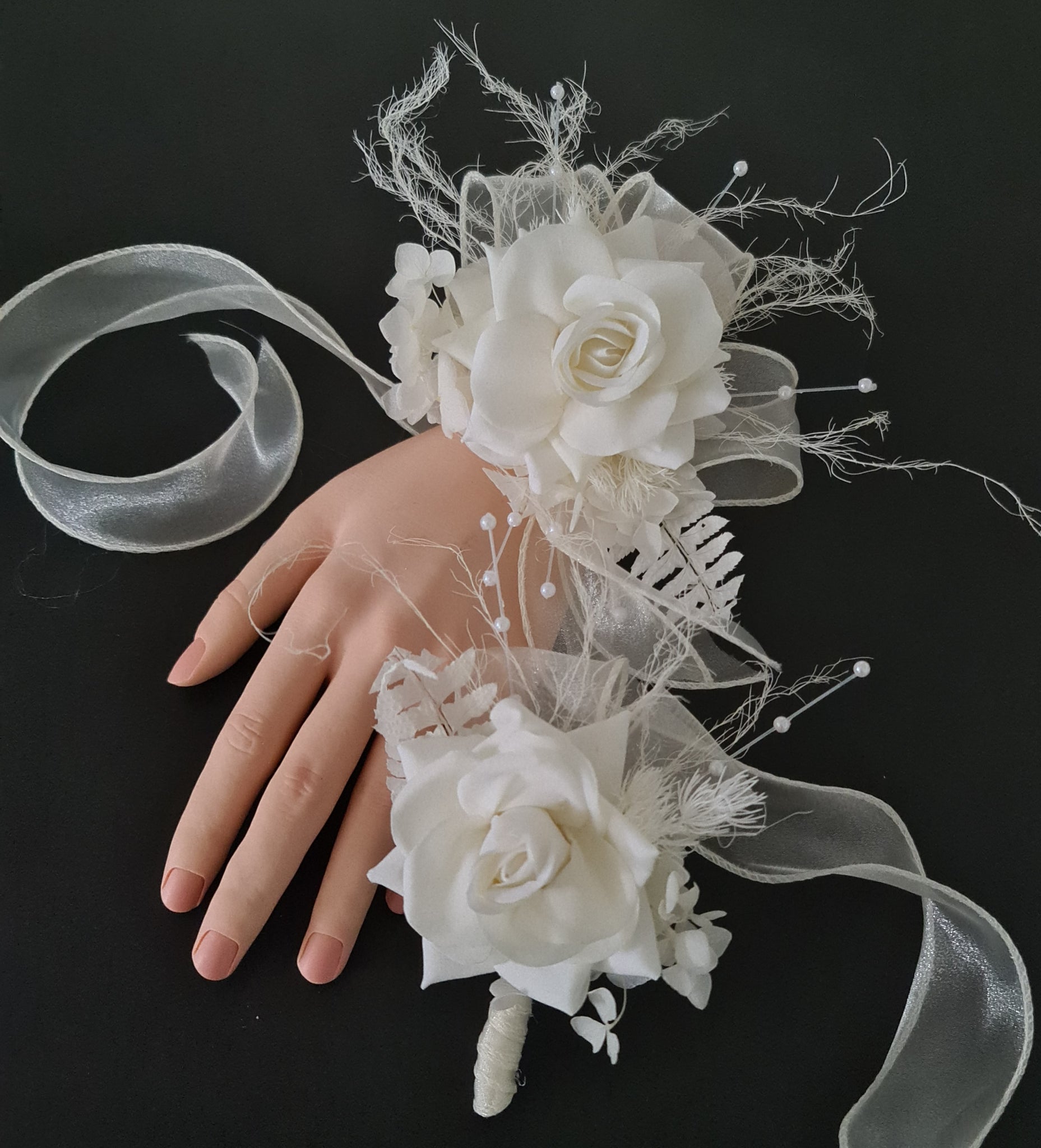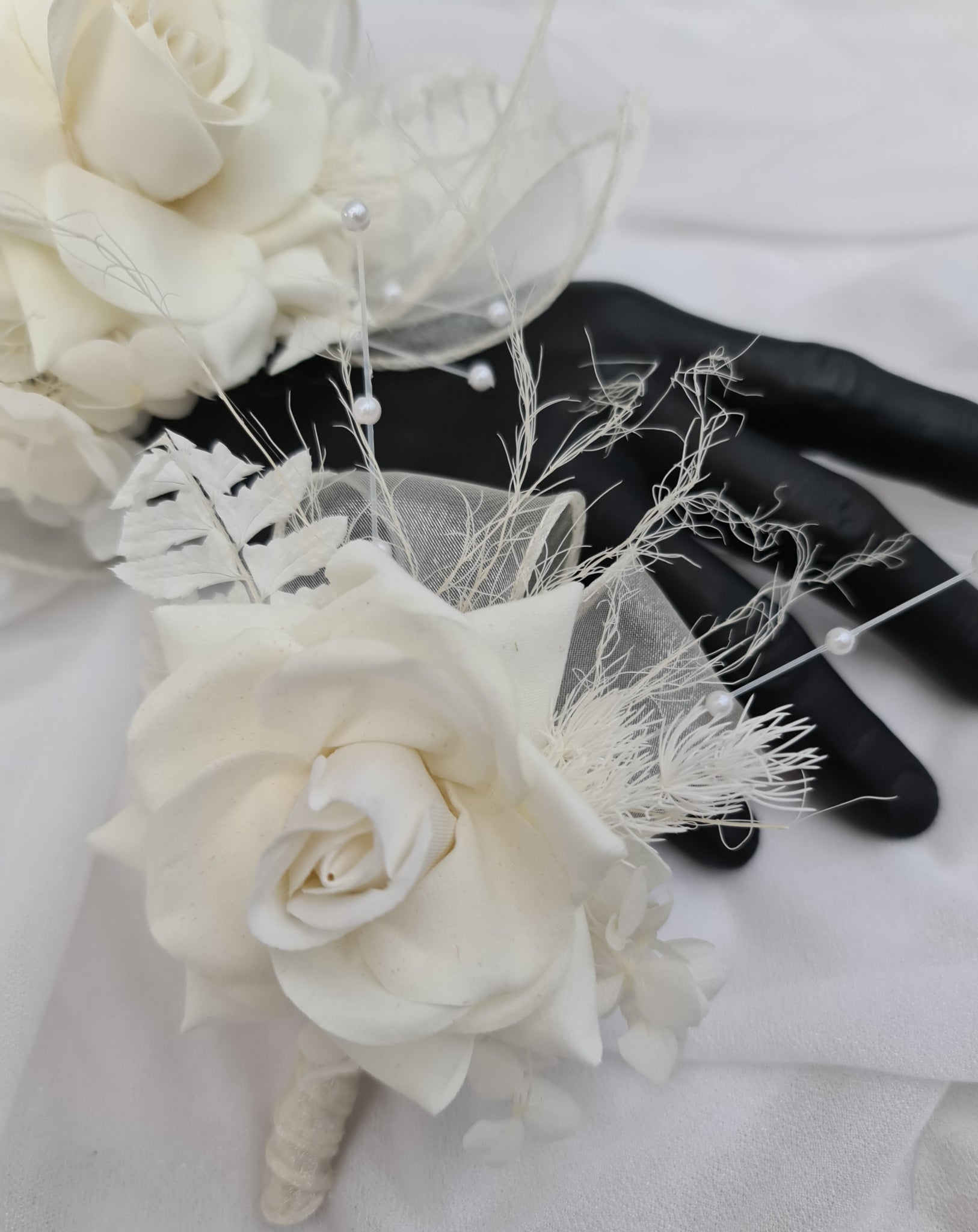 White corsage & buttonhole set with preserved flowers, velvet milky white rose and pearls