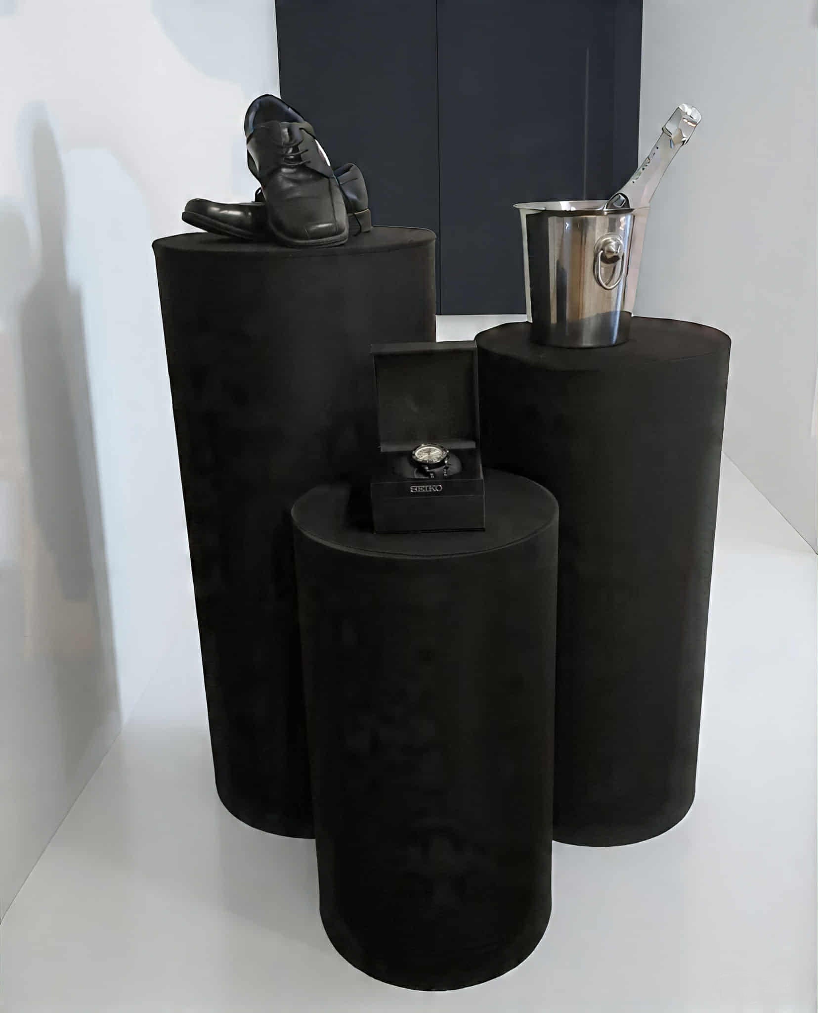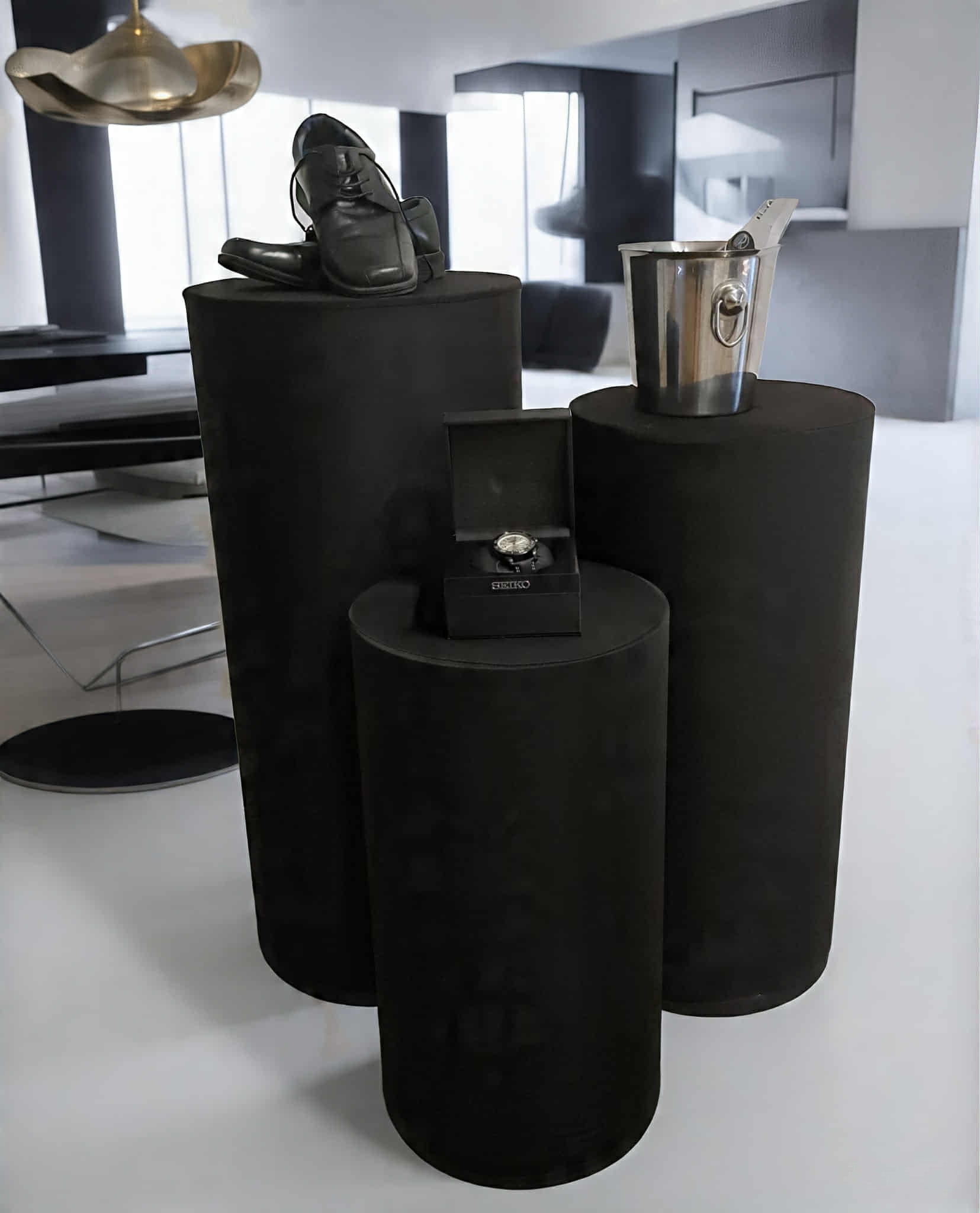 Set of 3 Black Cylinder Plinths – Grooms Preparation Room