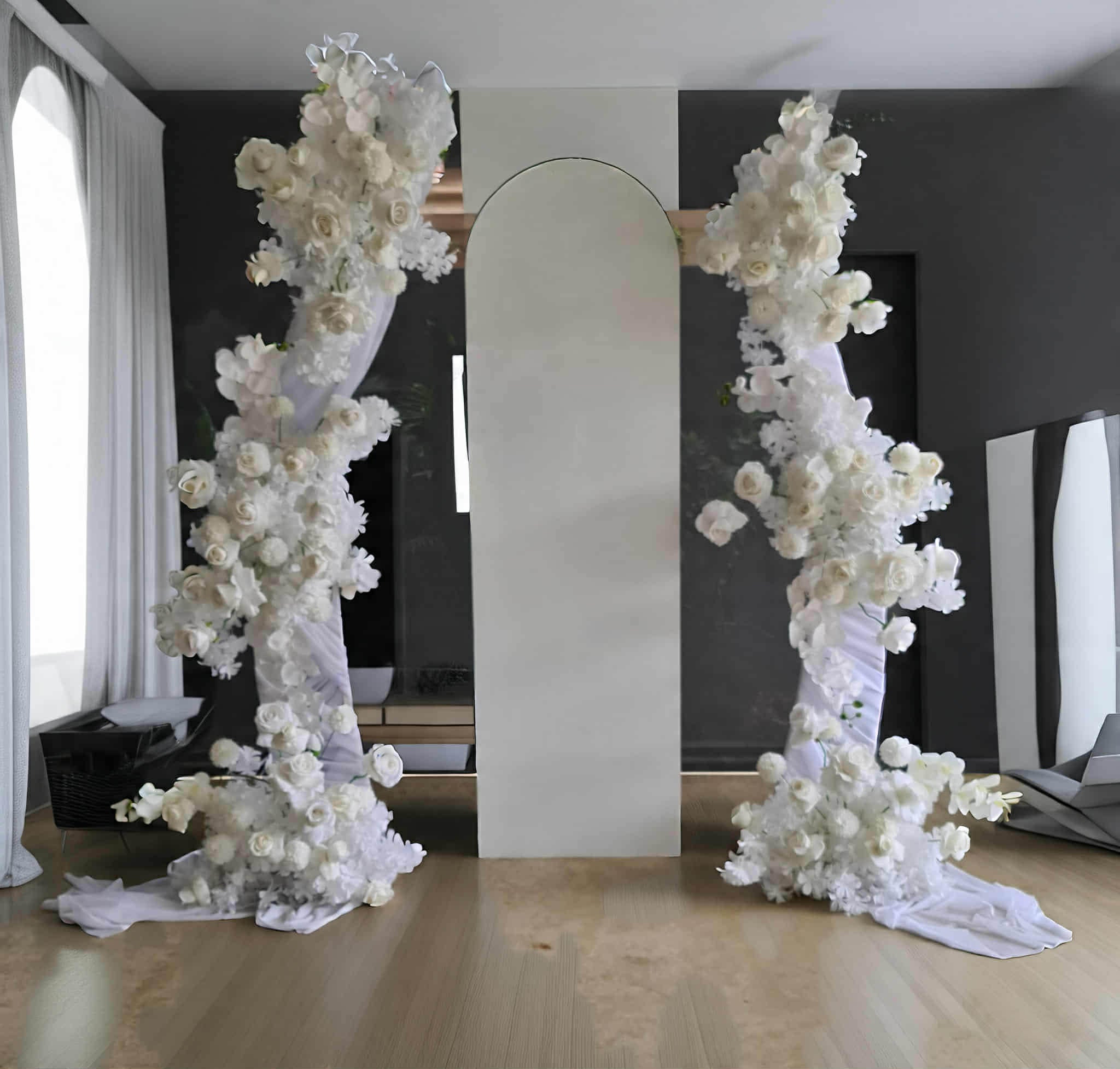 Enhance your event space with this set of tree white curved arch backdrops, featuring a striking 175cm tall arch and a grand 200cm tall arch. Each arch is supported by a stable base measuring 40cm long and 25cm wide. Easy to assemble with screws, these arches provide a stunning and versatile backdrop for any occasion, perfect for creating memorable photo opportunities or elegant decor.