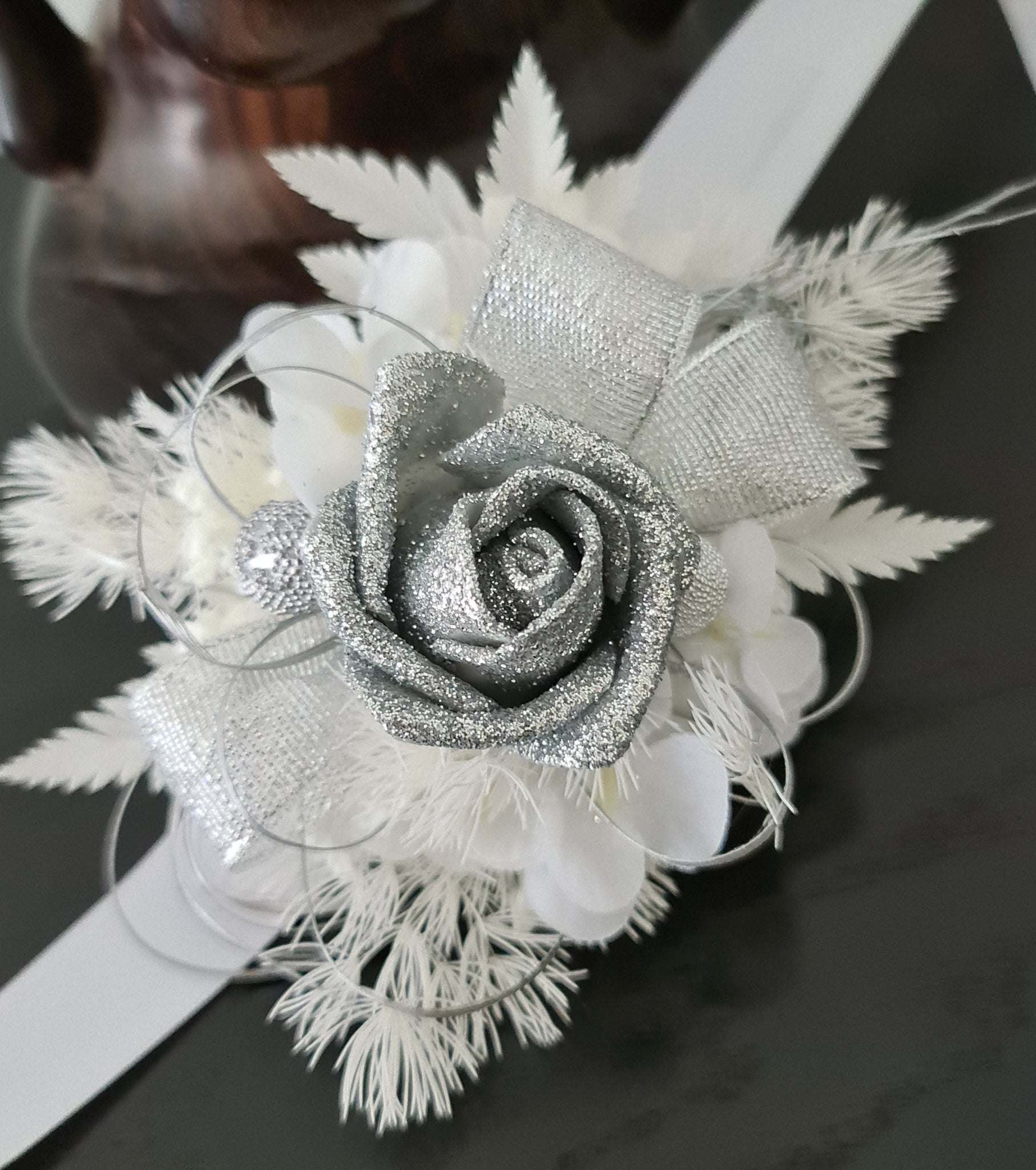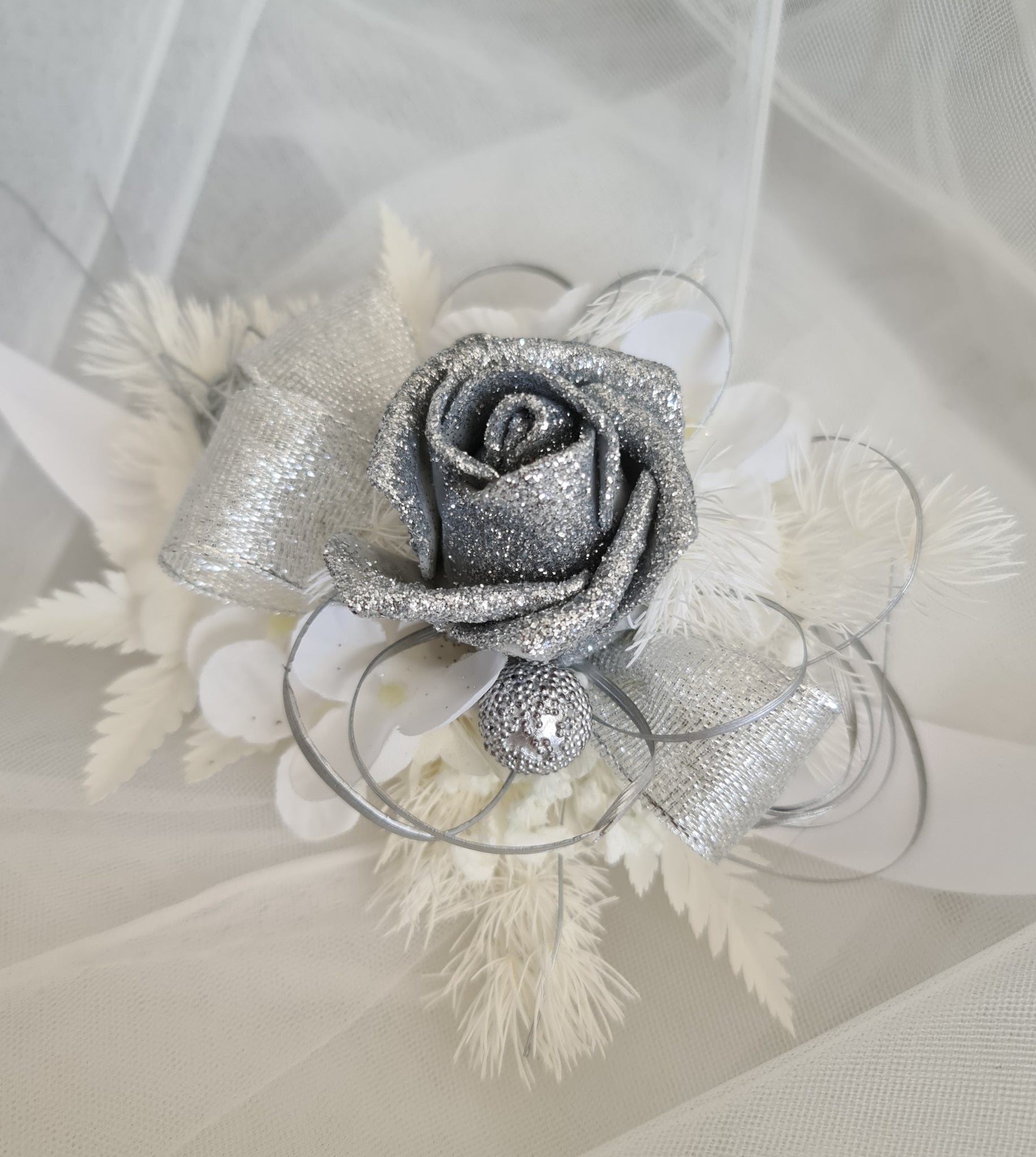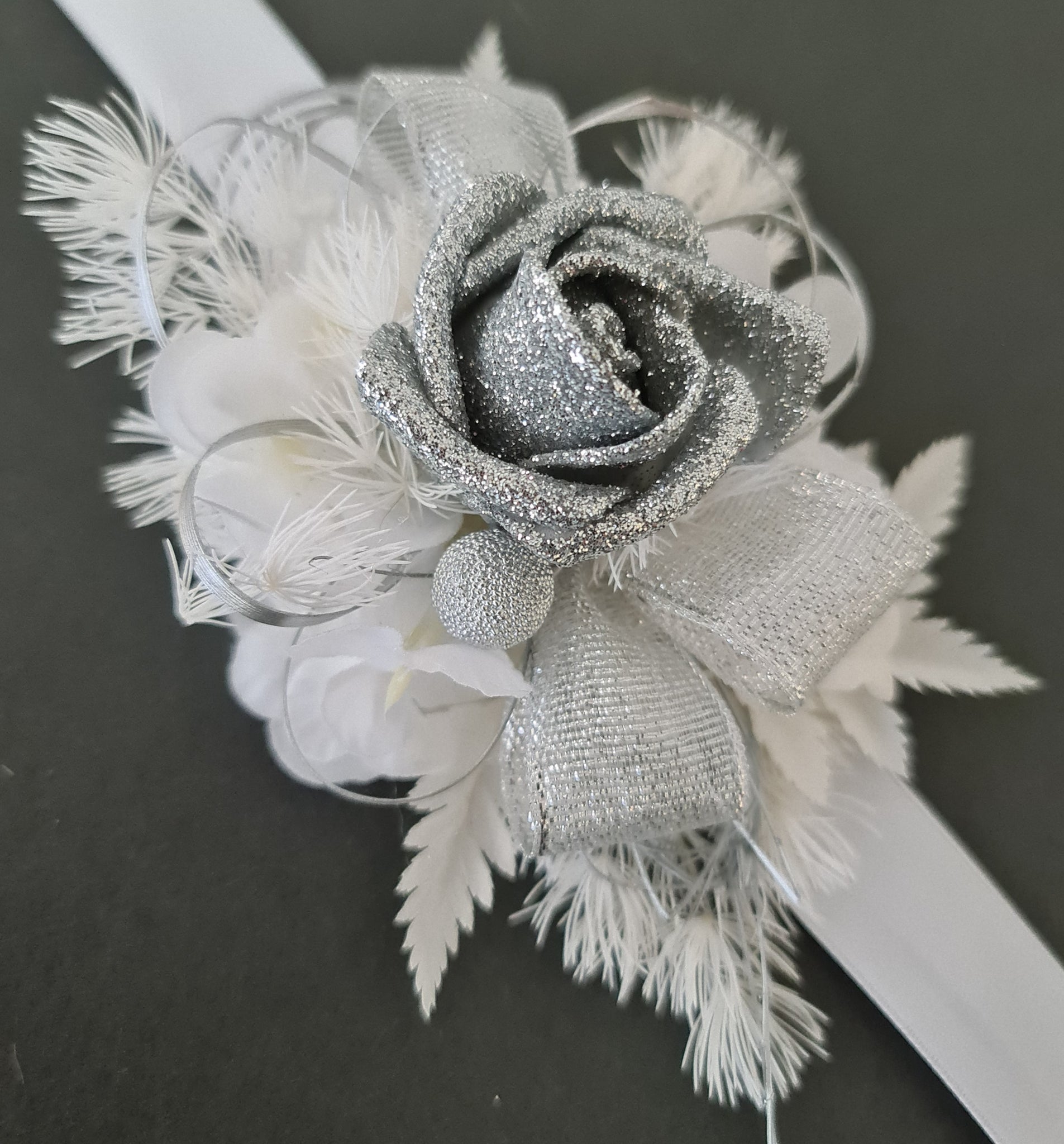 Unique white & silver corsage. Combination of preserved flowers with silver glitter rose