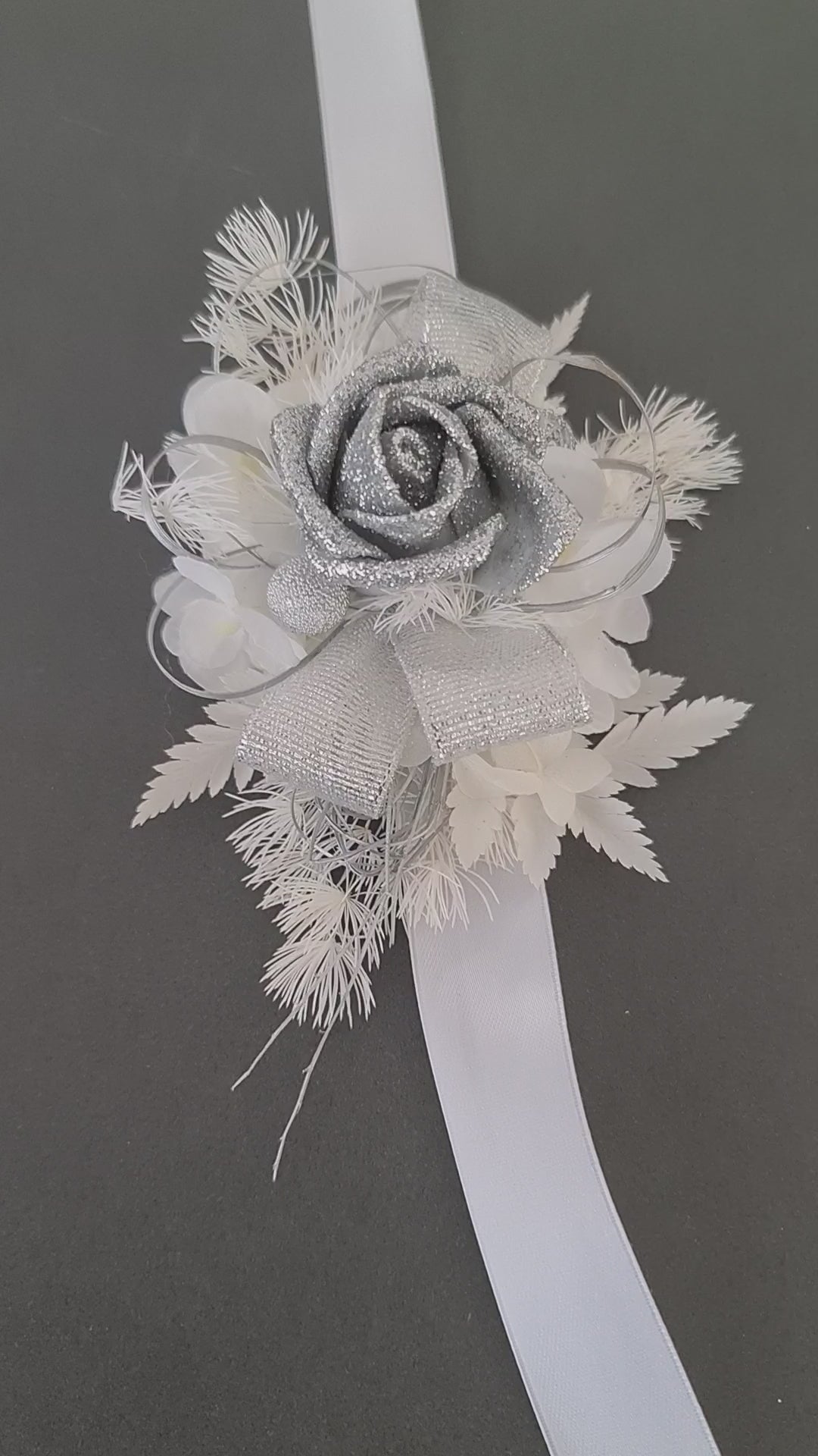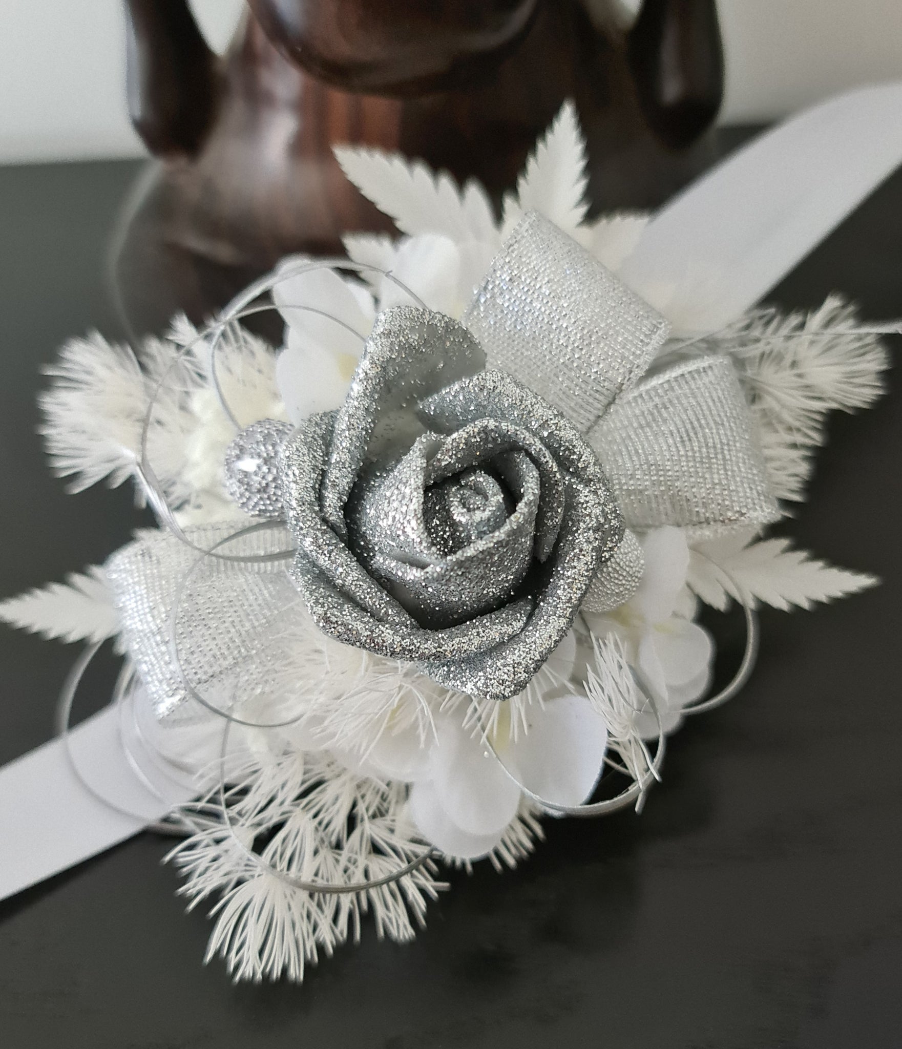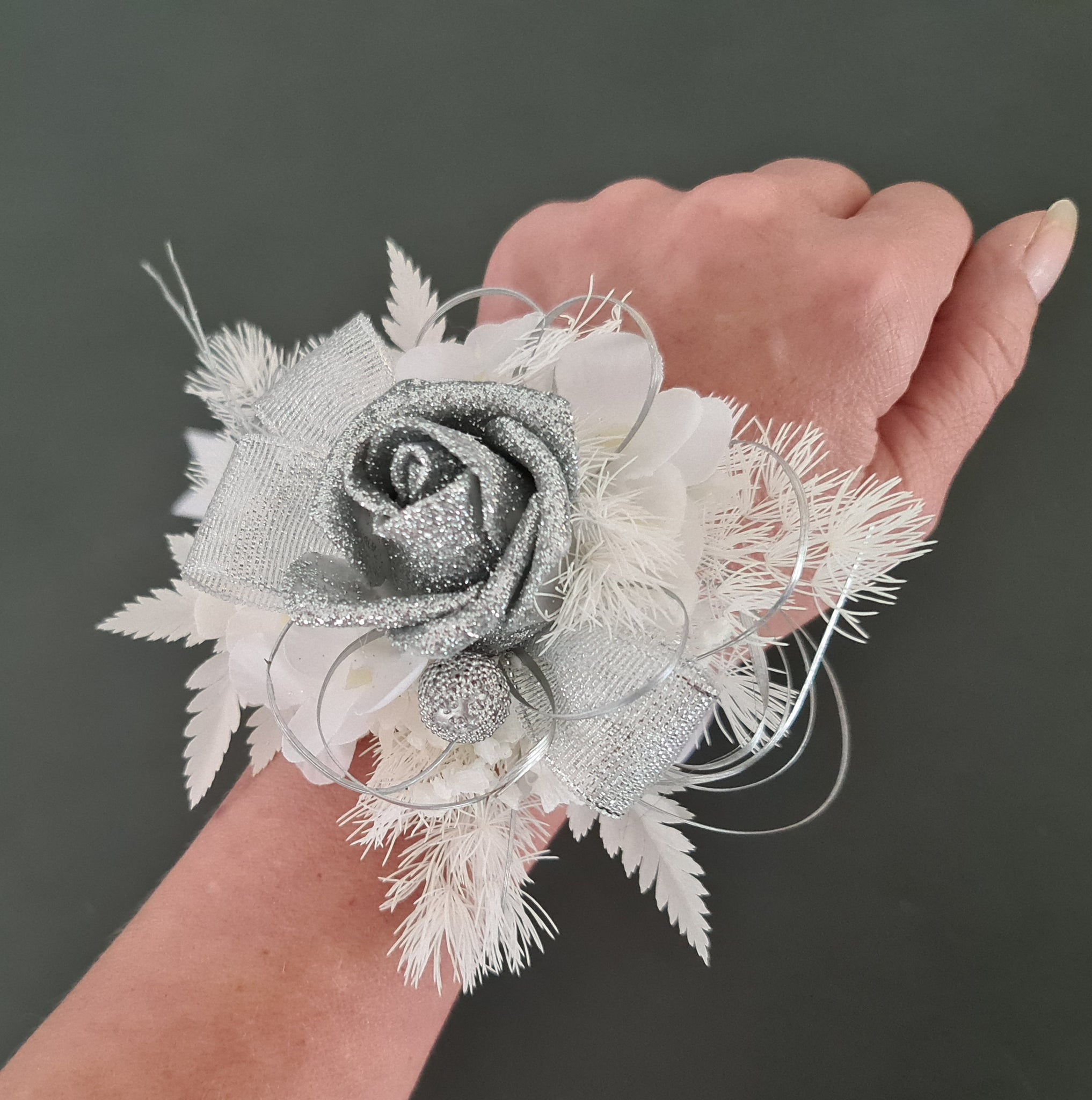 Unique white & silver corsage. Combination of preserved flowers with silver glitter rose