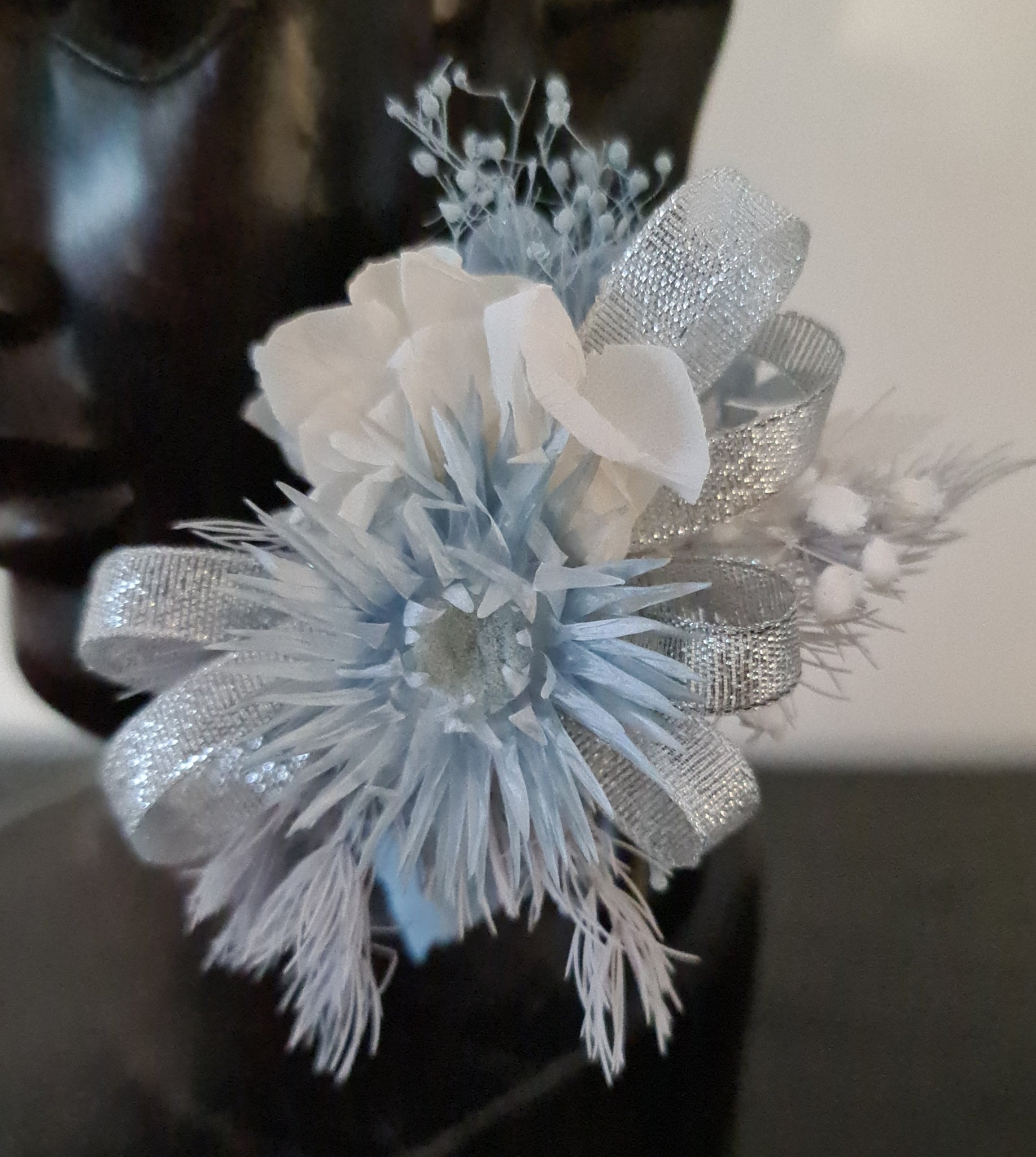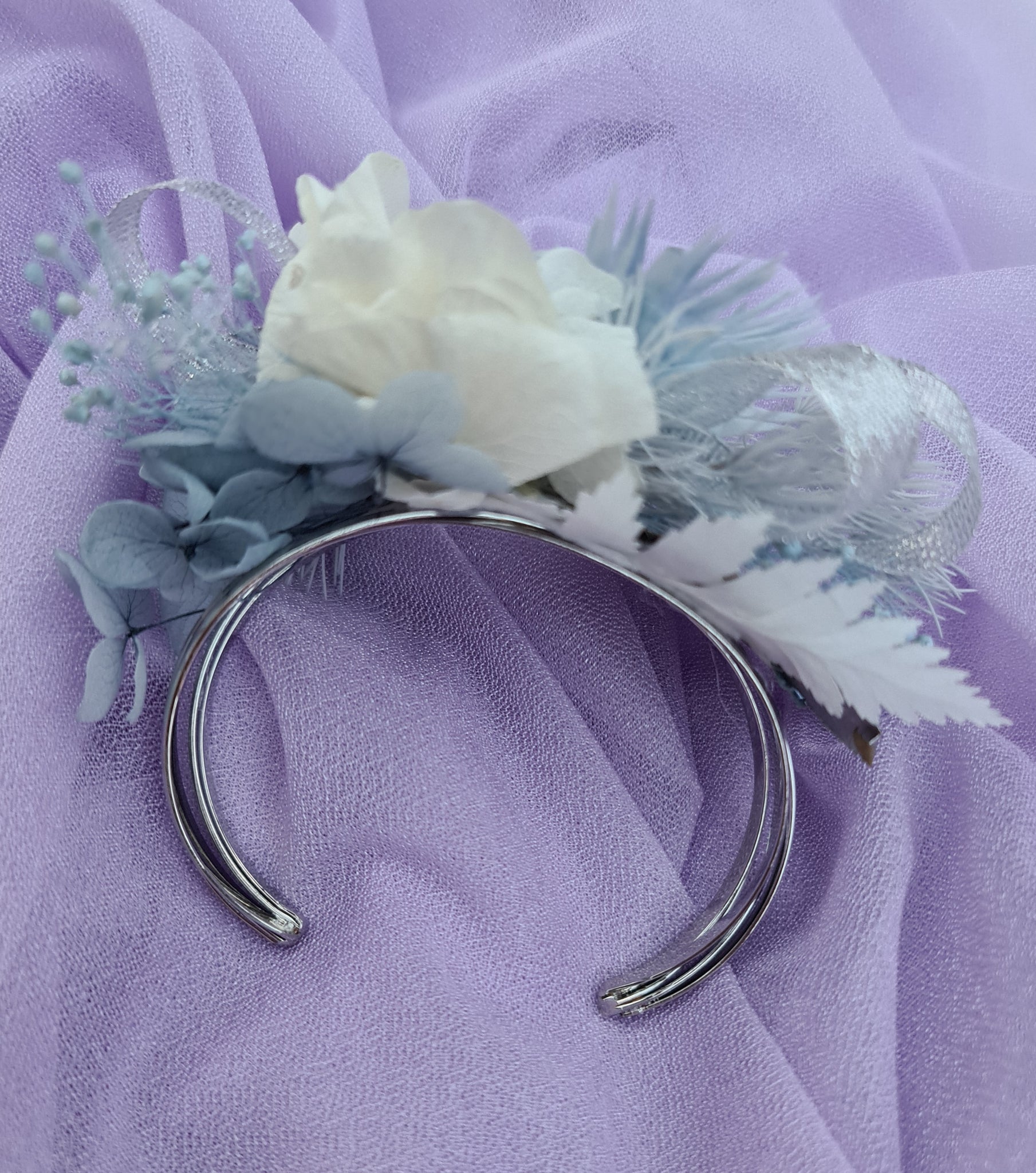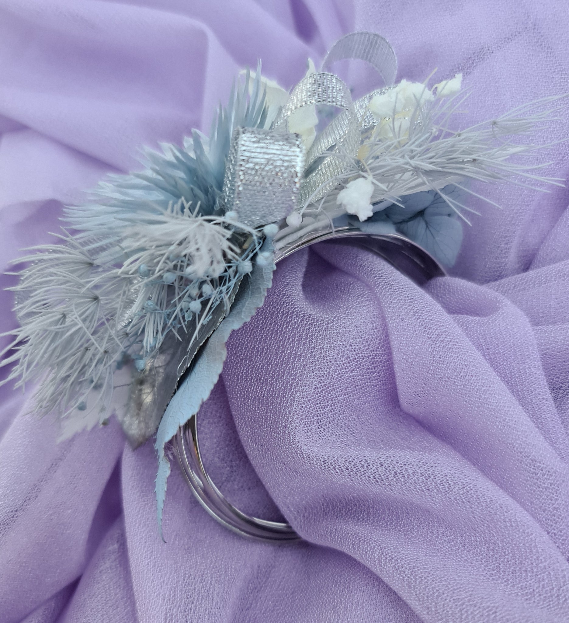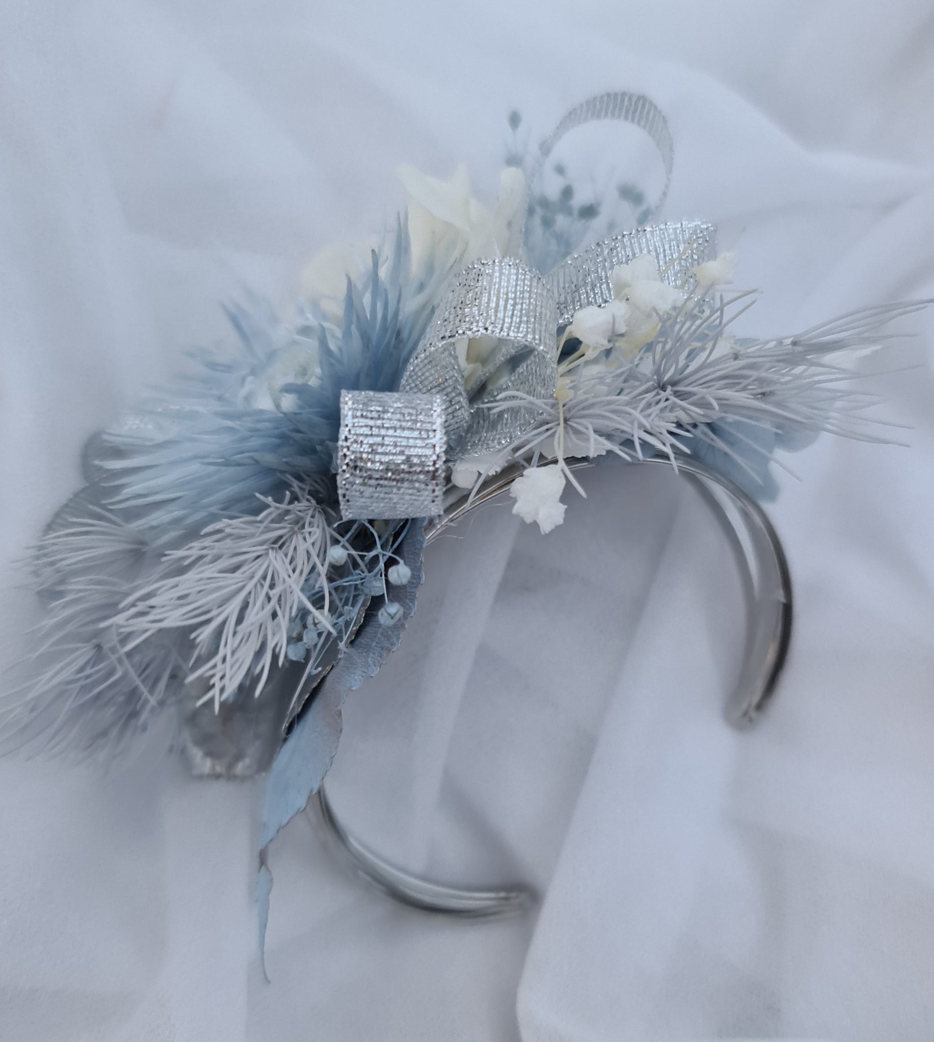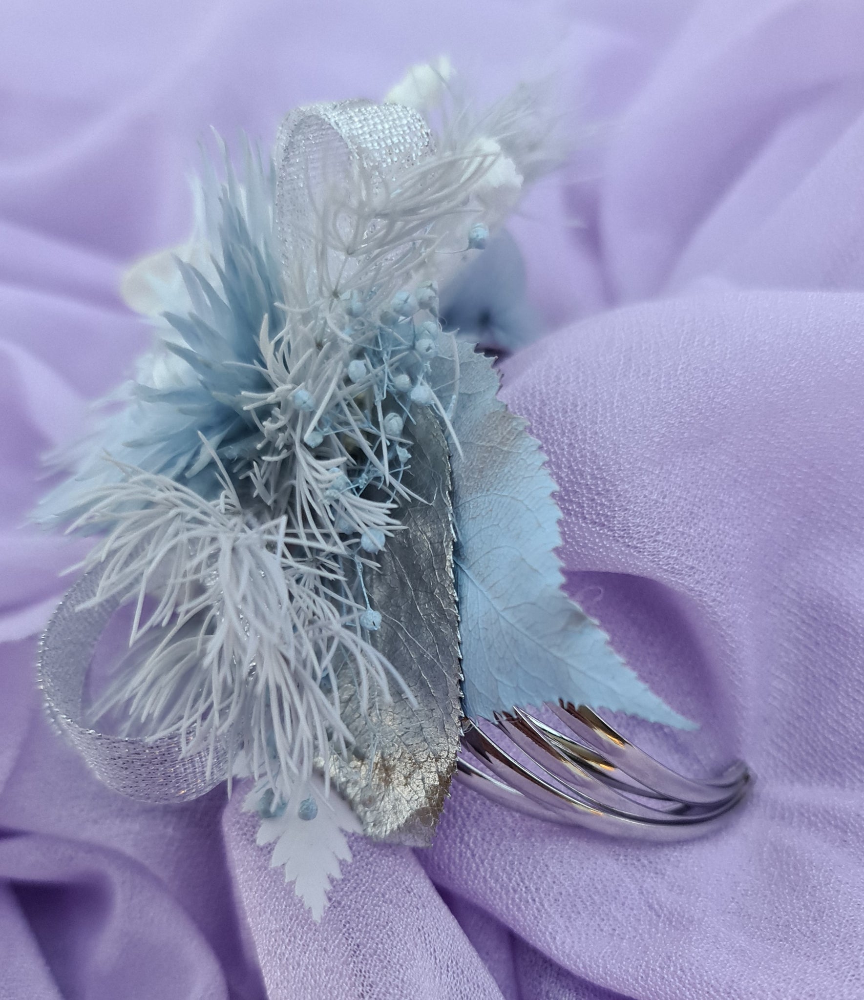 Preserved flowers in soft blue and neutral white tones with silver ribbons