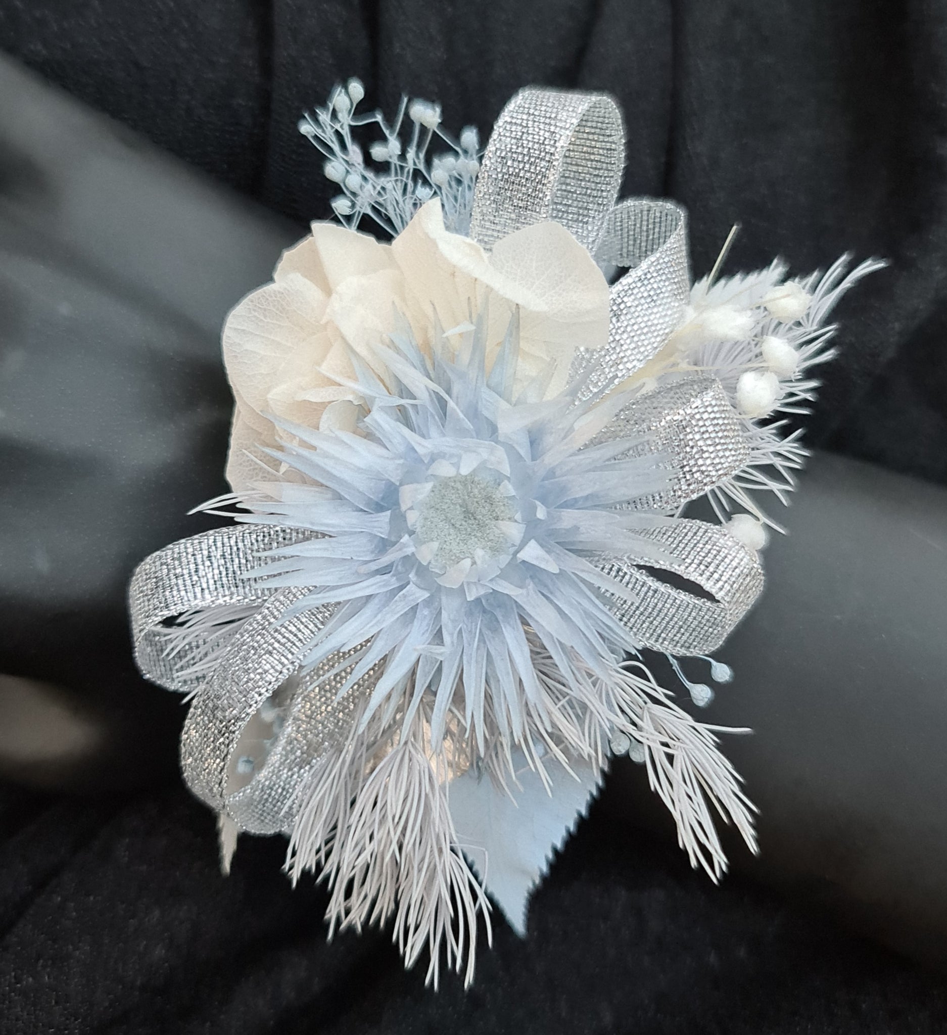Soft blue & neutral preserved flowers silver bangle corsage – school formal / prom