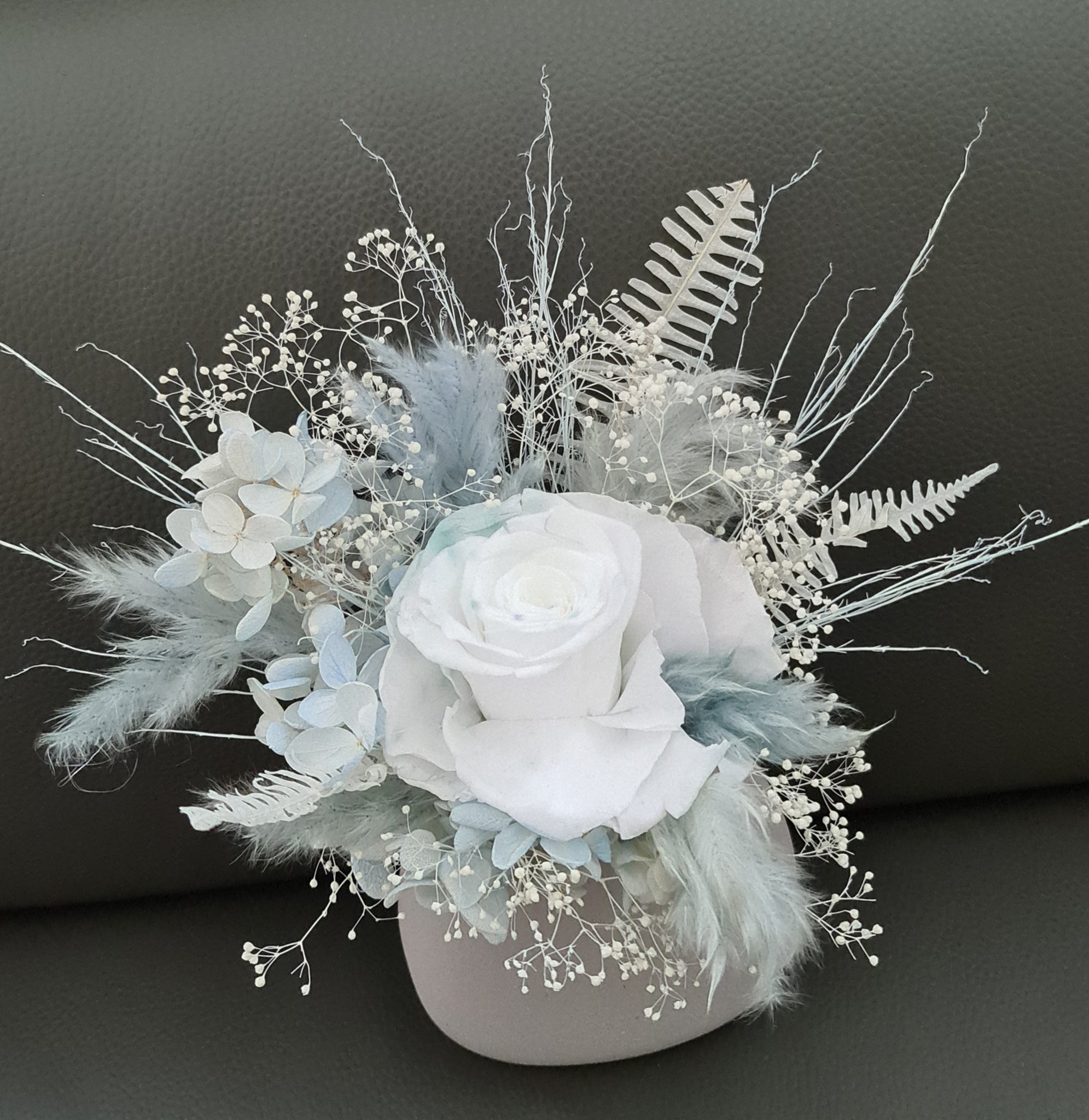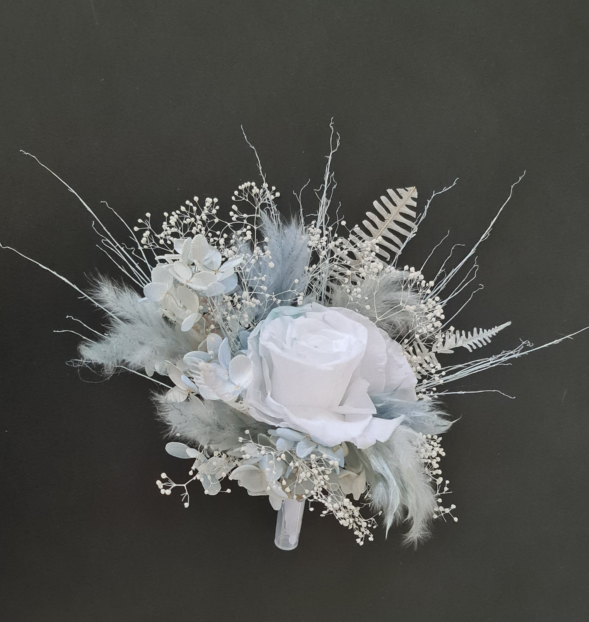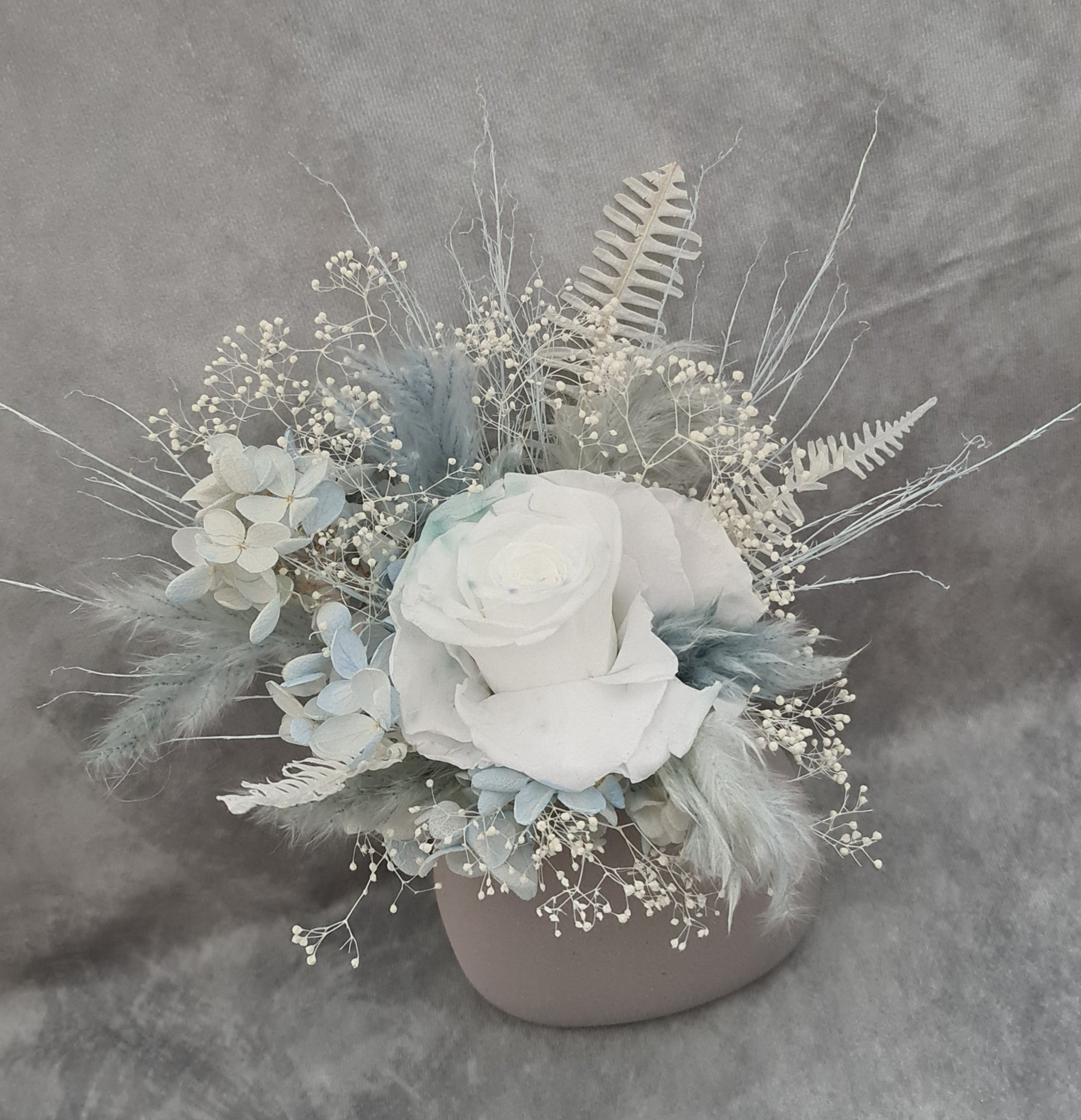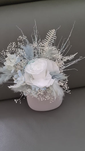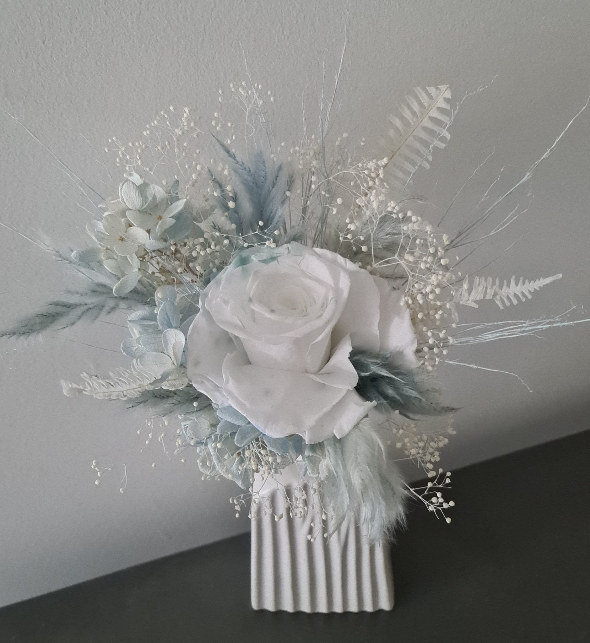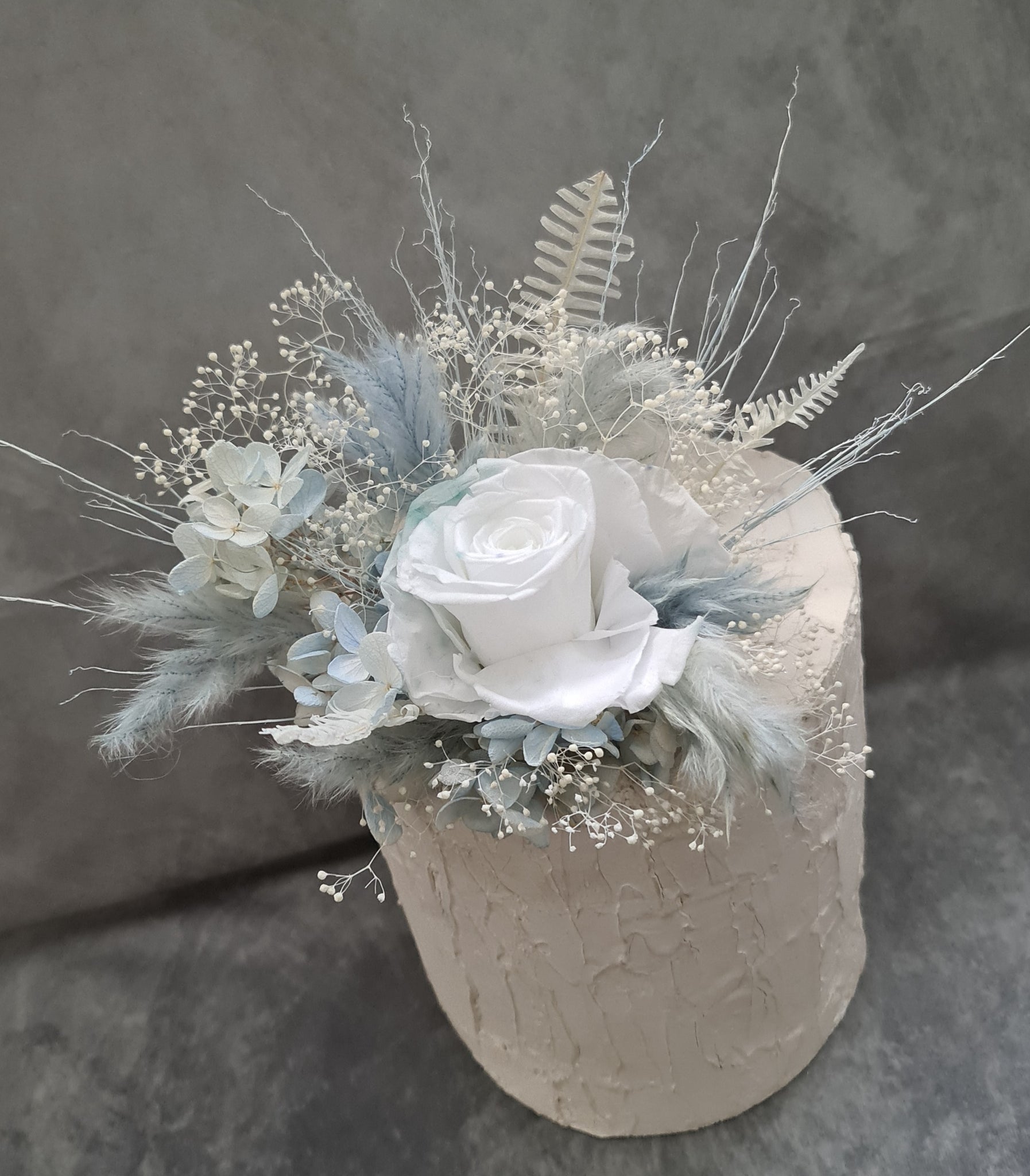 Preserved flower cake topper in soft blue & white colours with white/blue preserved rose.